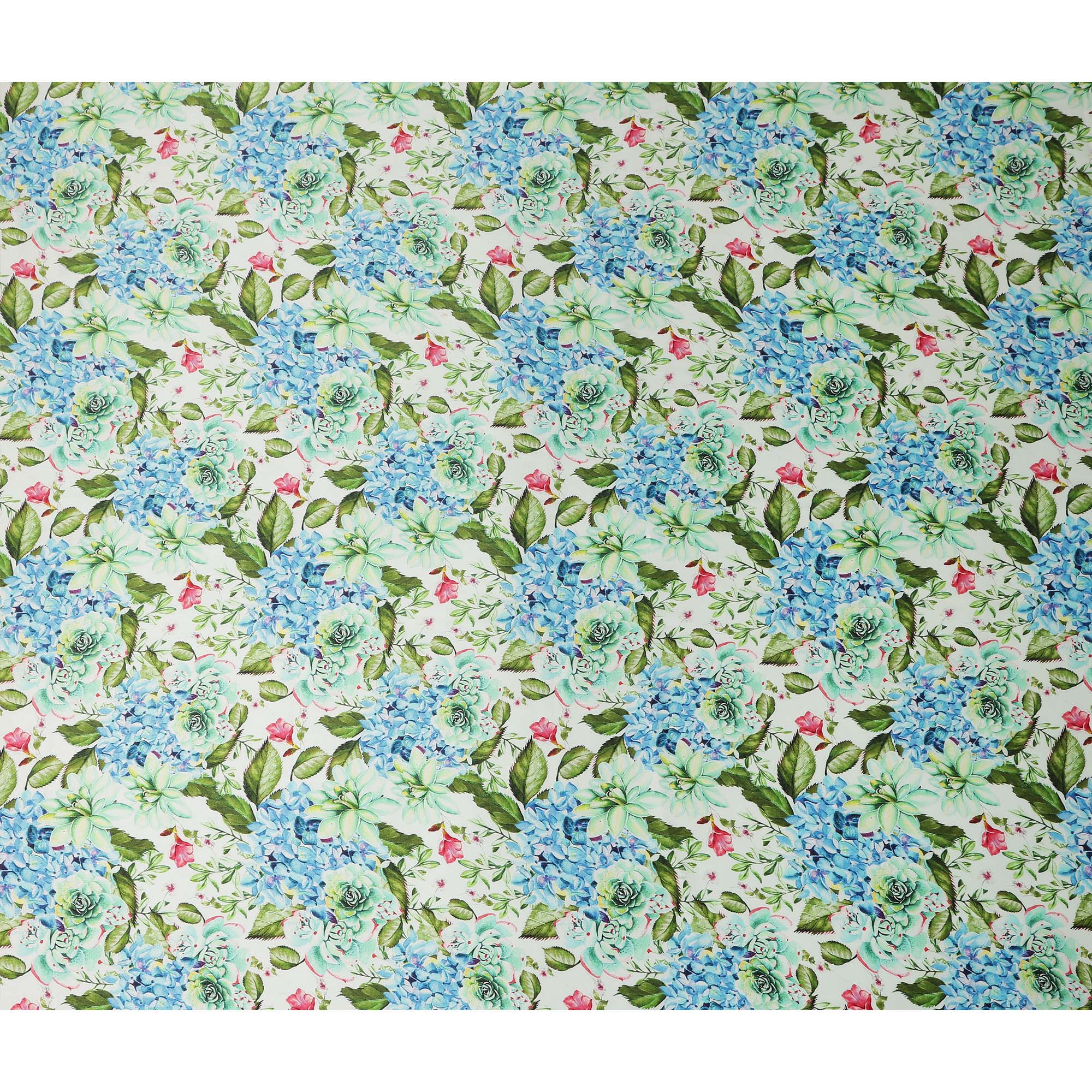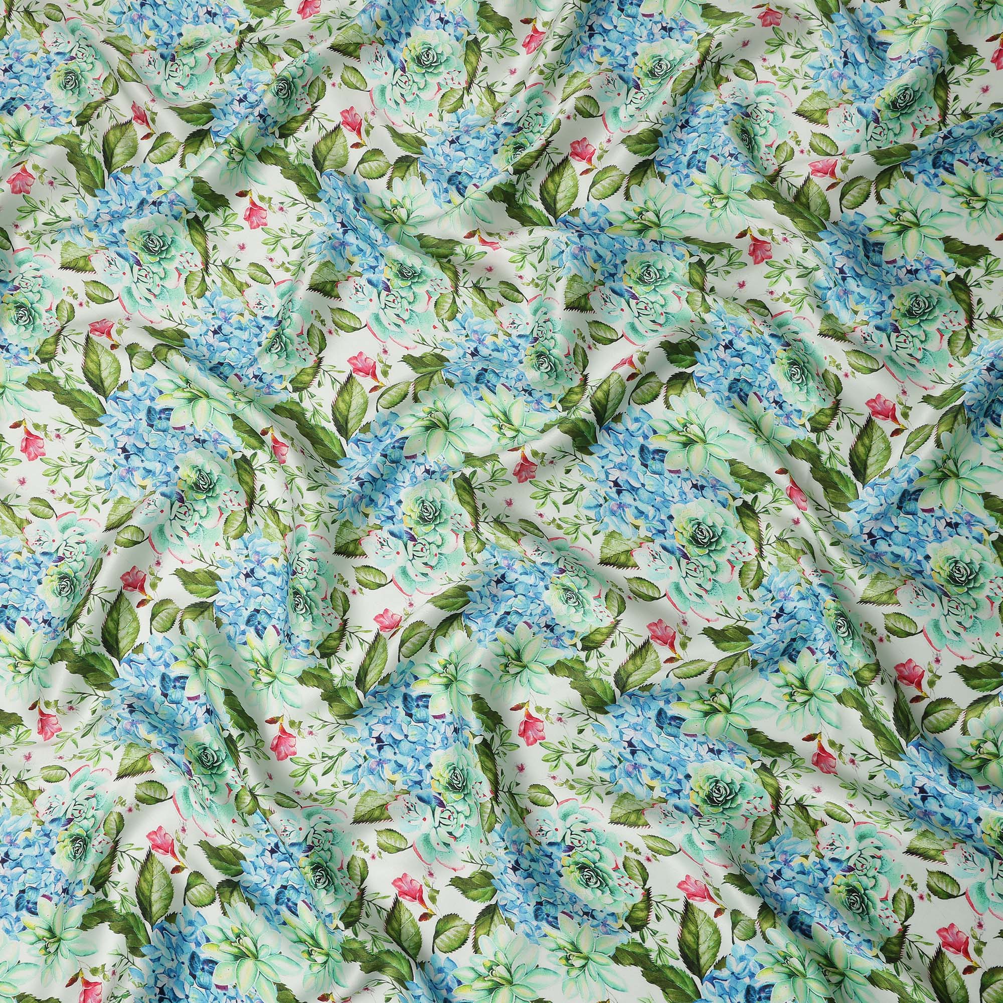 This white floral printed premium pure silk satin fabric showcases an exquisite blend of blue hydrangea inspired blossoms, soft green succulents, and delicate leafy accents gracefully arranged over a fresh white base. The vibrant yet soothing color palette creates a refined botanical aesthetic that feels both elegant and contemporary. Crafted from premium pure silk satin, the fabric offers a luxuriously smooth texture with a natural glossy sheen that enhances its rich appearance. Lightweight and breathable, it drapes effortlessly, creating a fluid silhouette ideal for gowns, dresses, blouses, sarees, and designer ensembles. With a width of 110 cms, it provides versatile flexibility for creative tailoring and couture collections. Perfect for festive occasions, special events, and sophisticated everyday fashion, this fabric beautifully combines natural elegance, luminous shine, and exceptional comfort.