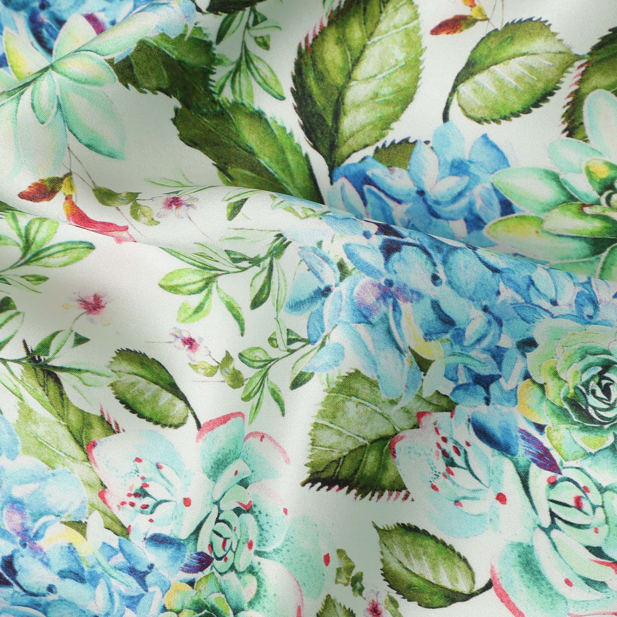 White Floral Printed Premium Pure Silk Satin Fabric Blue And Green Blossom Botanical Design Luxury Soft Dress Material 110 Cms Width India-D28027