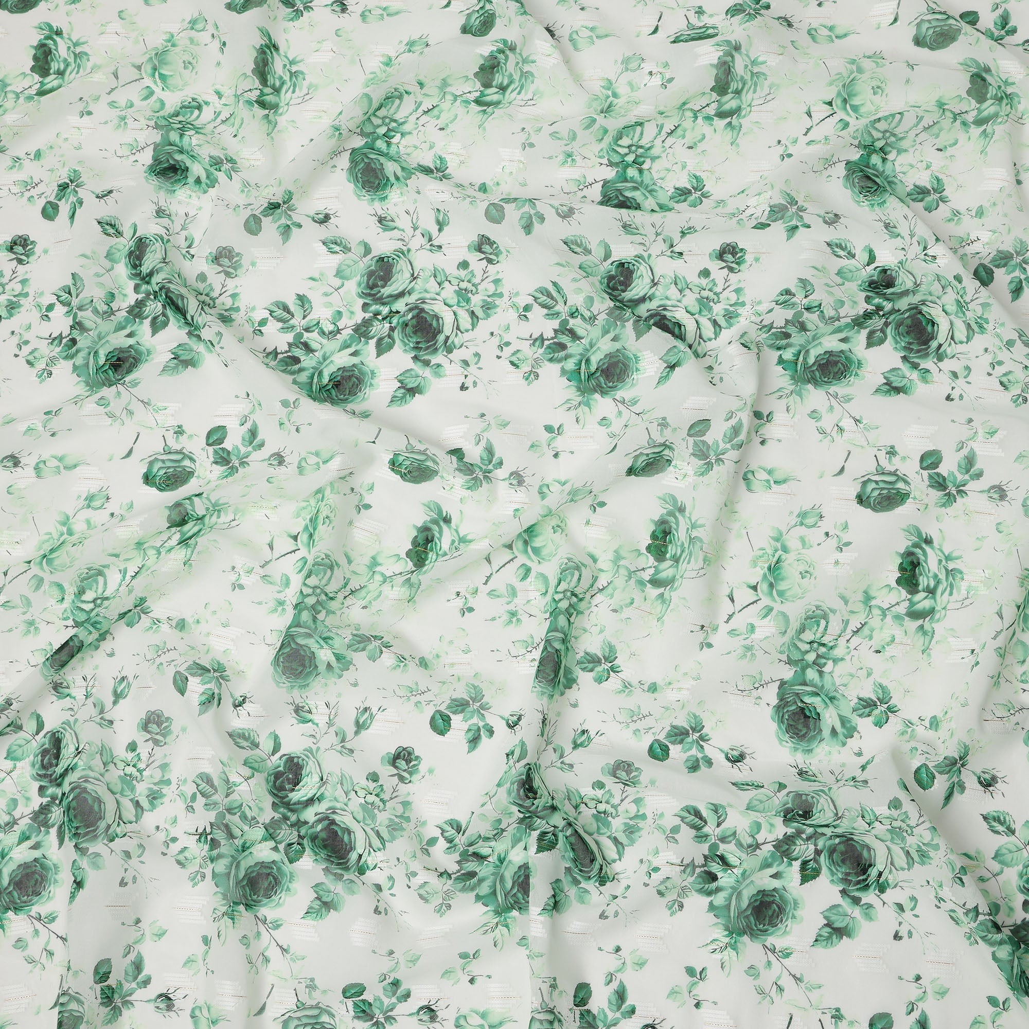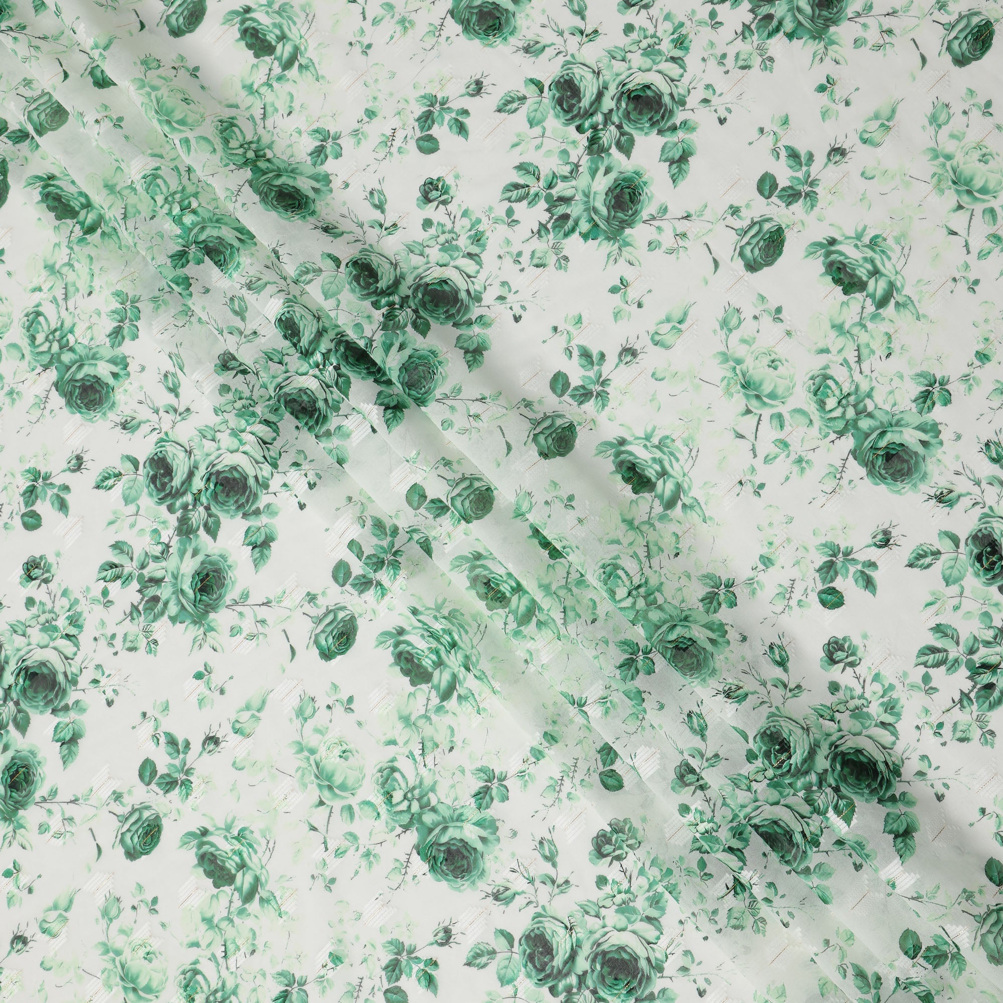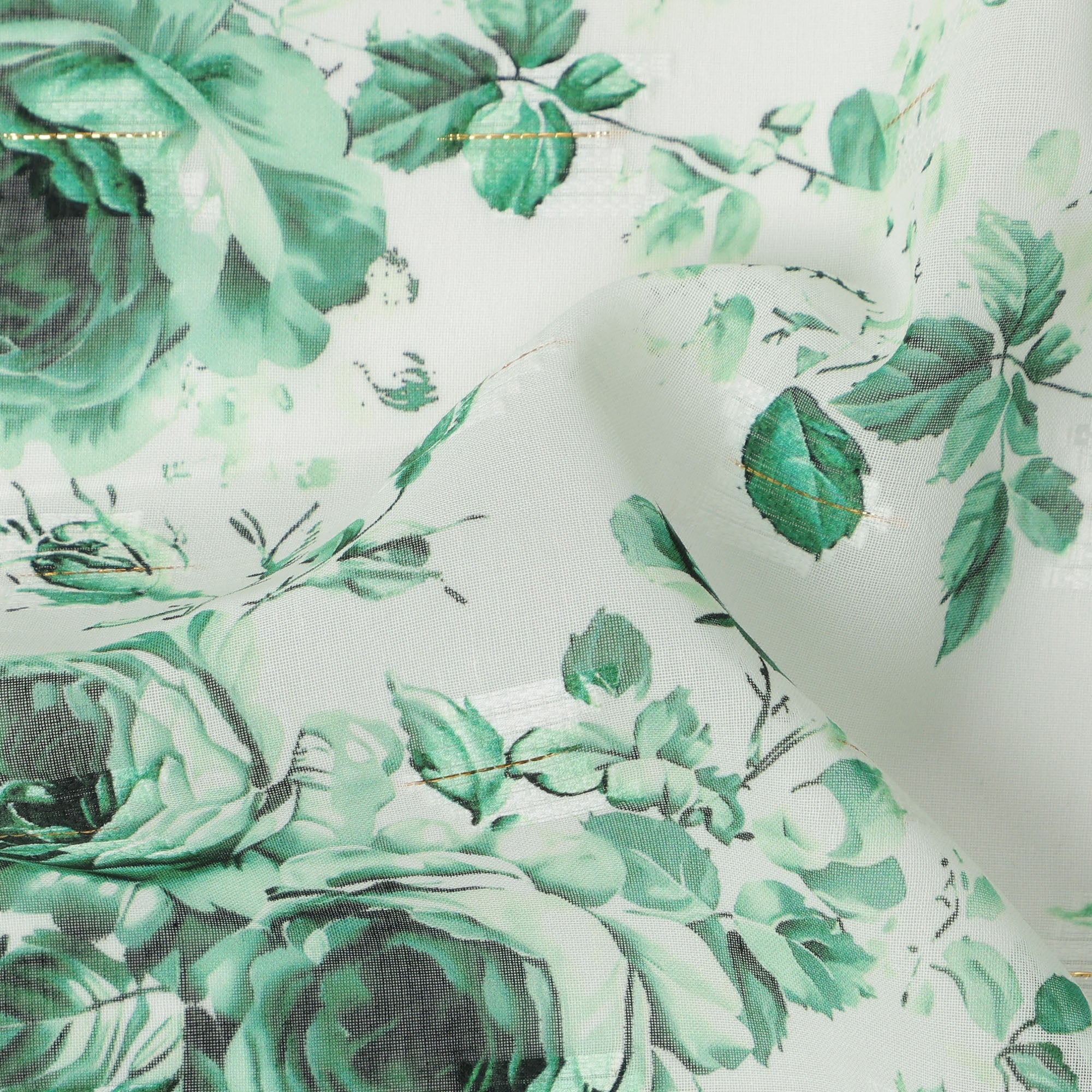 White Green Rose Print Cotton Voile Fabric with Watercolor Floral Detailing, 140 Cms Width, Made in India-D24323