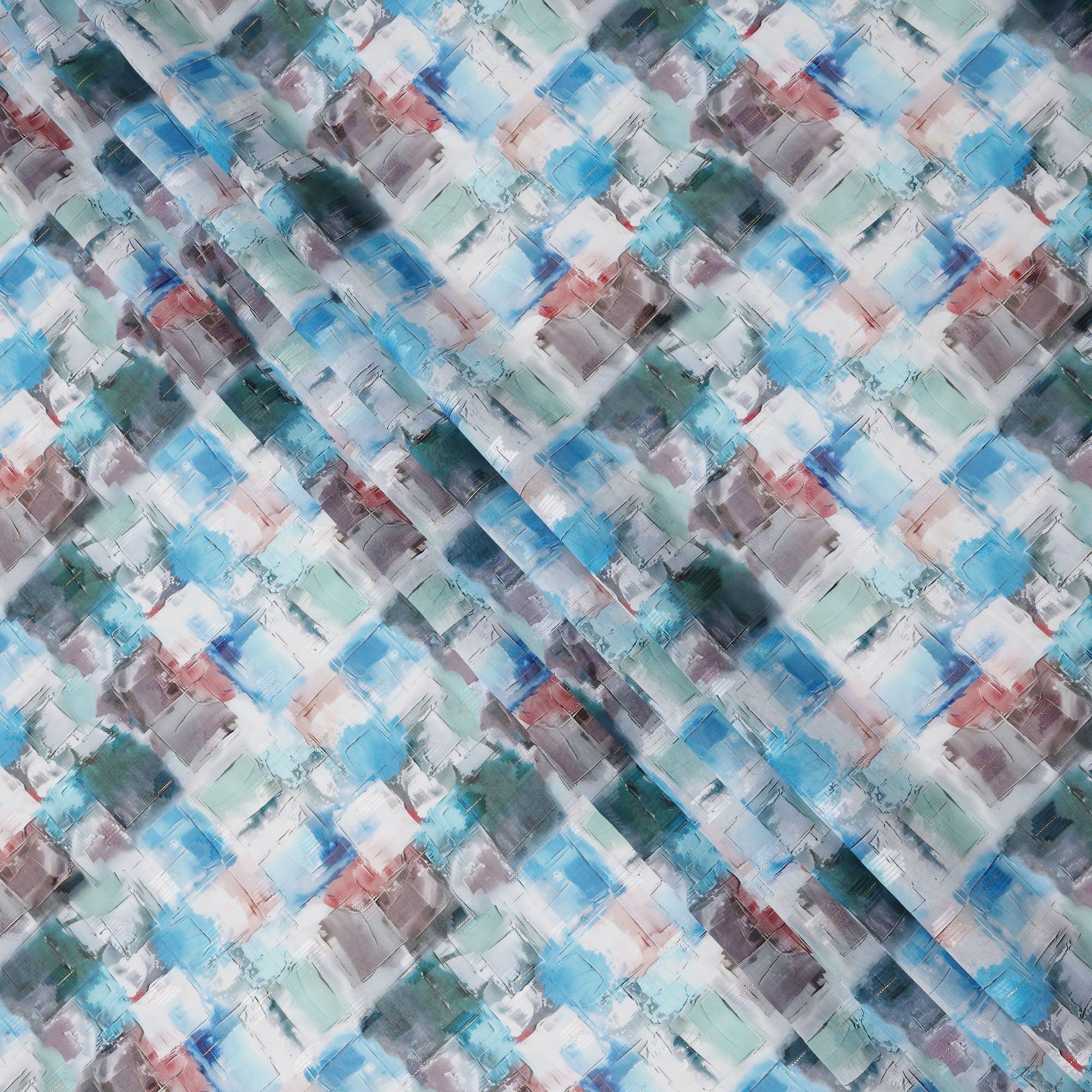 White base with abstract brushstroke print in blue, teal, grey, and brick red tones