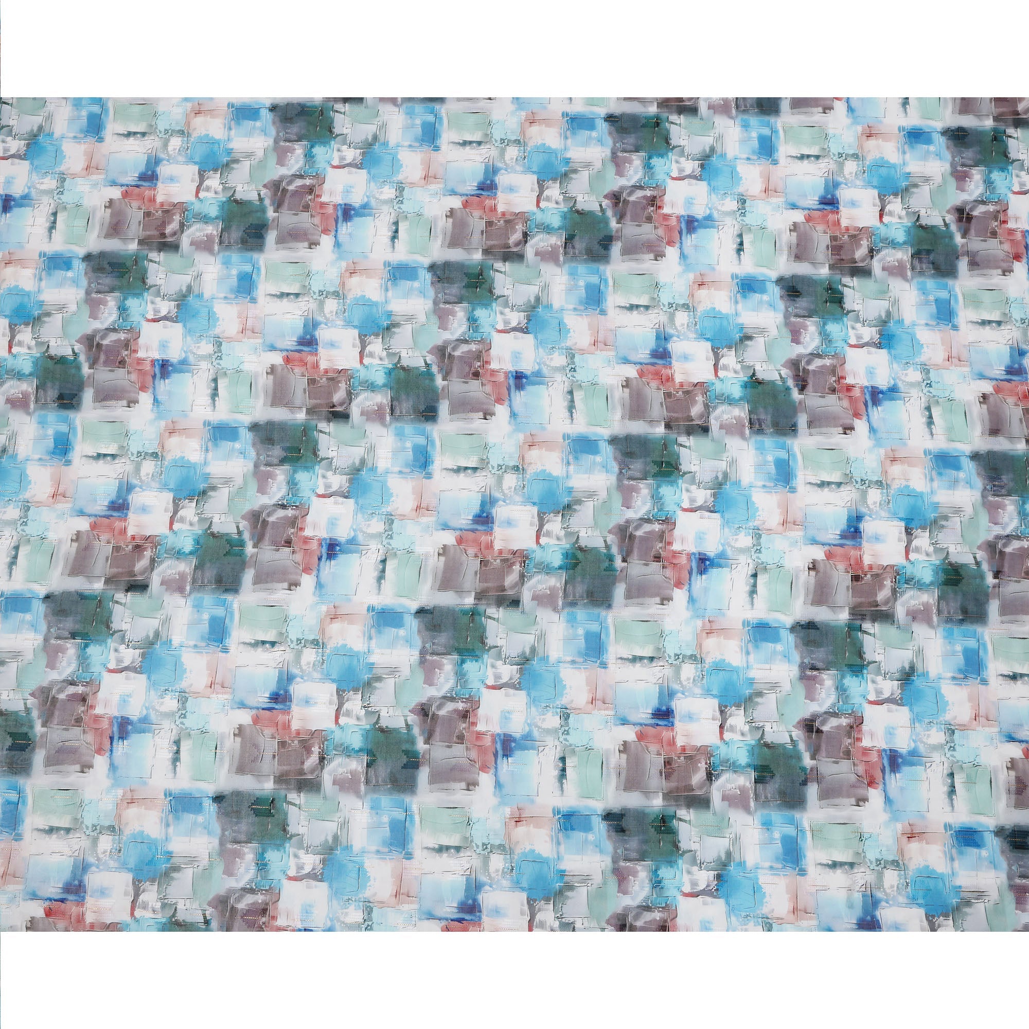 White Multicolor Abstract Brushstroke Print Cotton Voile Fabric with Blue, Teal, and Grey Accents, 140 Cms Width, Made in India-D24333