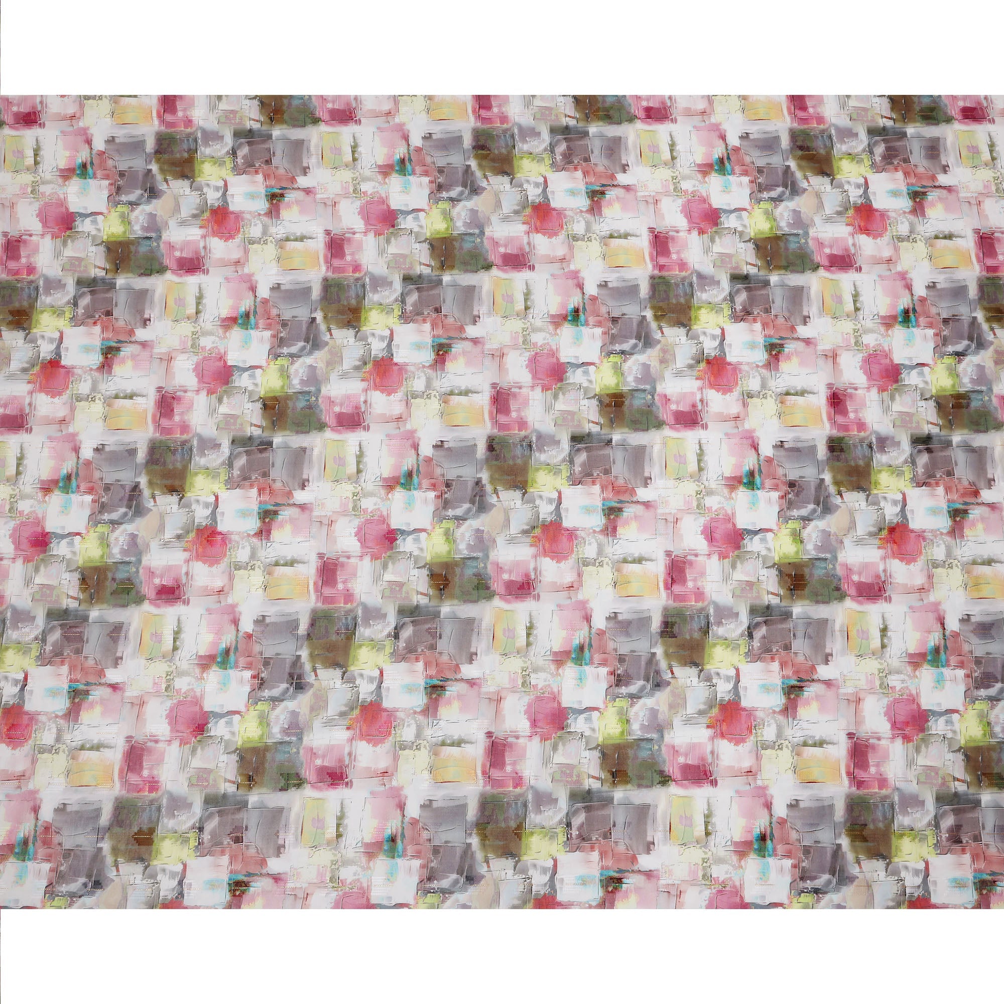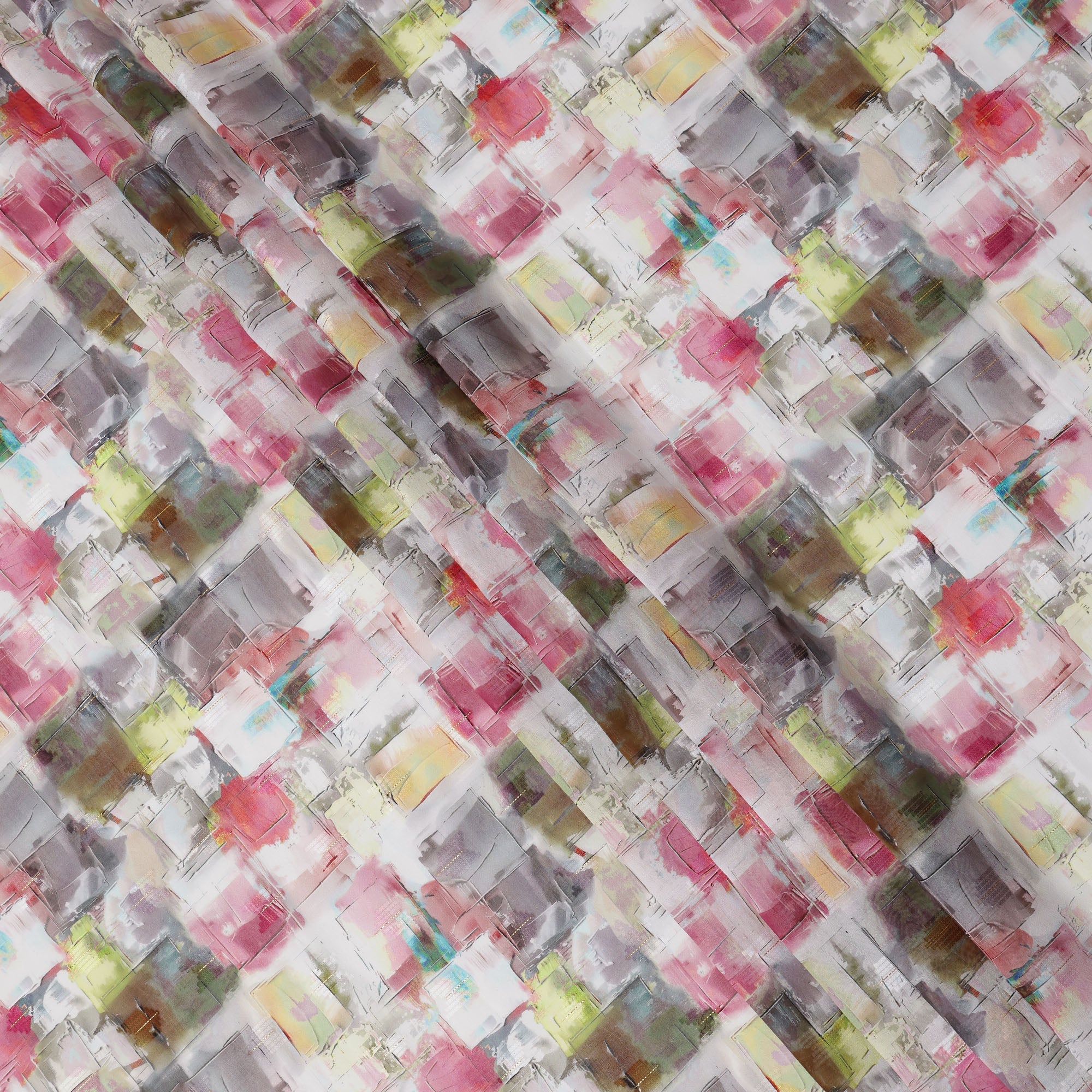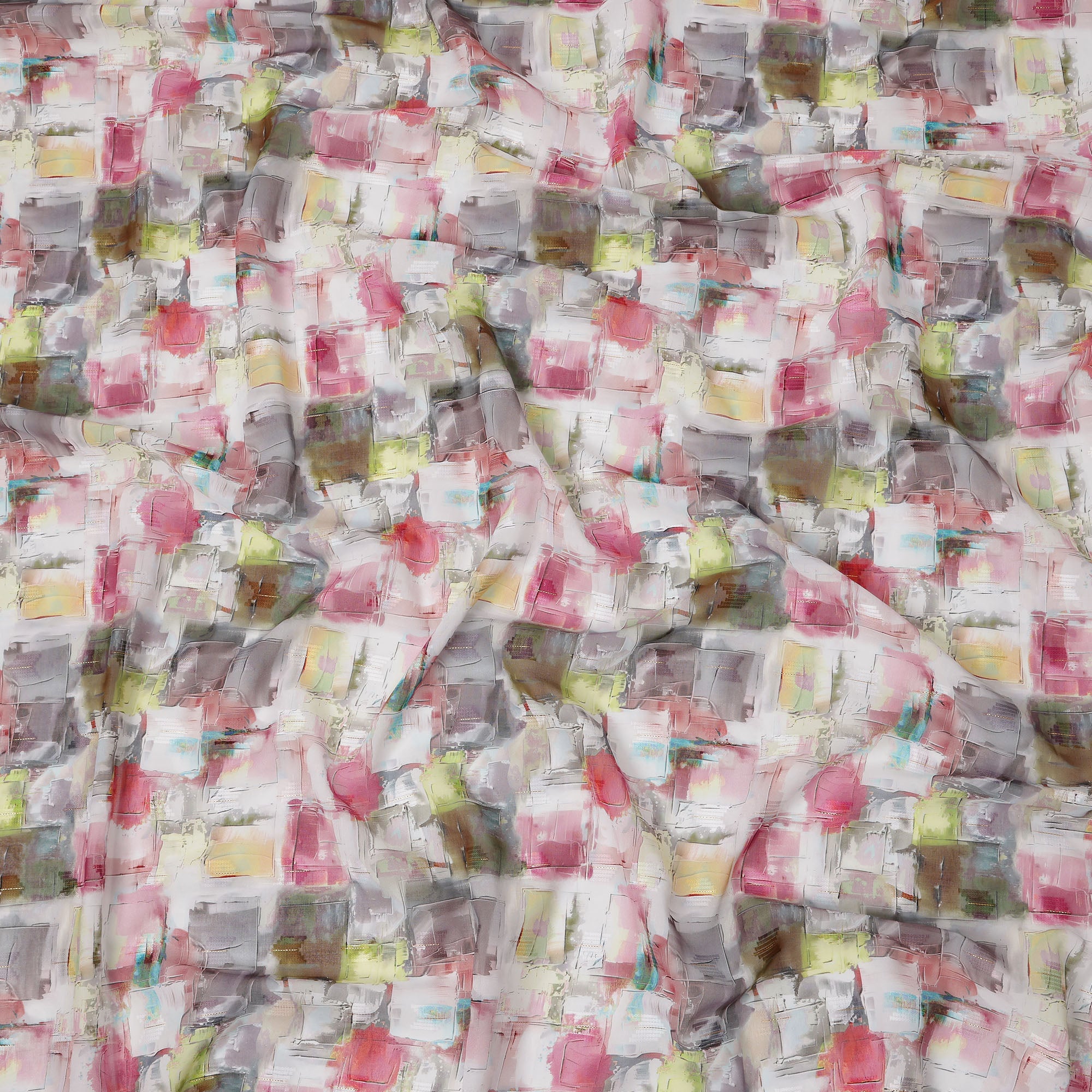 White Multicolor Abstract Brushstroke Print Cotton Voile Fabric with Pink, Grey, and Lime Accents, 140 Cms Width, Made in India-D24331