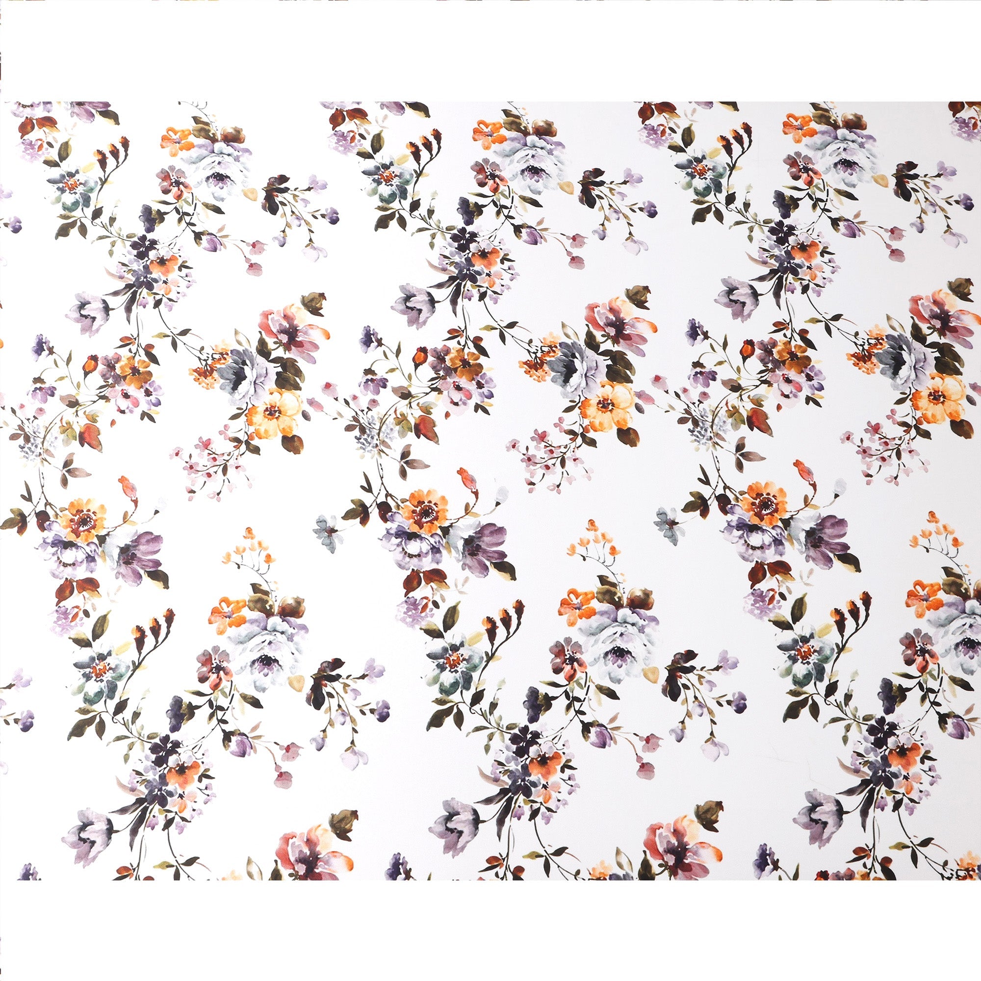 White base enhanced with vibrant multicolor floral designs in orange, mauve, and lilac tones