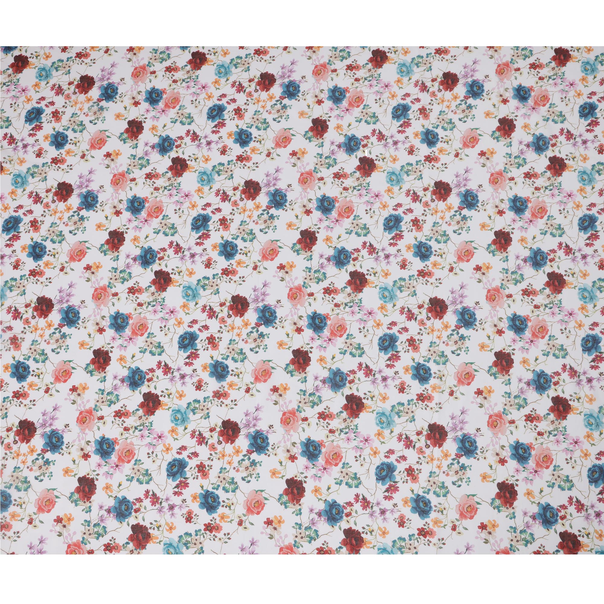 White base adorned with vibrant multicolor floral motifs for a lively look.