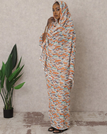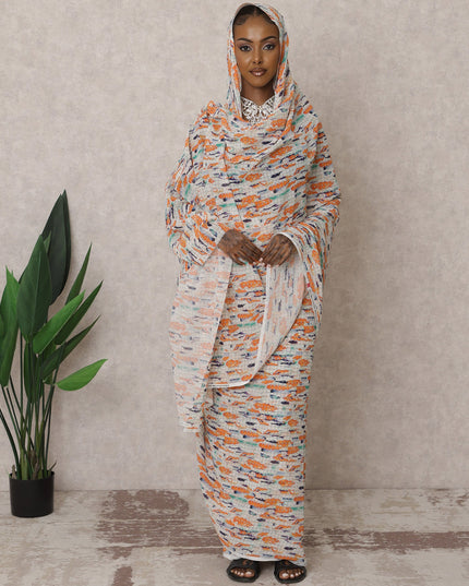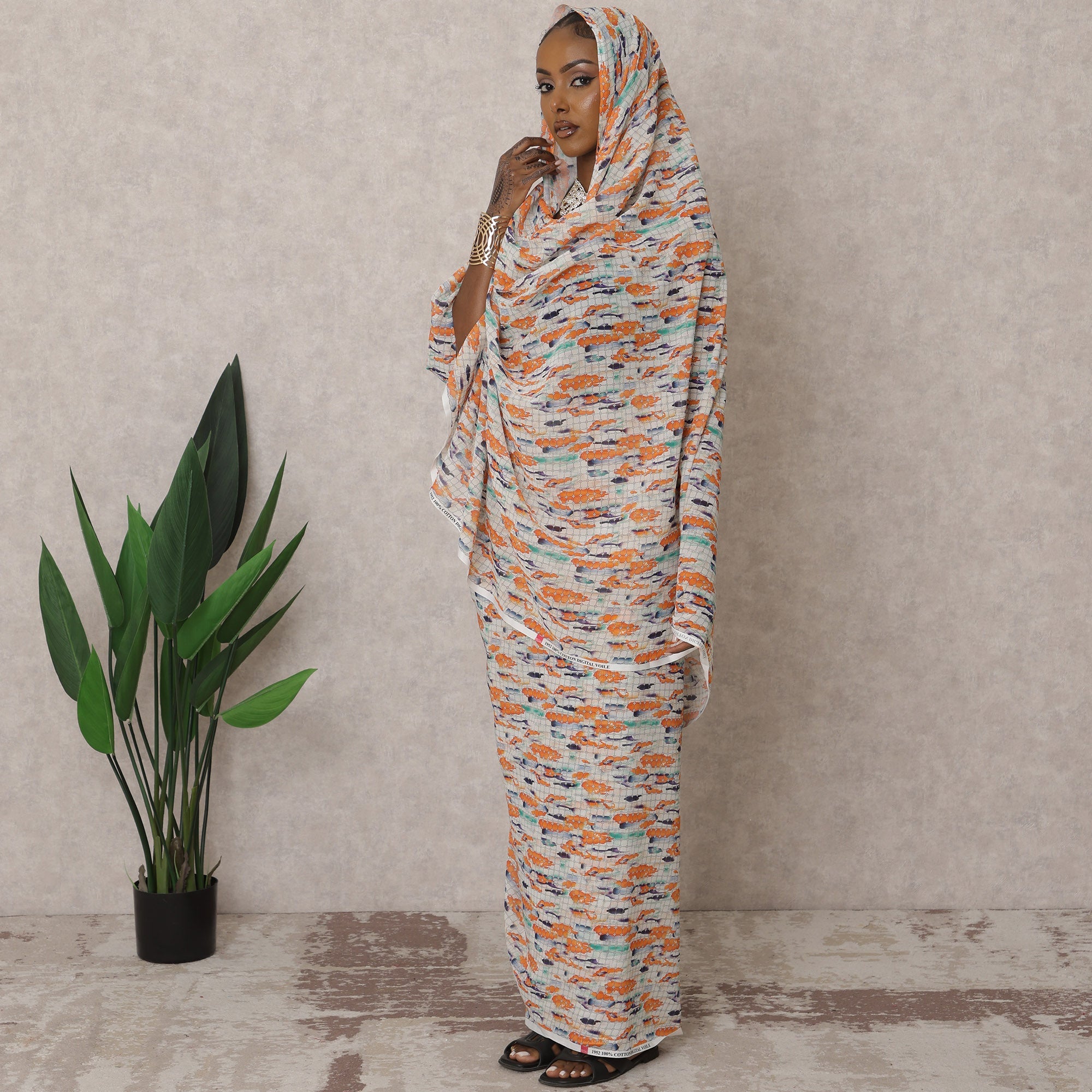 Embrace elegance with this exquisite white and orange traditional Sudanese thobe, crafted from premium pure cotton voile fabric for a soft, breathable, and lightweight feel. The 4.5-meter-long fabric drapes beautifully, creating a graceful silhouette perfect for cultural gatherings, festive occasions, and daily wear. Featuring a striking abstract print in shades of orange, blue, and beige, this thobe blends traditional style with contemporary charm. With a width of 110 cm, it ensures full coverage while maintaining a comfortable and airy feel. Expertly crafted in India, this high-quality thobe is easy to maintain, retaining its vibrant colors and fabric softness even after multiple washes, making it a timeless addition to your modest fashion collection.
