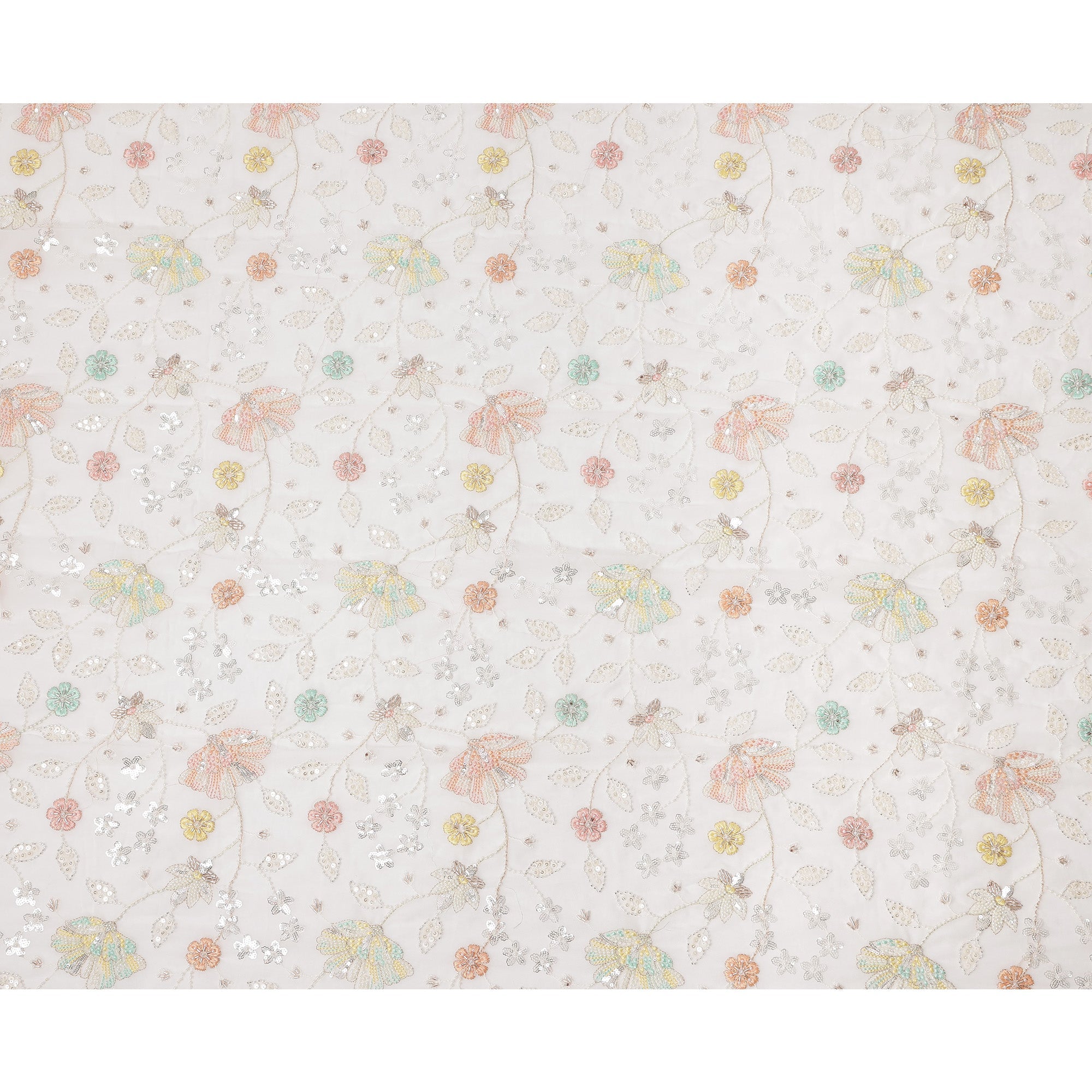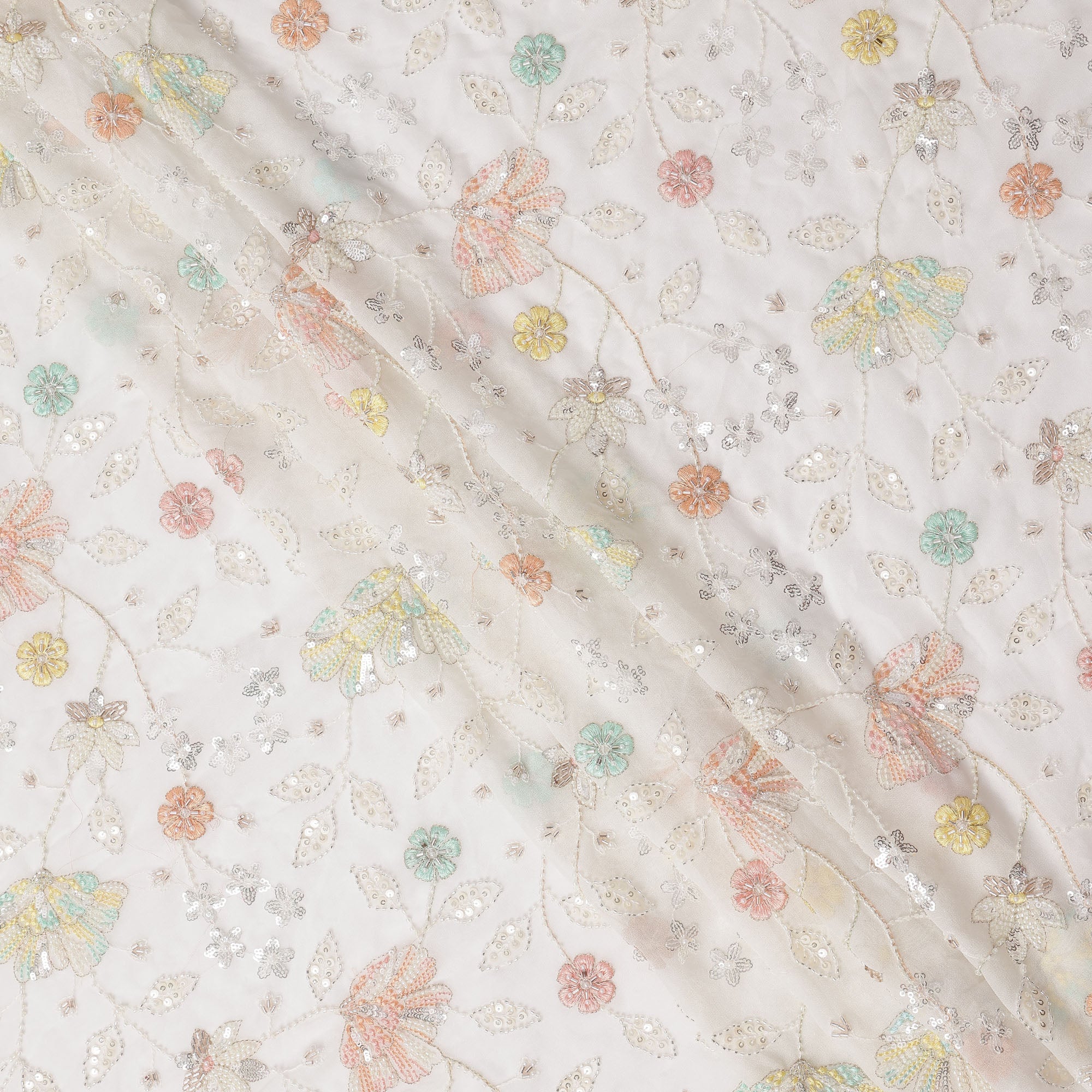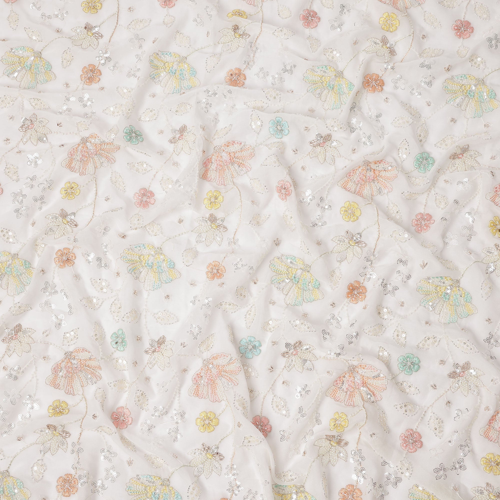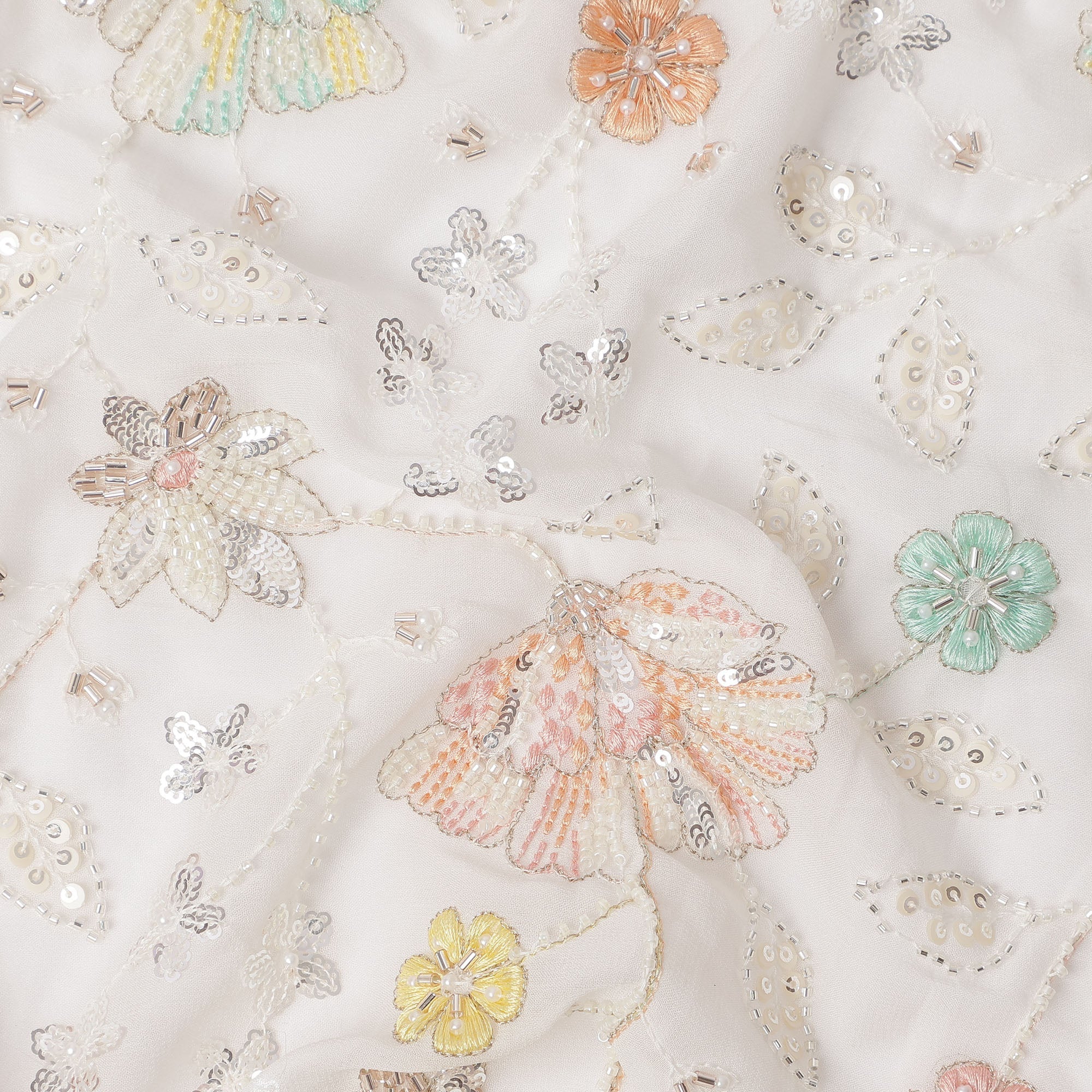 White Pastel Floral Sequin & Bead Embroidered Silk Chiffon Fabric, 110 Cms Width, India-D25269