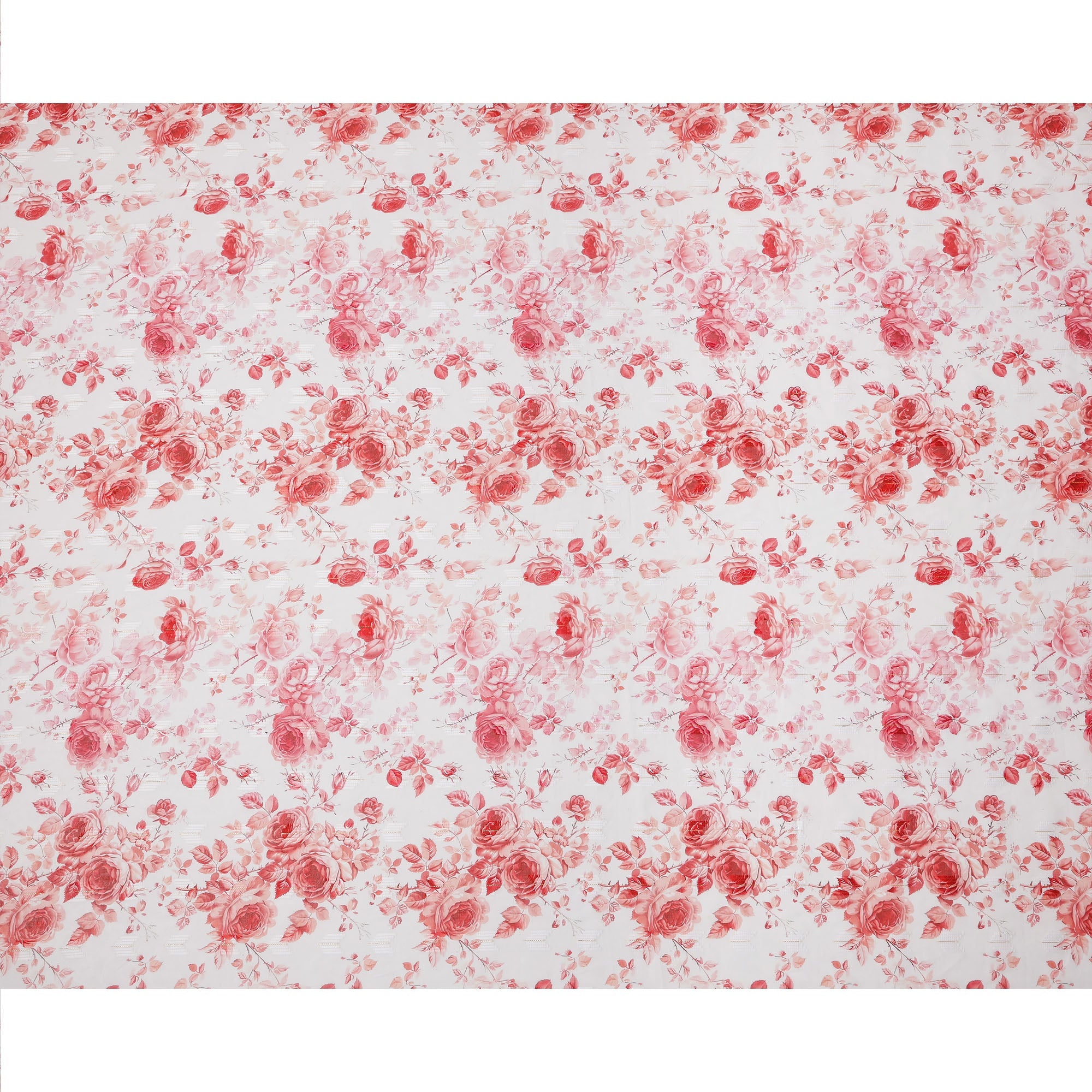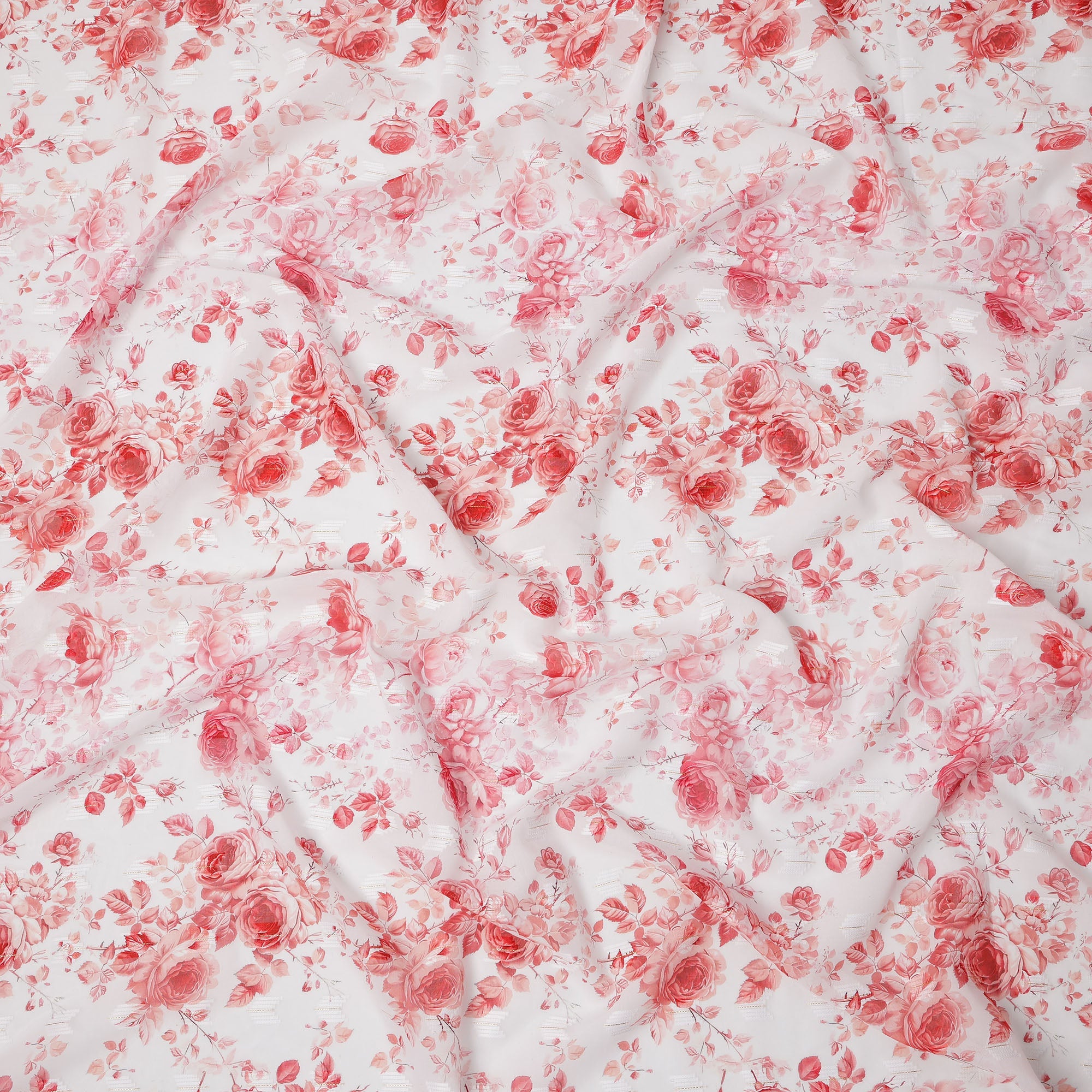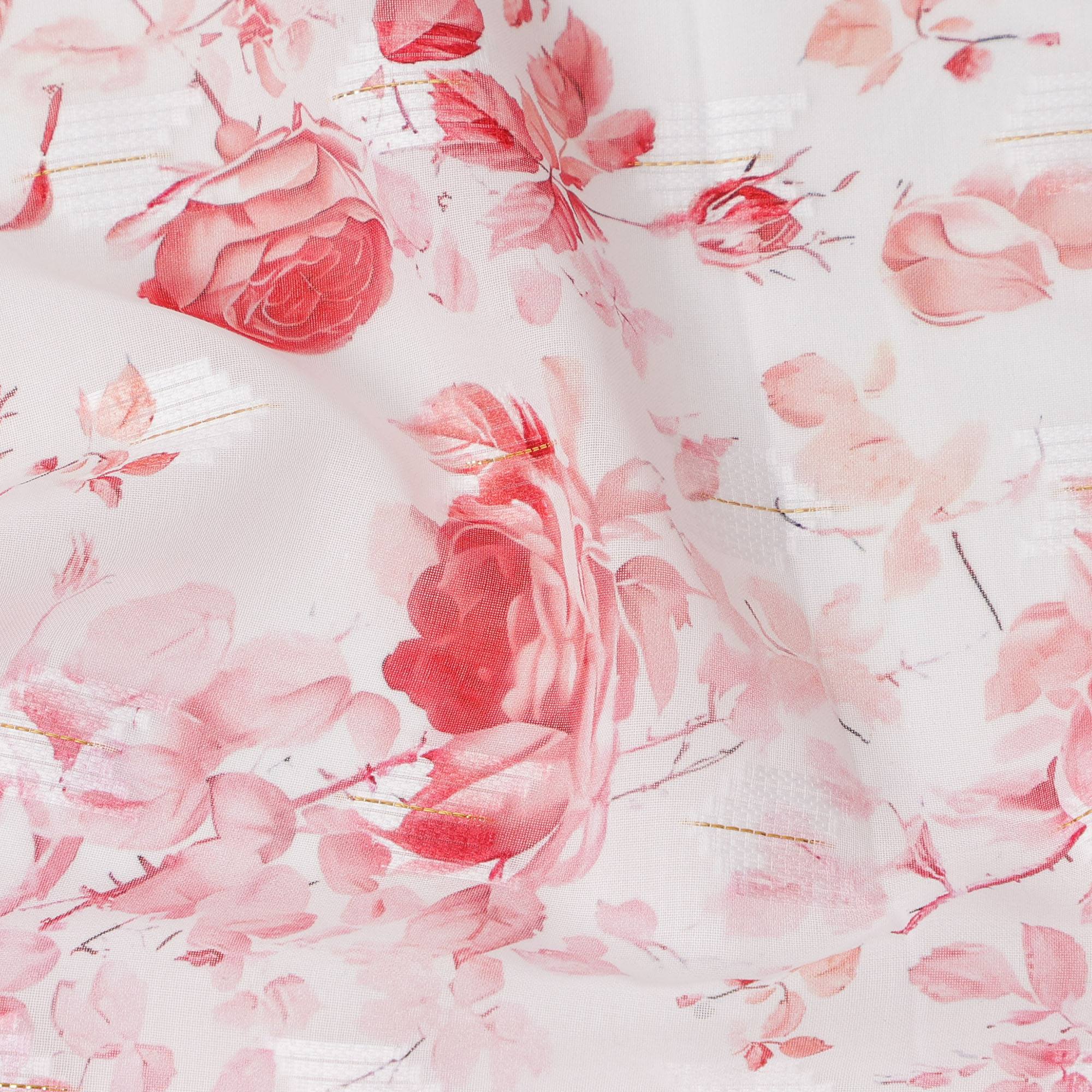 White Rose Print Cotton Voile Fabric with Red and Blush Floral Design, 140 Cms Width, Made in India-D24322