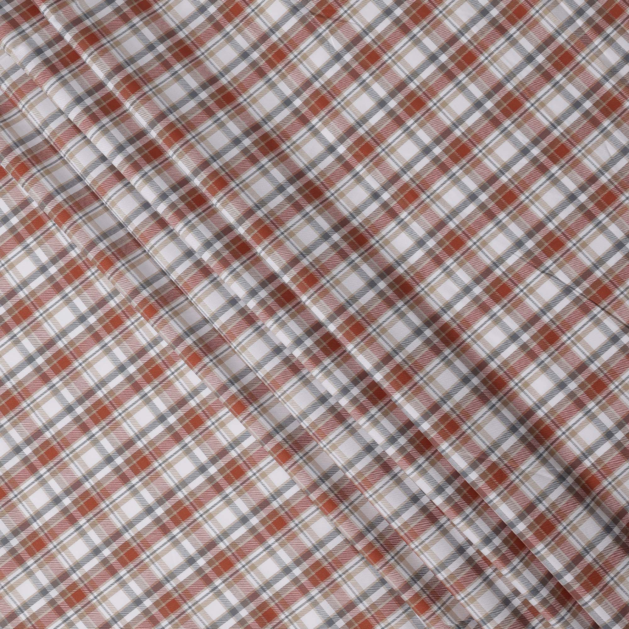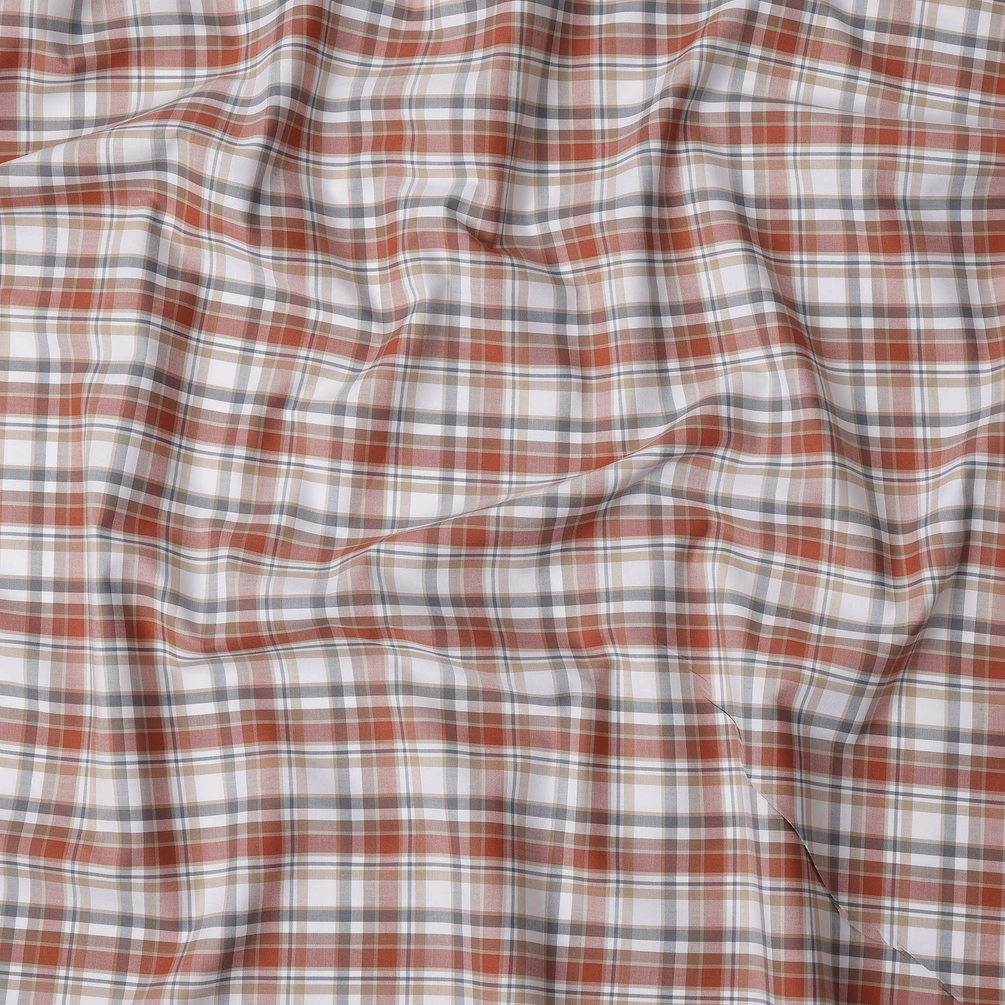 Premium cotton shirting fabric featuring white, rust, and grey tartan checks.