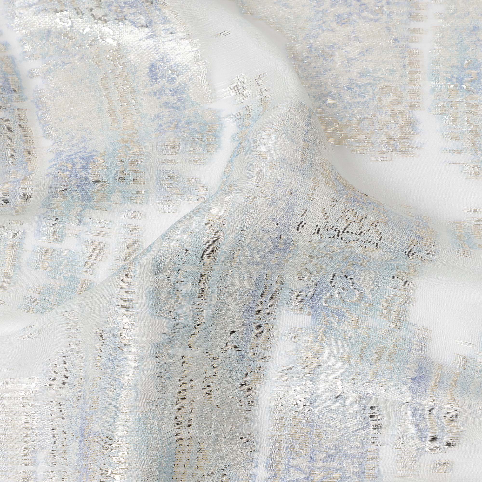 This white silver abstract metallic lurex pure silk chiffon fabric is a masterpiece of elegance and contemporary charm, designed for luxurious fashion and décor. The pristine white base is adorned with abstract metallic patterns in shimmering silver and subtle icy blue accents, giving it a radiant and ethereal look. Crafted from pure silk chiffon, the fabric is feather-light, semi-sheer, and exceptionally soft, offering a graceful drape that makes it ideal for sarees, gowns, dupattas, blouses, and chic décor pieces like curtains or overlays. At 110 cms wide, it provides ample fabric for delicate tailoring and layering, while the metallic detailing enhances its refined, festive appeal. Imported from South Korea, this fabric exemplifies premium craftsmanship and superior textile artistry. Lightweight and breathable, it ensures all-day comfort while maintaining a high-fashion edge. Best maintained through professional dry cleaning, this chiffon fabric is perfect for weddings, festive occasions, designer outfits, and luxury interiors. Shop online today to add a touch of shimmering sophistication with this white silk chiffon.