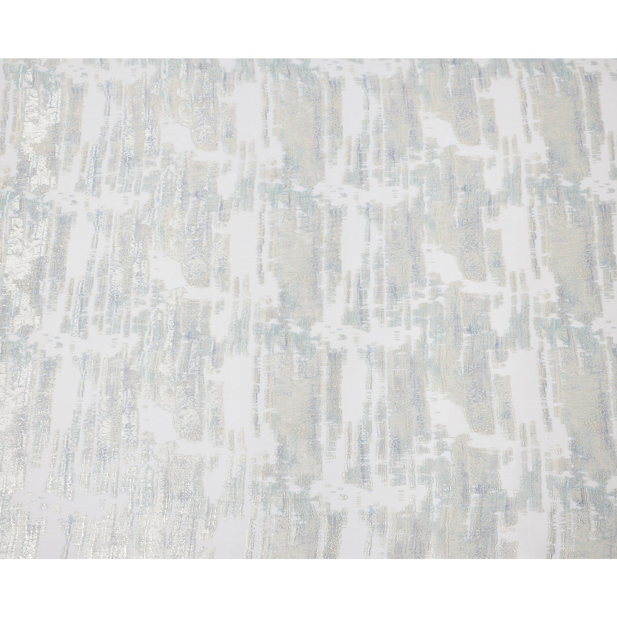 Pristine white base with metallic abstract patterns in silver and icy blue