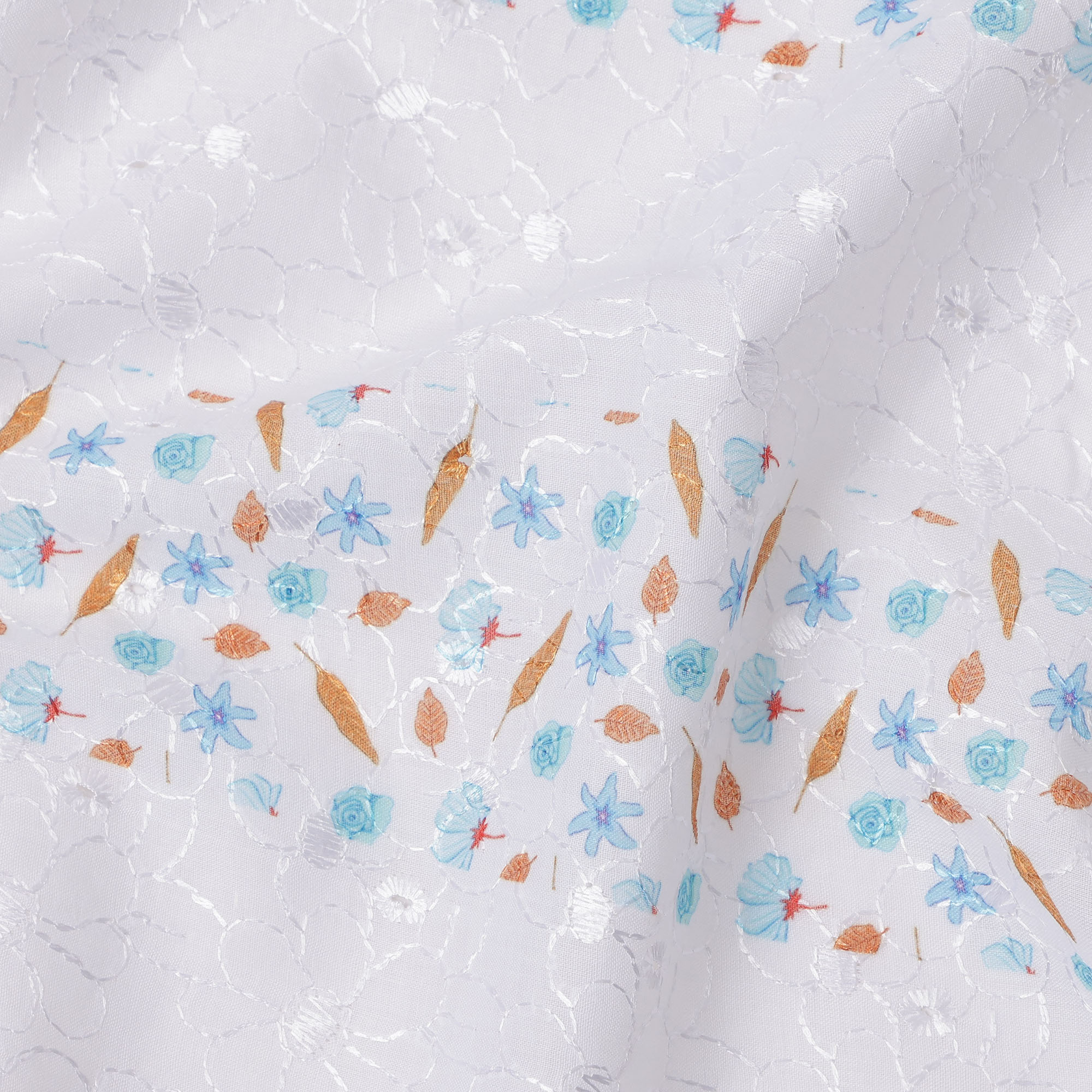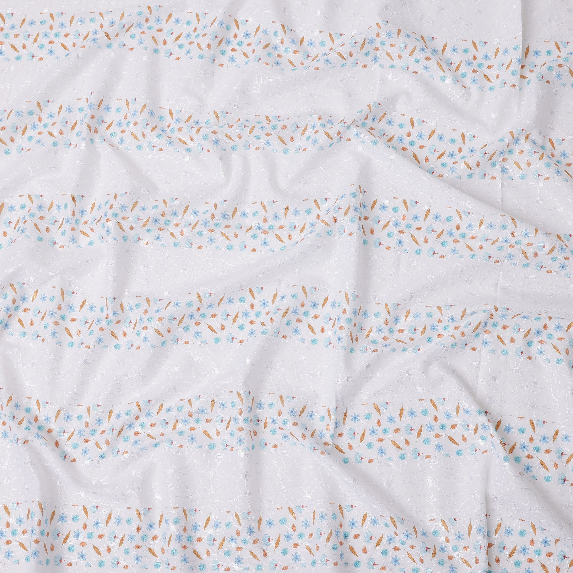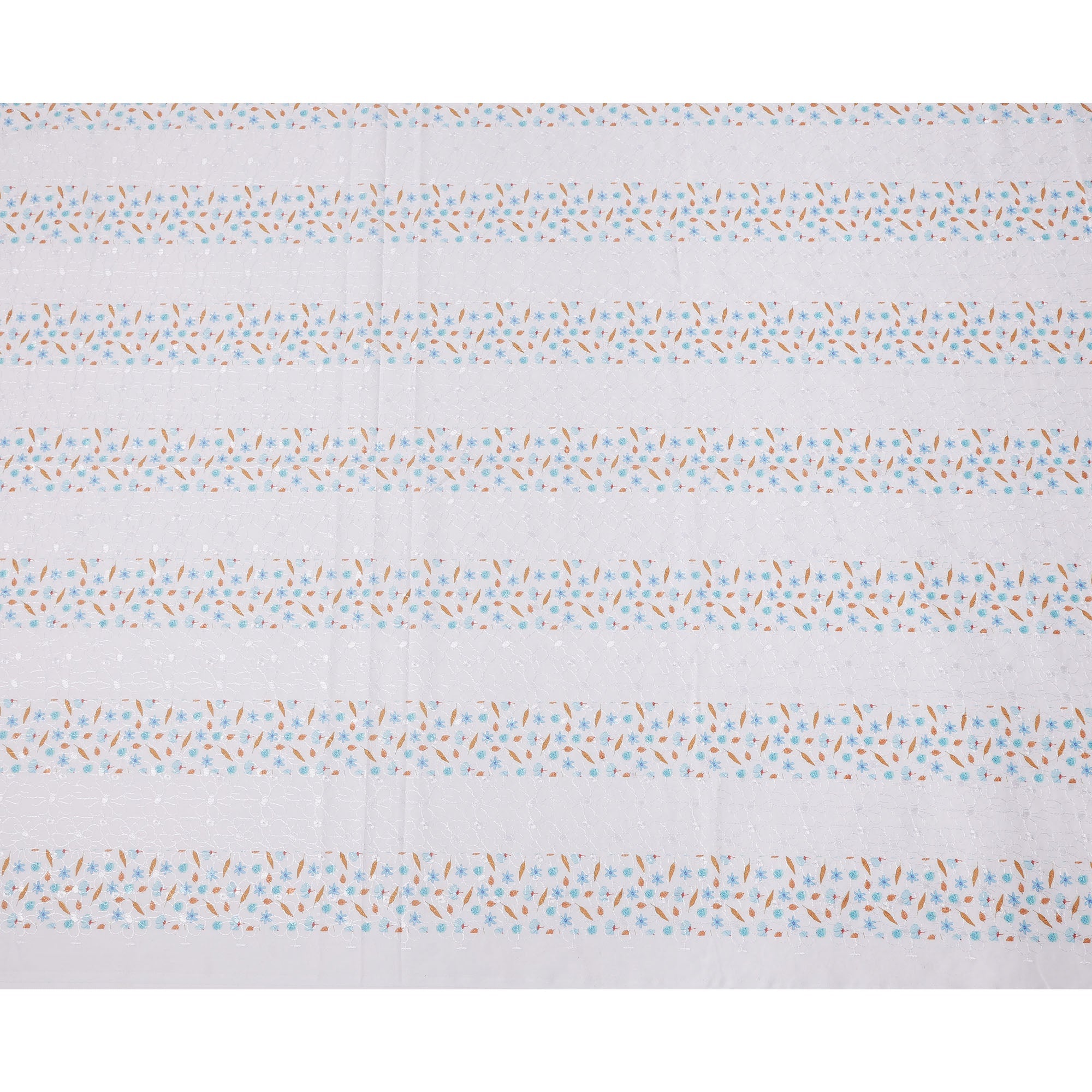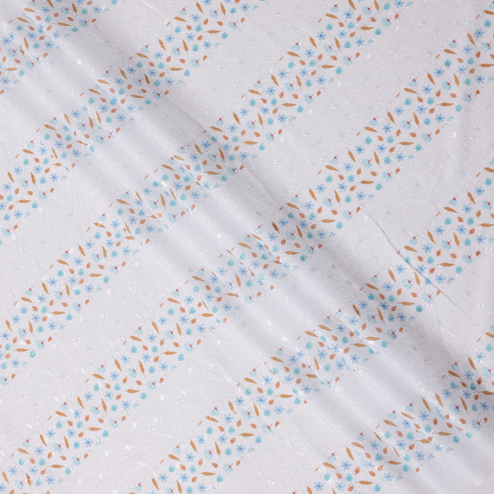 This White Striped Floral Embroidered Cotton Voile Fabric is an elegant textile that beautifully combines simplicity and delicate design. The crisp white voile base features subtle self-embroidery, enhanced with horizontal stripes of floral motifs in soft blue and earthy brown shades, creating a graceful contrast. Its lightweight and semi-sheer texture make it perfect for summer wear, allowing comfort and breathability without compromising on style. With a width of 110 cms, it offers versatility for making kurtas, tunics, dresses, dupattas, or even light sarees. The embroidery adds a refined charm to the fabric, making it suitable for both casual and semi-formal outfits. Handcrafted in India, this fabric reflects traditional artistry and modern appeal, making it a timeless addition to any wardrobe.
