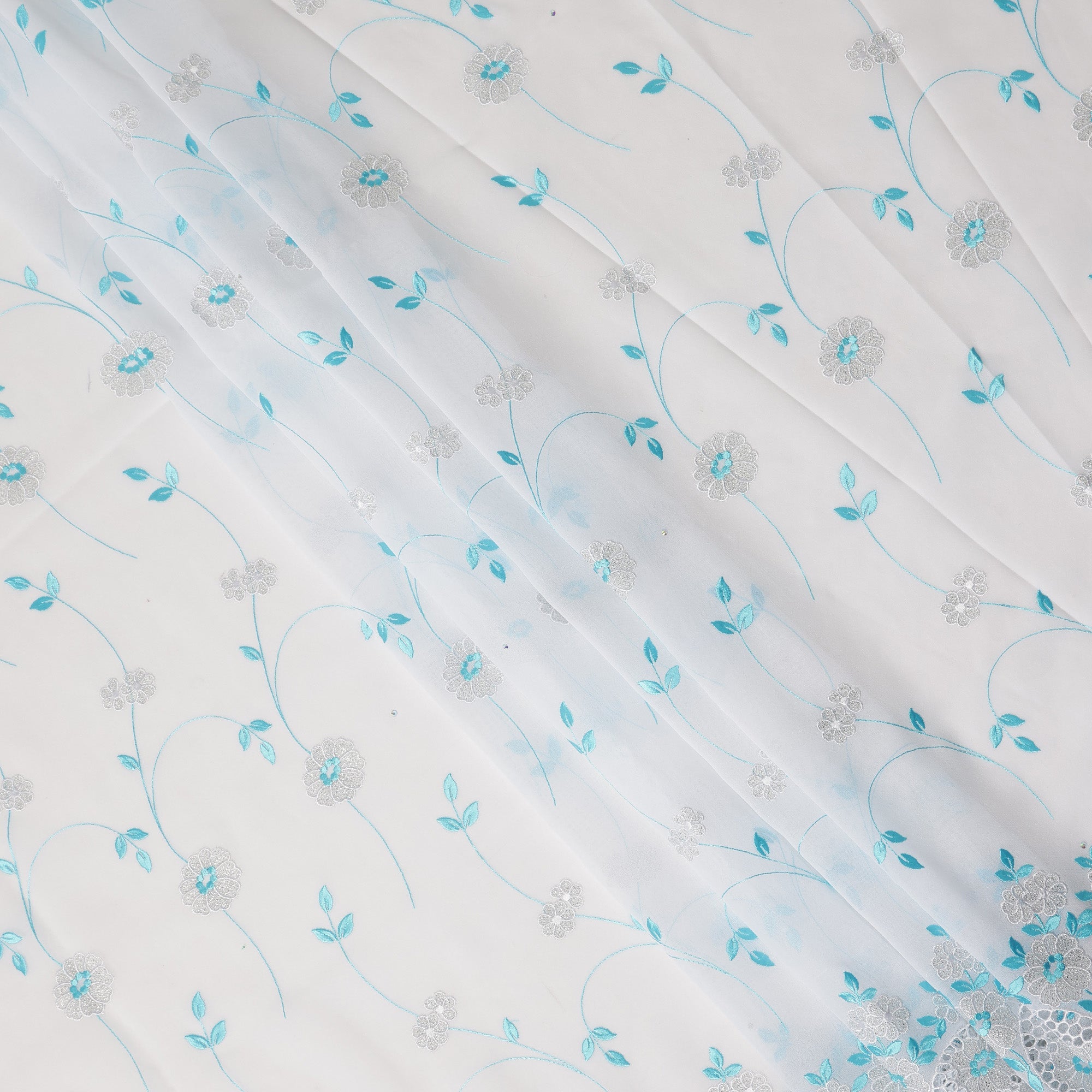 Elegant floral vine embroidery enhanced with delicate stone work adds a luxurious decorative detail to the fabric.