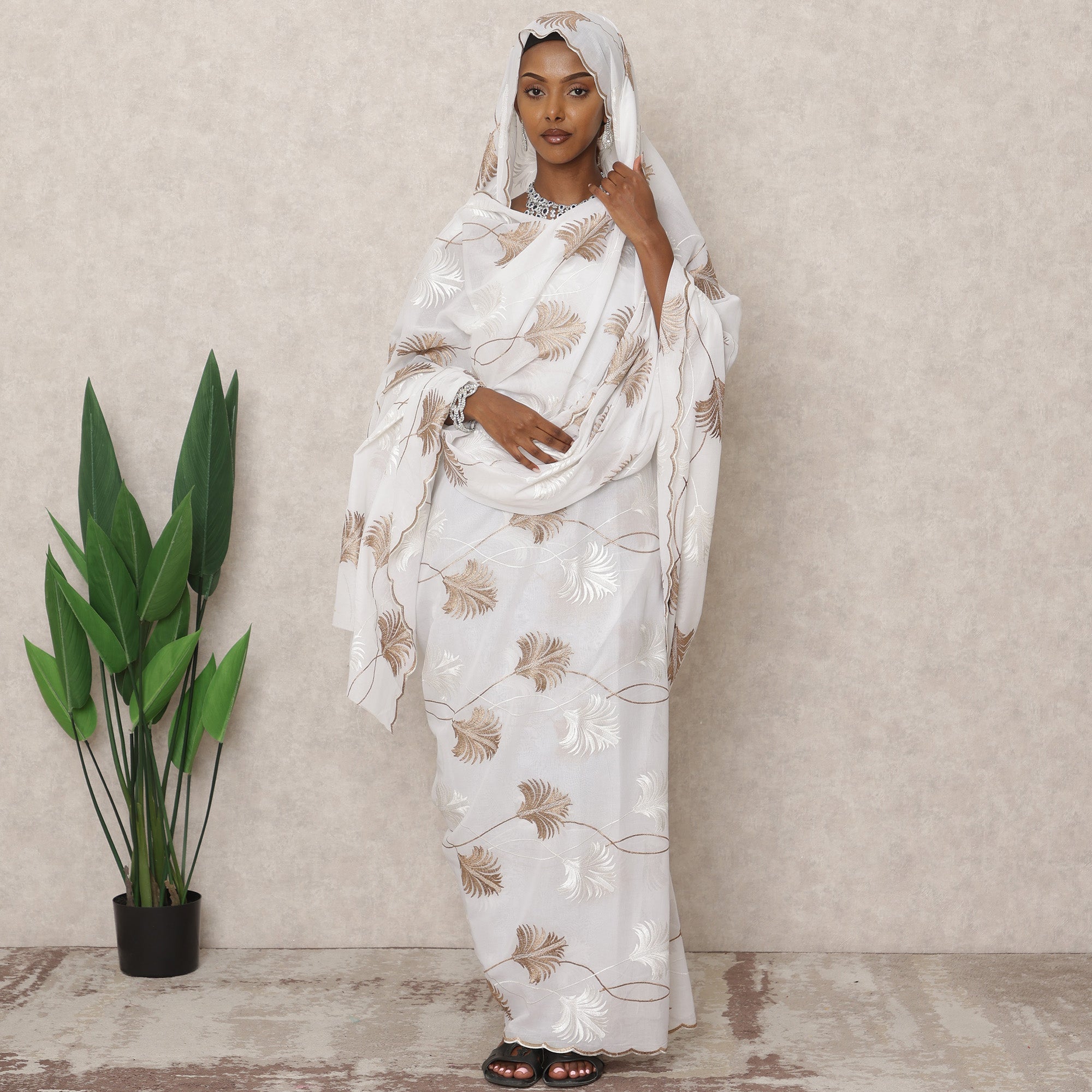 White Traditional Sudanese Thobe with Beige and White Leaf Voile Embroidery, 4.5 Mtrs Piece, Pure Cotton Fabric, Width 140 Cms, Made in India-D24461
