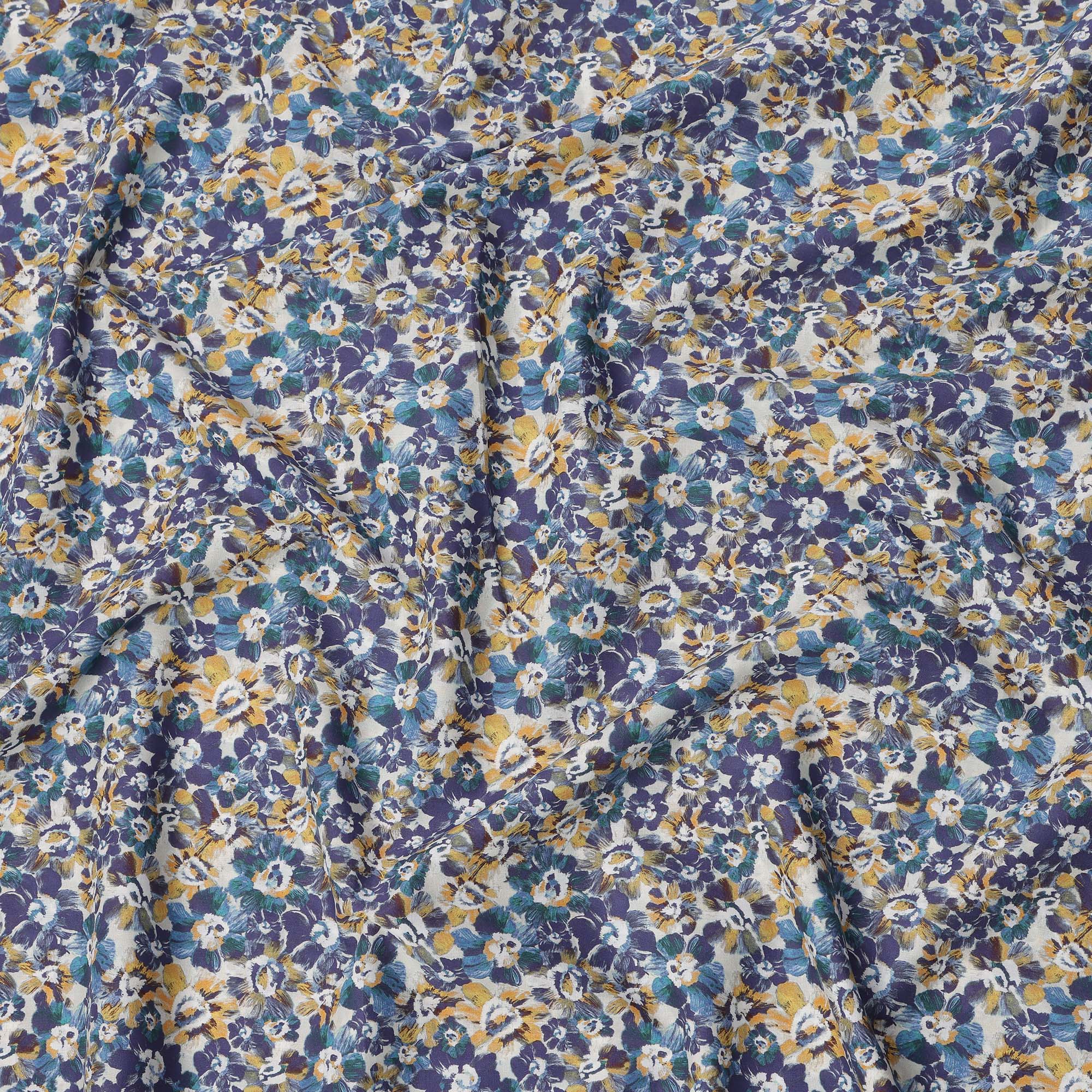 This white with blue and yellow floral print pure cotton lawn fabric from Italy is a refreshing and vibrant textile, designed to add charm and elegance to your wardrobe. The crisp white base is beautifully adorned with hand-painted style floral motifs in rich shades of blue, yellow, green, and hints of purple, creating a lively and artistic look. Crafted from 100% pure cotton lawn, it offers exceptional breathability, softness, and a lightweight finish, making it perfect for summer shirts, tunics, dresses, and blouses. Its fine weave ensures a smooth drape with a polished appearance, giving every tailored piece a refined edge. With a generous width of 140 cms, this fabric allows versatile styling options from classic cuts to modern silhouettes. Proudly woven in Italy, it reflects superior craftsmanship and premium finishing. Easy to maintain, this fabric holds its vibrancy, softness, and structure even after multiple washes, making it a timeless addition to your collection.