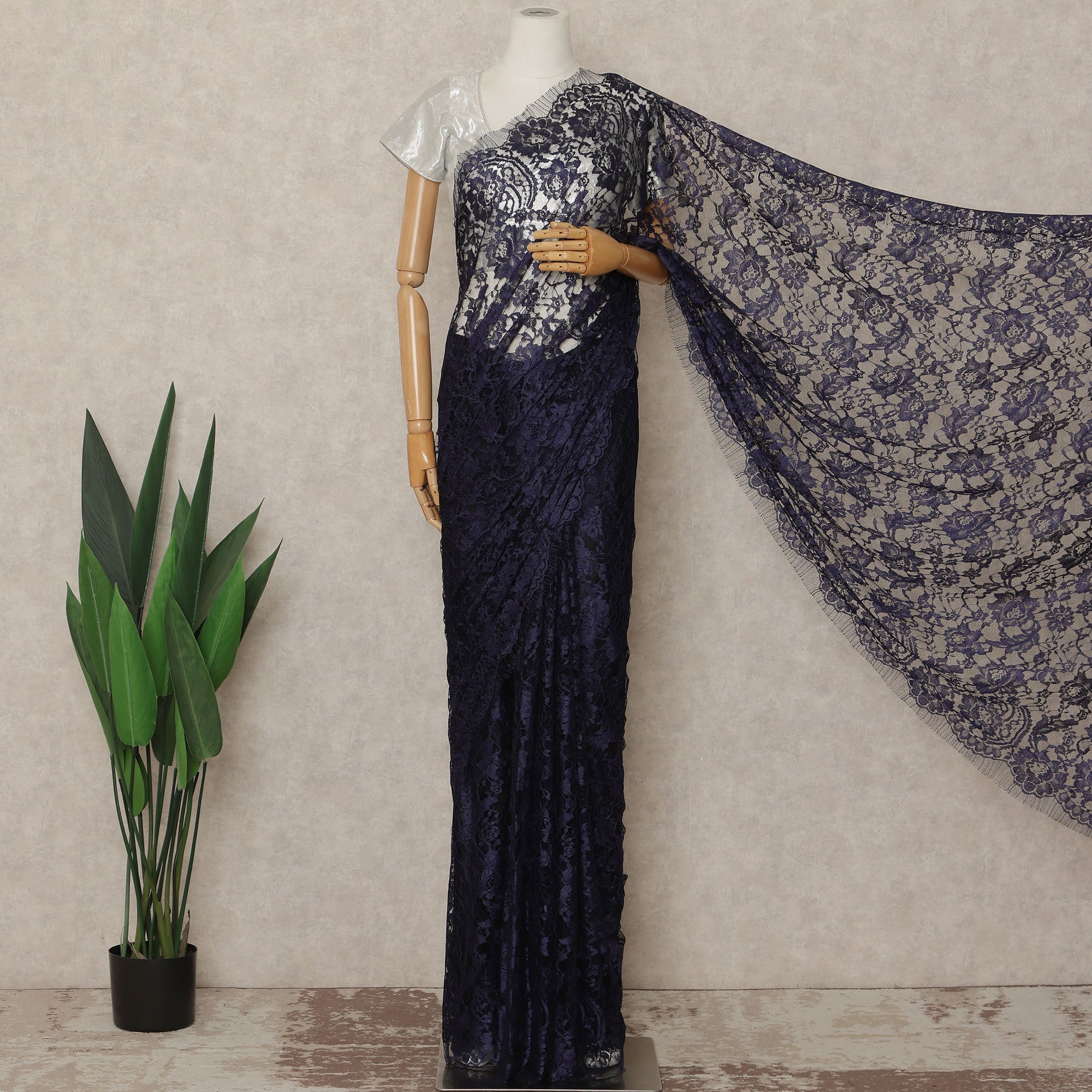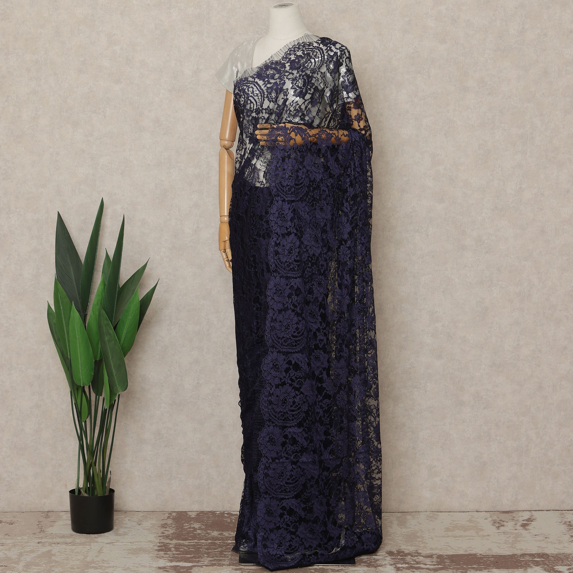 This Wine blue premium French Chantilly saree lace fabric is created for designers, boutiques, and women who appreciate timeless elegance with rich color depth. Made in France, the intricate floral net pattern reflects the classic artistry of authentic Chantilly lace, offering a graceful drape and refined texture ideal for sarees and couture designs. Supplied as a single continuous piece of approximately 5.5 meters with a wide 110 cms width, it allows seamless draping, fluid pleating, and sophisticated styling for weddings, evening wear, and festive occasions. Lightweight yet richly detailed, this lace enhances the silhouette while ensuring comfort and a premium finish. Blouse fabric is not included, allowing full creative customization.