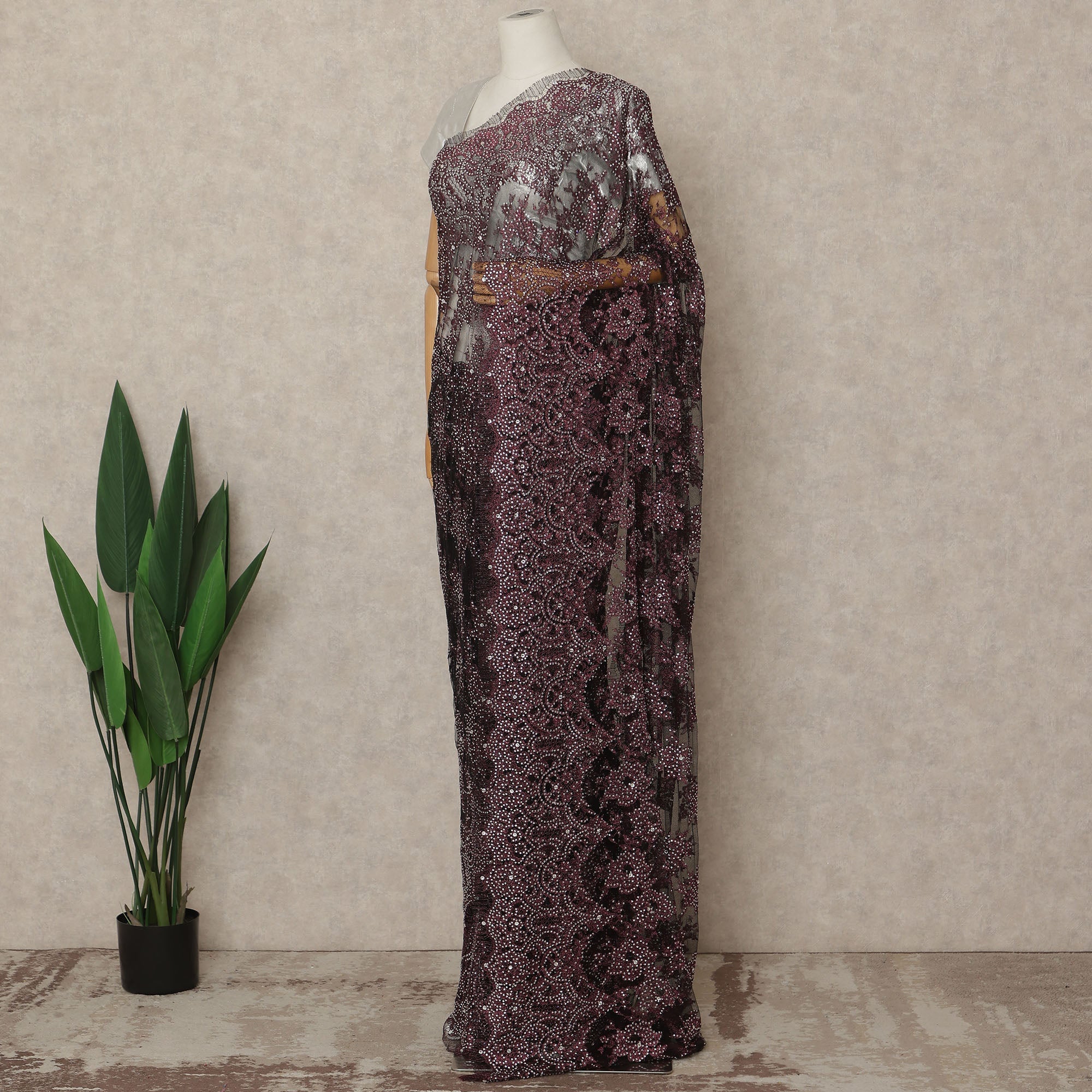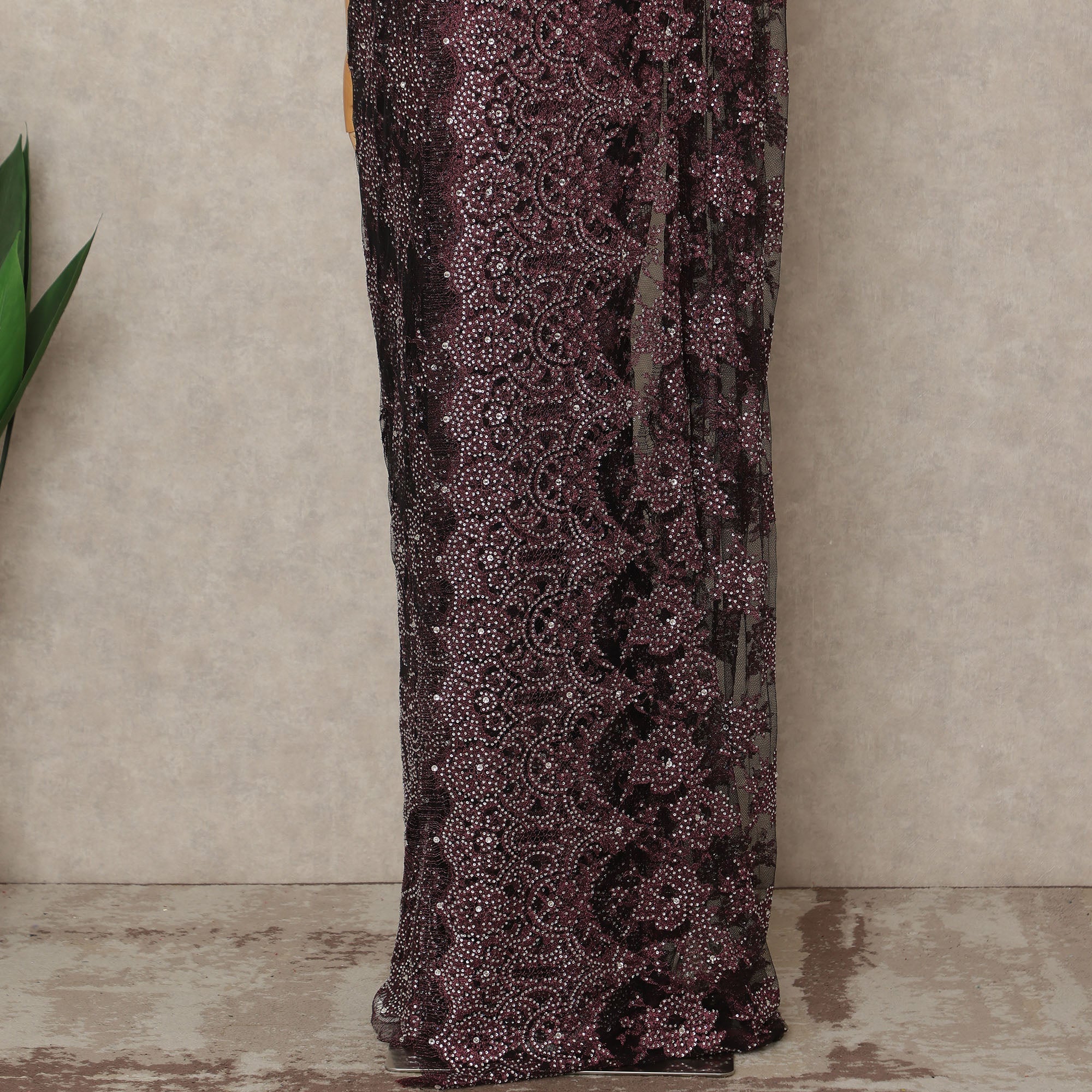 This wine burgundy premium French metallic Chantilly saree lace with stonework is a striking blend of richness and refined craftsmanship. Designed on a delicate sheer net base, the lace features intricate Chantilly floral motifs enhanced with metallic thread detailing and carefully placed stone embellishments that create a radiant, multidimensional shimmer. The deep wine burgundy shade exudes regal elegance, making it ideal for bridal trousseau, receptions, festive gatherings, and evening occasions. Expertly crafted in France, this lace reflects superior quality and timeless artistry. With an approximate length of 5.5 meters and a generous width of 110 cms, it offers ample fabric for a graceful and luxurious saree drape. Blouse not included.