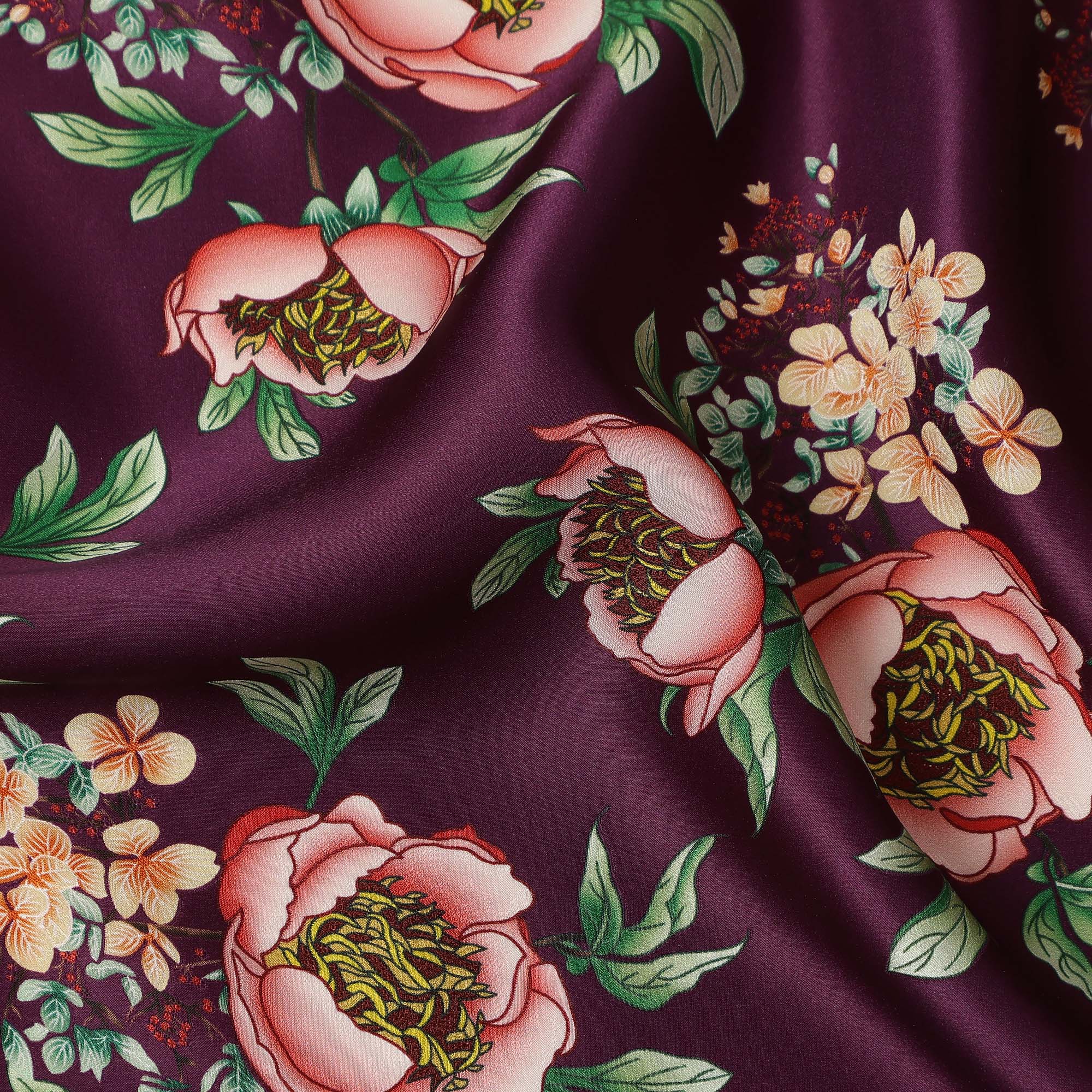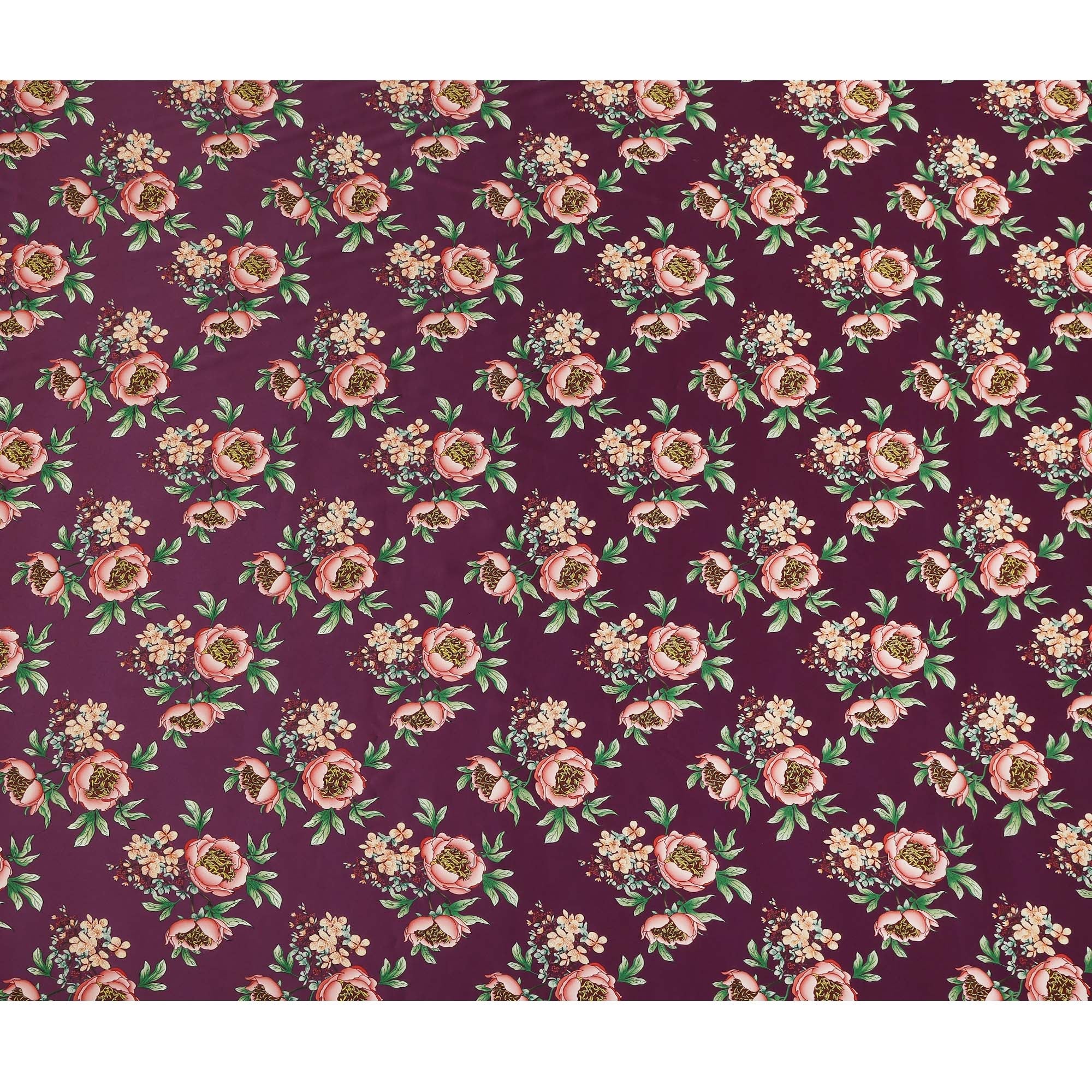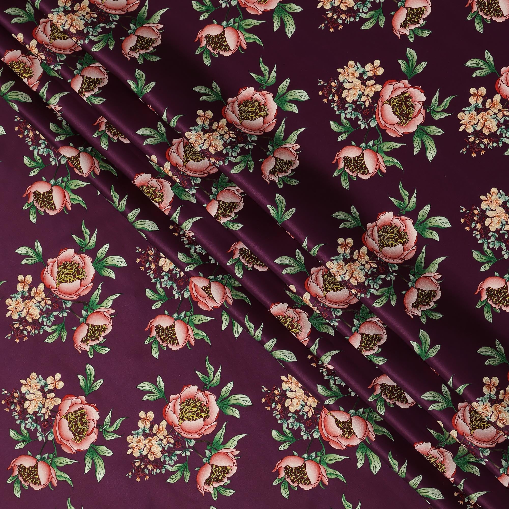 Wine Floral Allover Printed Premium Pure Silk Satin Fabric, 110 Cms, China-D27071