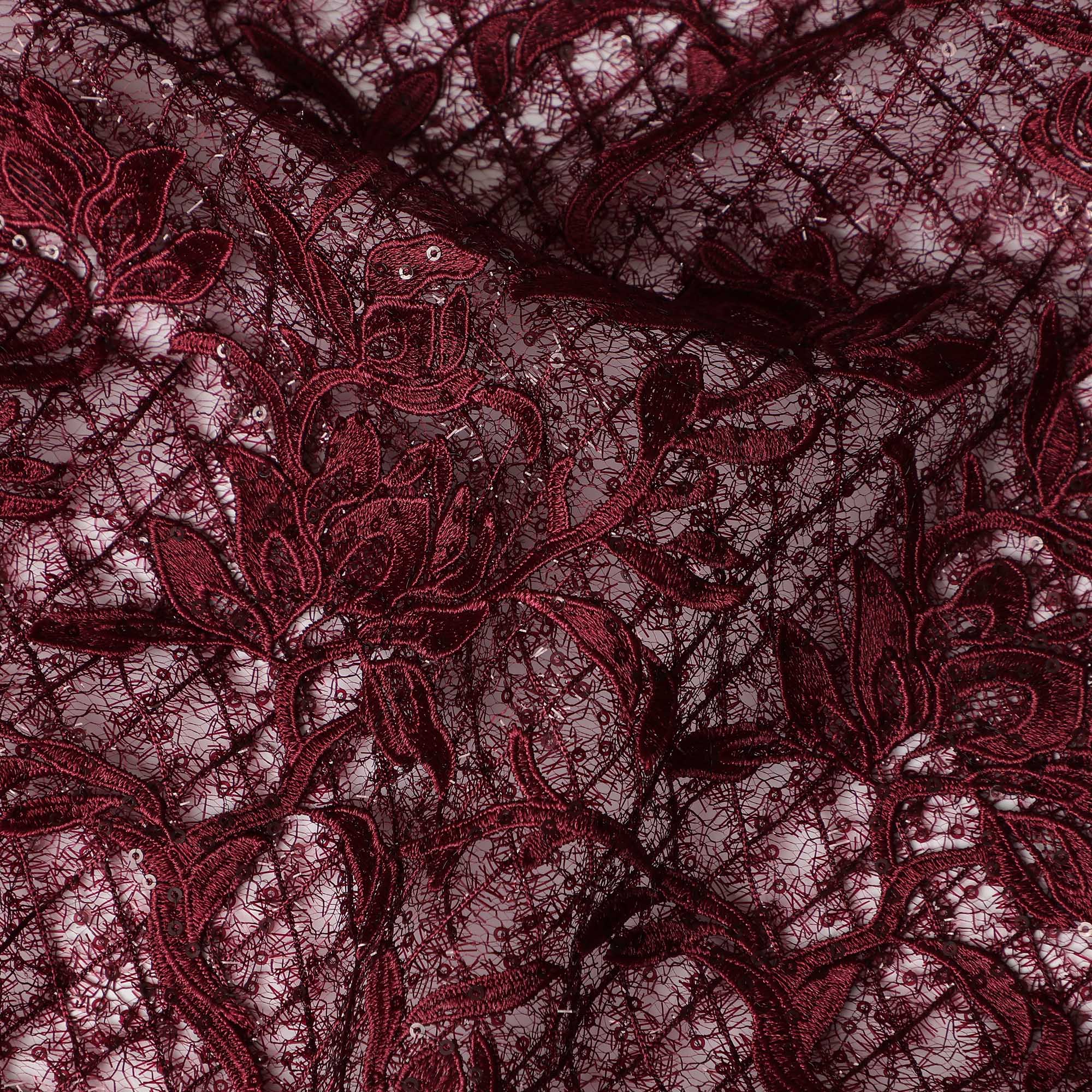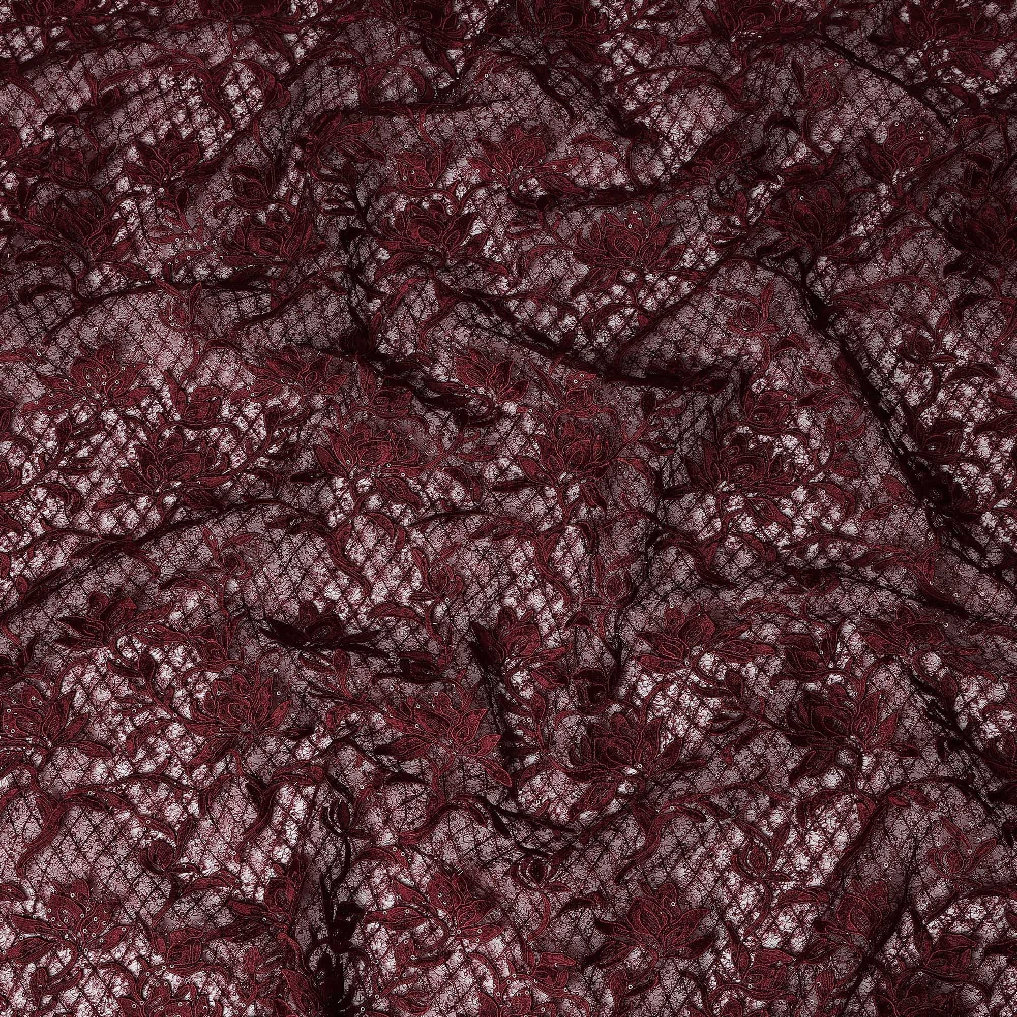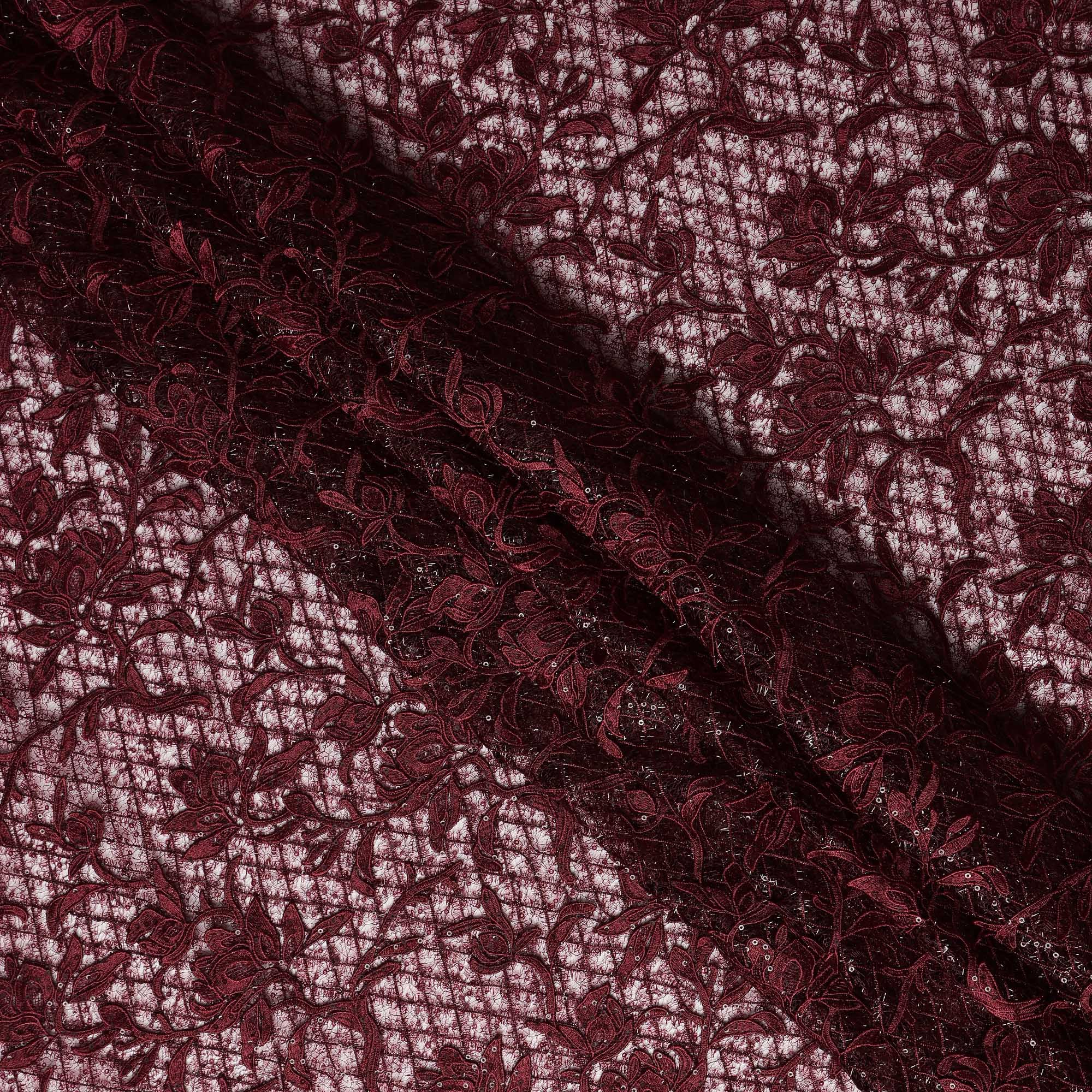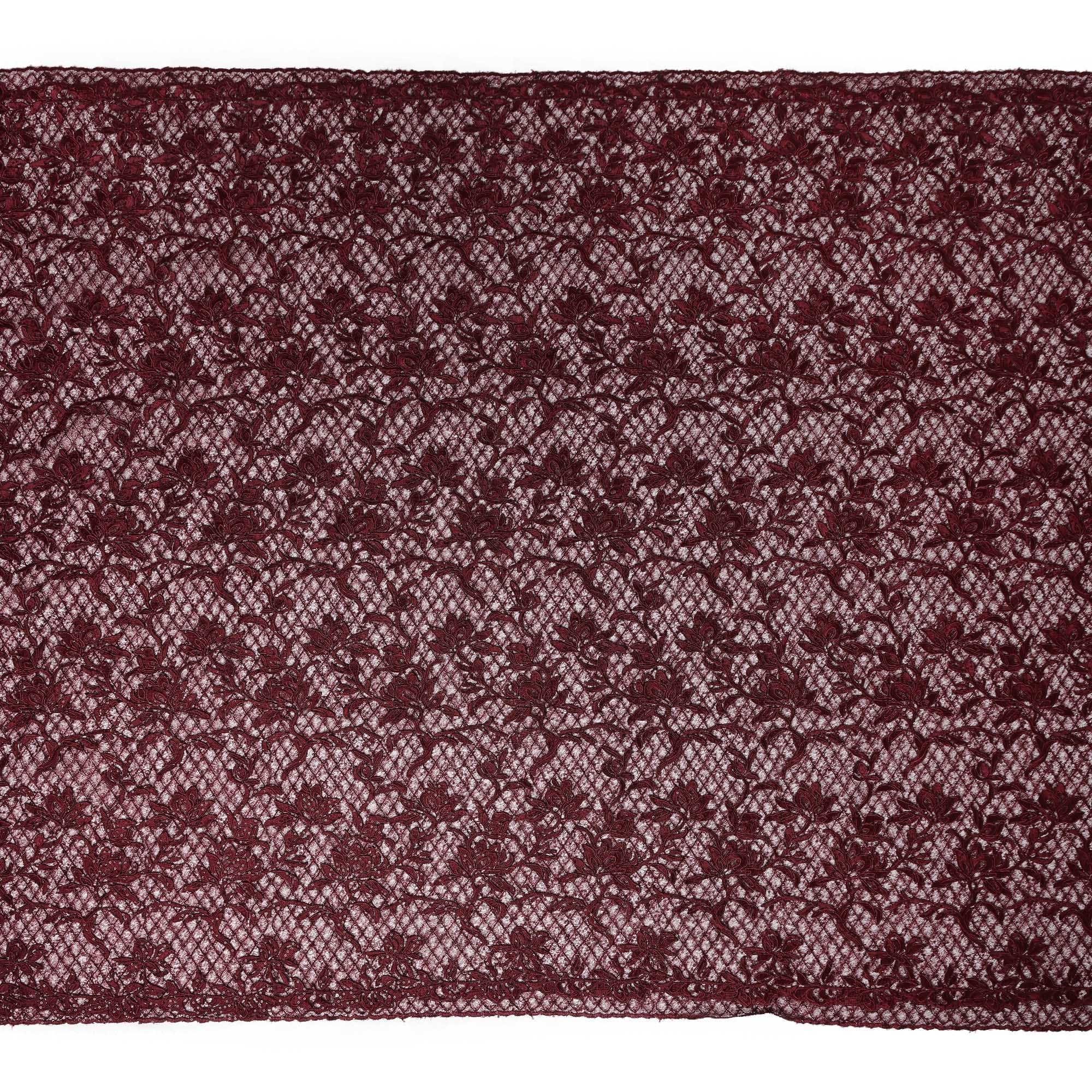 This synthetic lace fabric comes in a rich wine color that exudes elegance and depth, beautifully highlighted with intricate floral embroidery spread across a delicate net base. The dense yet refined pattern creates a luxurious texture, making the fabric visually striking while maintaining a soft and flexible drape. Crafted from high-quality synthetic fibers, it offers durability along with a lightweight feel, ensuring ease of cutting, stitching, and shaping for designer creations. With a generous width of 140 cms, this lace fabric is ideal for statement gowns, bridal and reception wear, cocktail dresses, blouses, saree overlays, dupattas, and couture ensembles. Its semi-sheer structure allows seamless pairing with contrast or matching linings, giving designers complete creative freedom for sophisticated and premium fashion pieces.