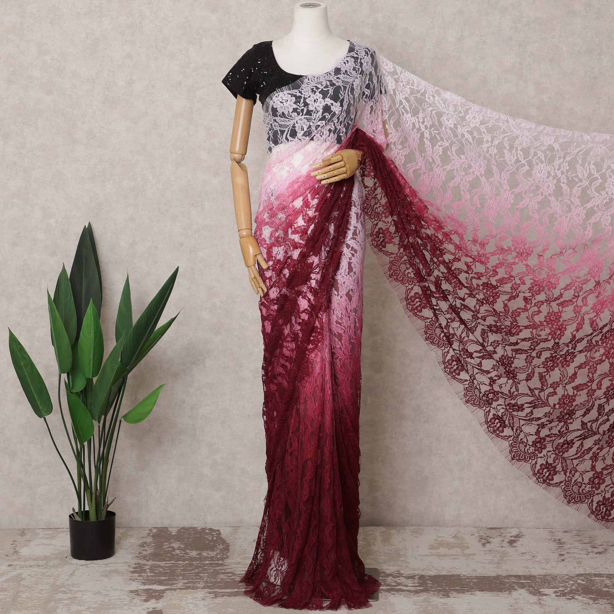 This exquisite Wine Pink & Light Pink ombre French Chantilly lace saree is a stunning fusion of elegance and modern sophistication. Crafted from premium Chantilly lace, the fabric showcases a seamless gradient transitioning from soft pink to deep wine, adorned with intricate floral patterns for a delicate and luxurious appeal. The lightweight, sheer texture allows for a graceful drape, making it an ideal choice for weddings, festive occasions, and evening events. With a width of 110 cm and a length of 5.5 meters, this unstitched saree provides ample fabric for versatile styling, ensuring a timeless and refined look. Please note that the blouse is not included.