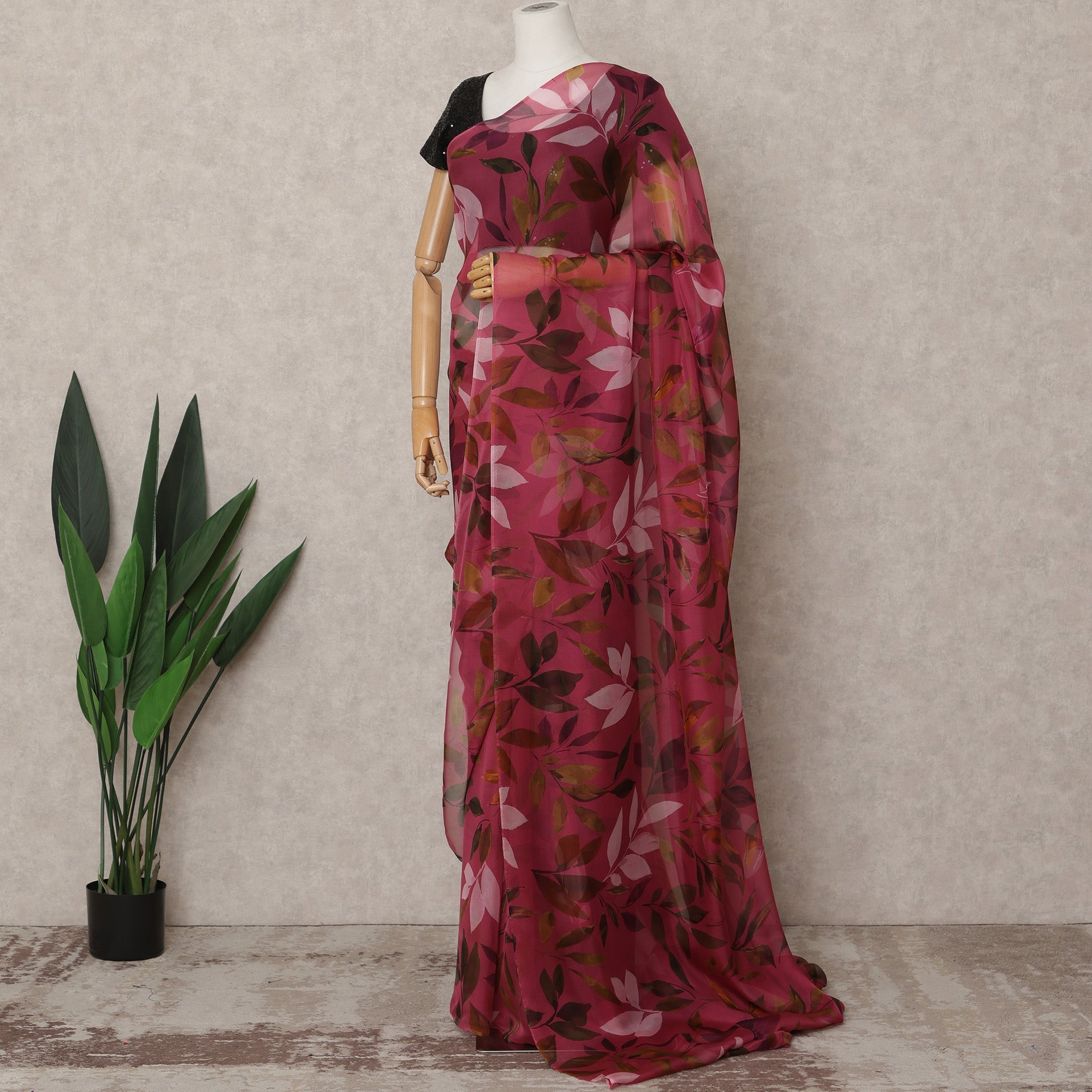 Wine Pink Premium Pure Silk Chiffon Leaf Printed Saree, 5.5 Mtrs Length, 110 Cms Width, Made in India-D24231