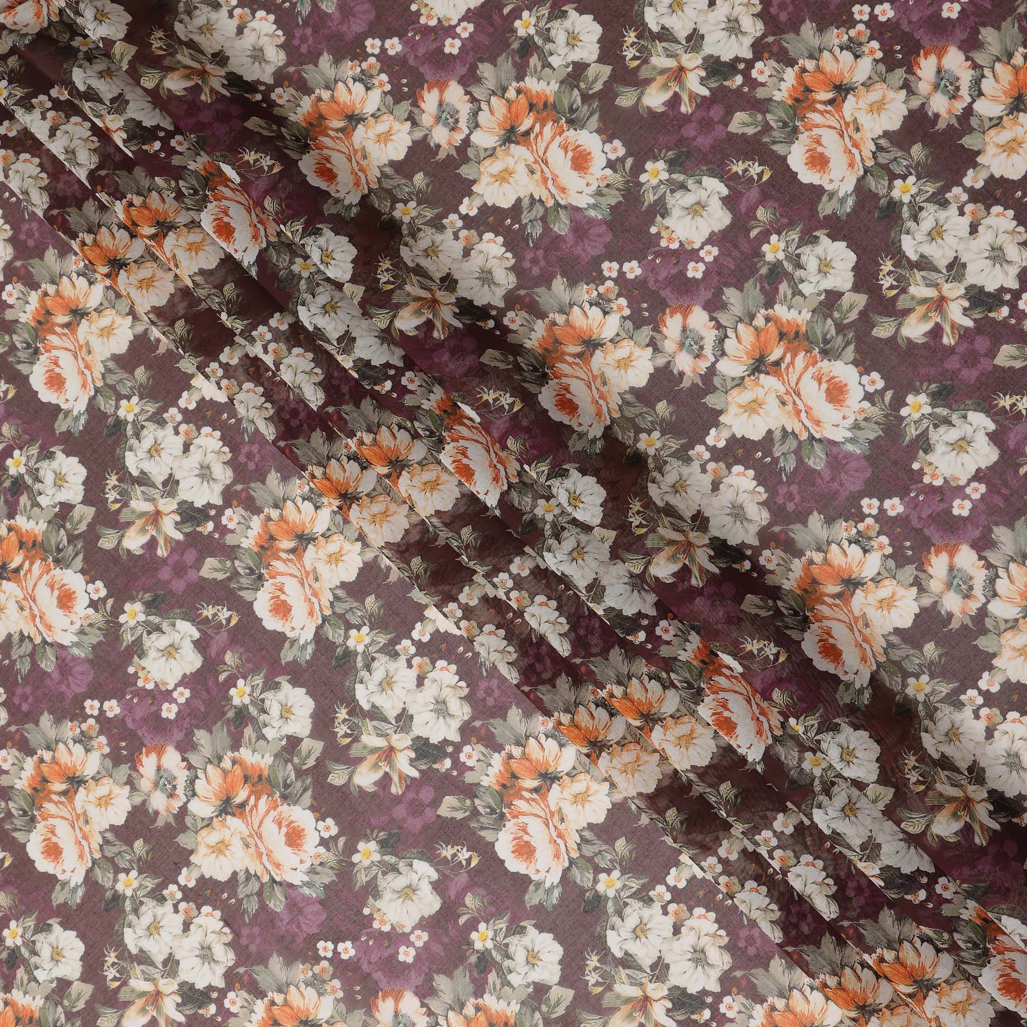 This wine purple vintage floral blossom printed cotton voile fabric features a deep purple base enhanced with elegant ivory and peach blossoms, delicate tiny florals, and soft green foliage that create a rich and romantic appeal. Crafted from lightweight and breathable cotton voile, it offers a smooth, airy texture that feels gentle against the skin while providing a graceful and fluid drape. With a generous 150 cms width, this fabric is perfect for dresses, blouses, tunics, scarves, and refined home décor accents. Ideal for designers, boutiques, and sewing enthusiasts, it blends timeless floral charm with everyday comfort and versatile functionality for stylish creative projects.