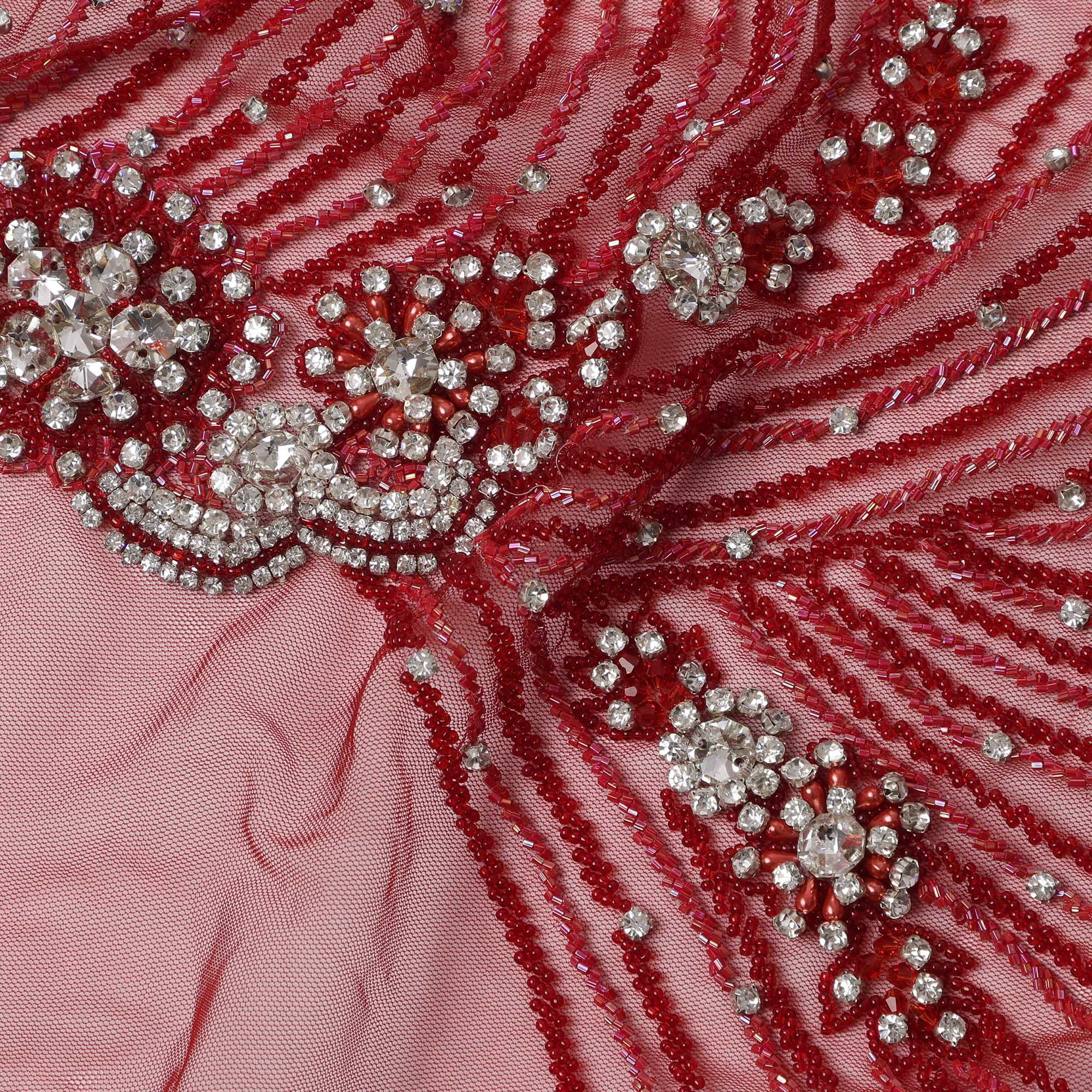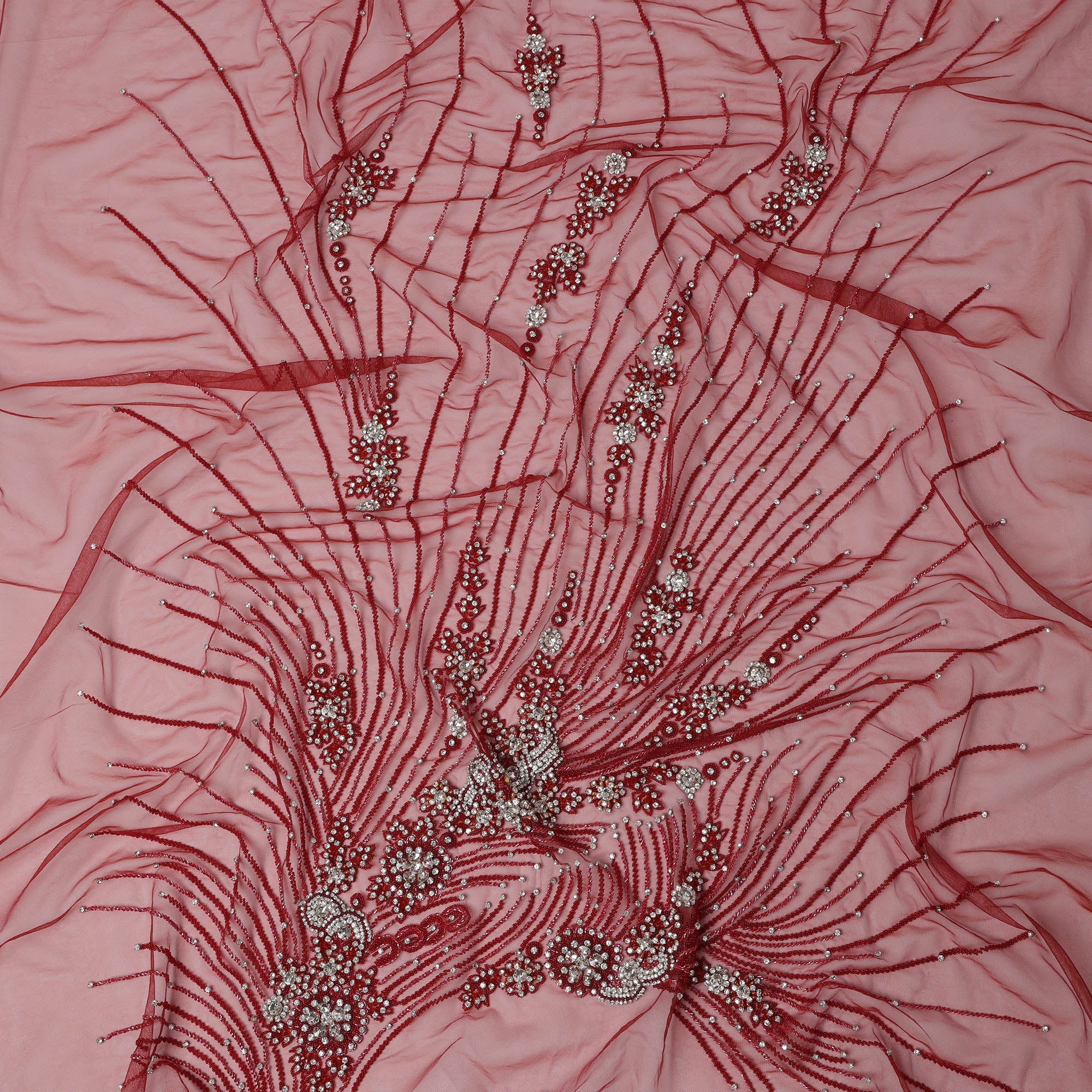 Wine Red Nylon Tulle with Radiating Sequin & Bead Embroidery, 140 cm Width, Made in India-D23516