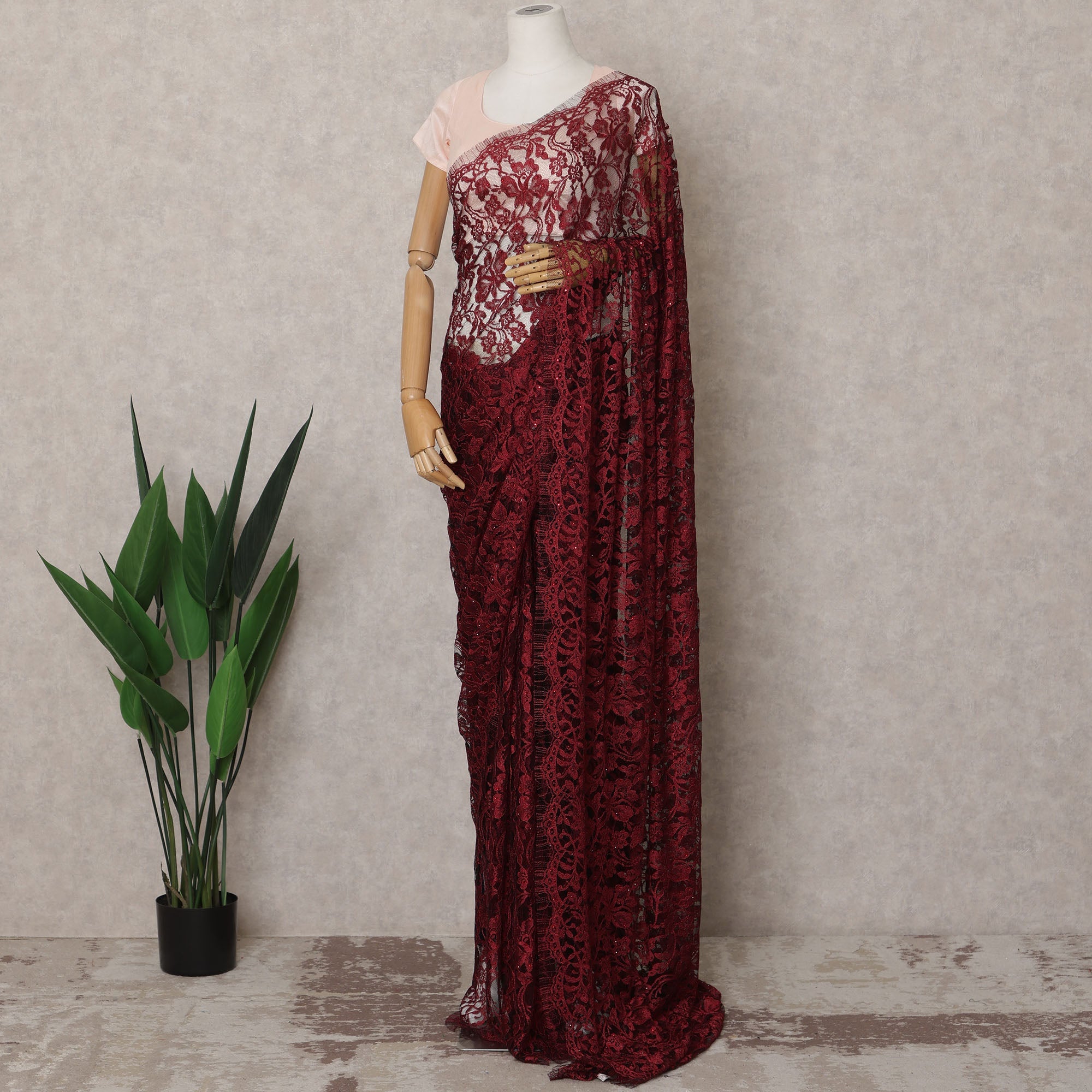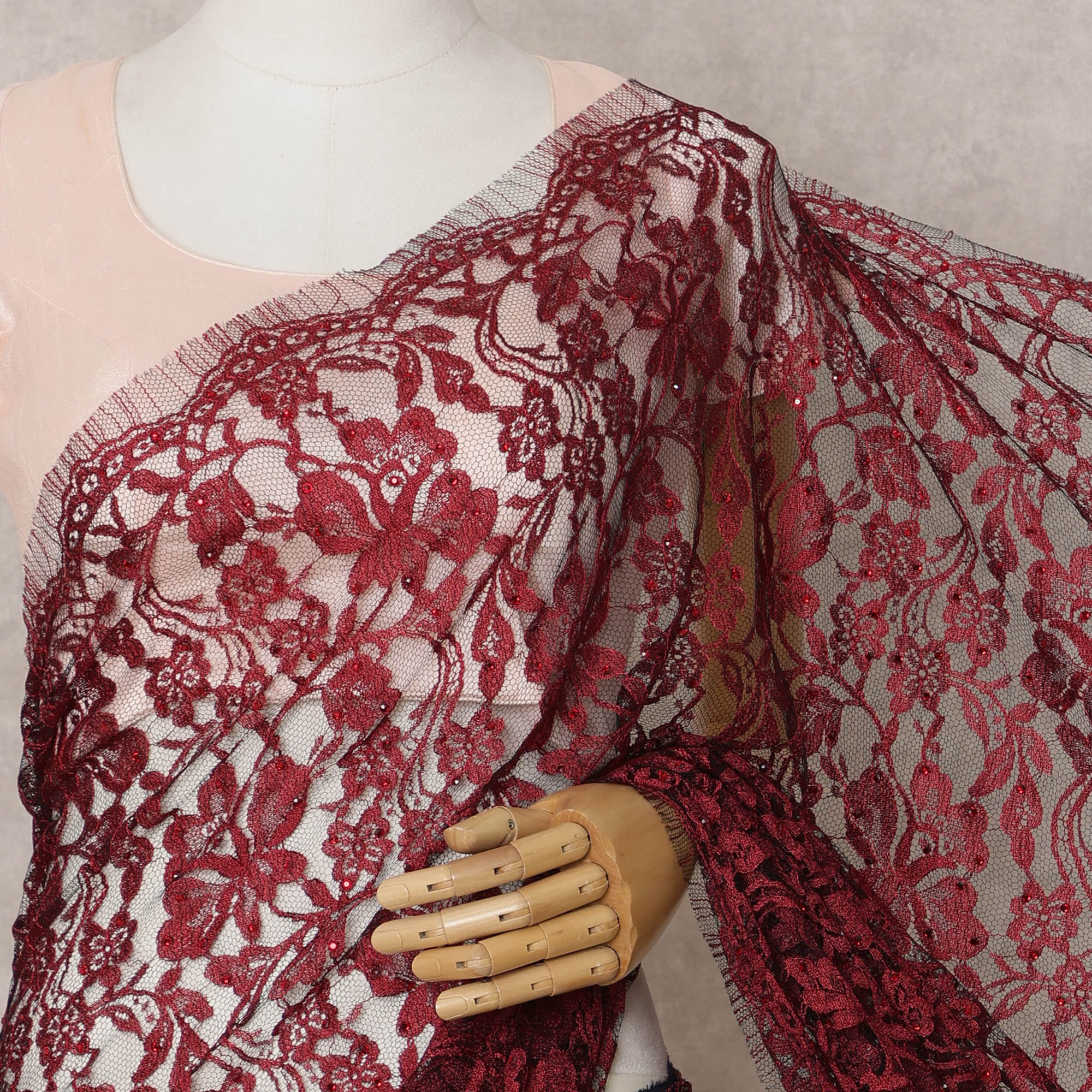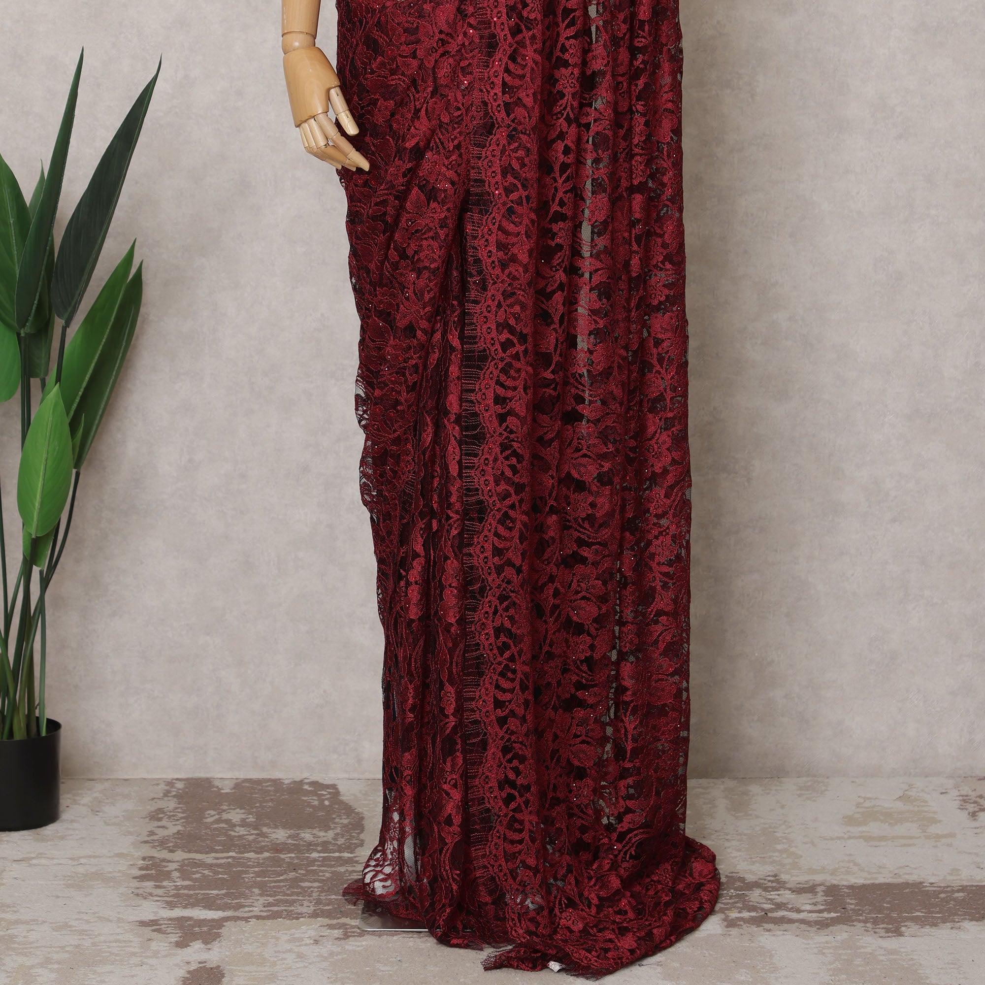 Wine Red Premium French 2-Tone Chantilly Lace Saree Fabric with Stone Work – 5.5 Meters Length & 110 Cms Width – Imported from France-D22945