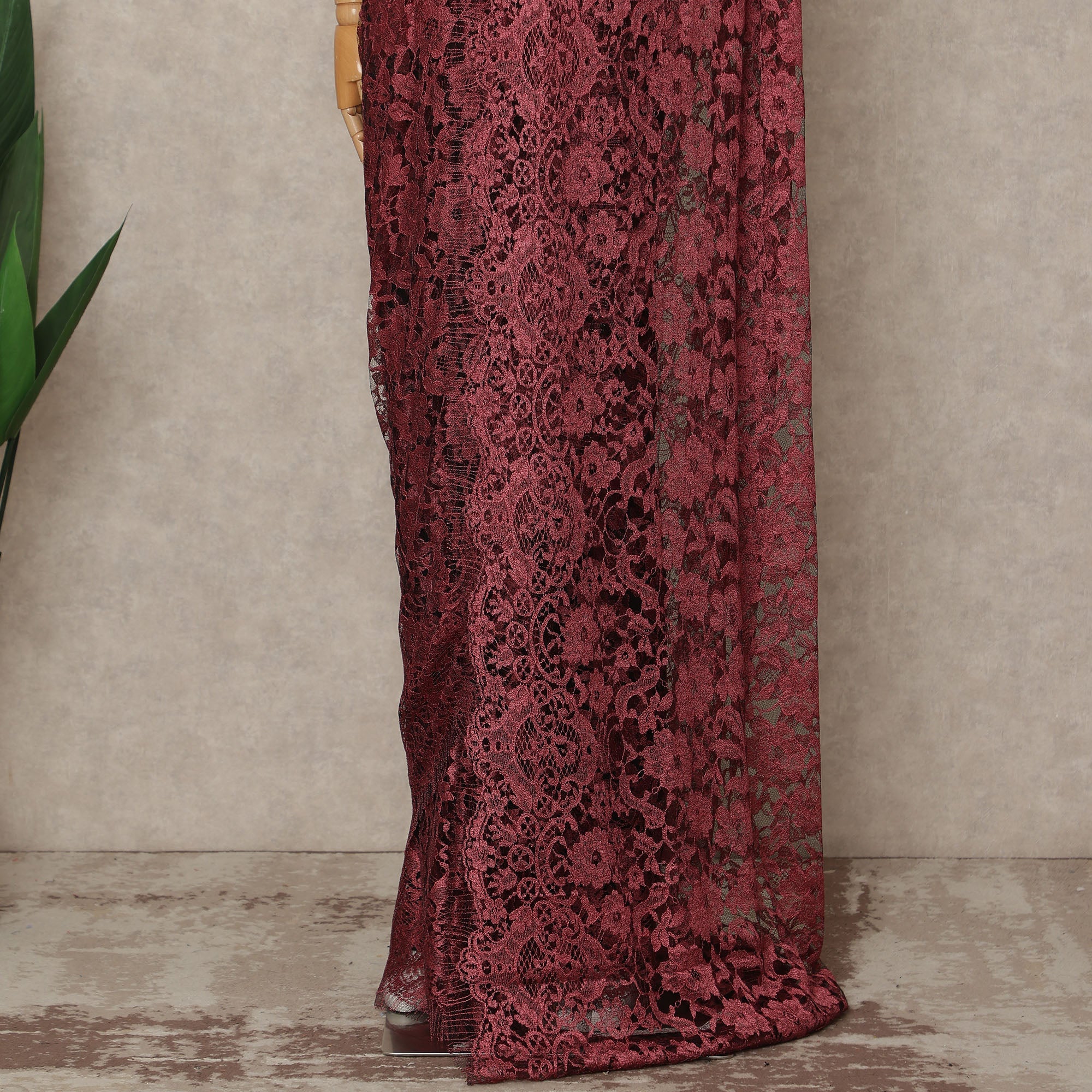 Wine Red Premium French Chantilly Saree Lace Fabric 5.5 Meters x 110 Cms Width Elegant Floral Net Material From France Unstitched Blouse Not Included-D28158