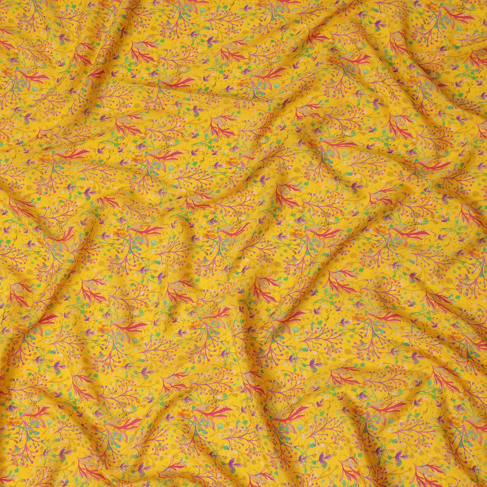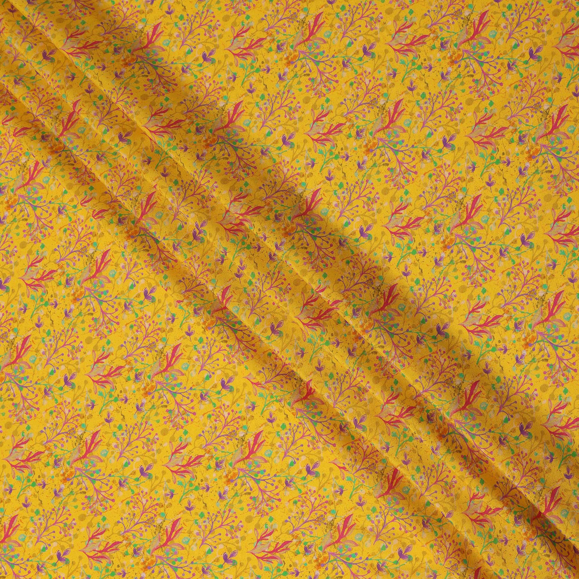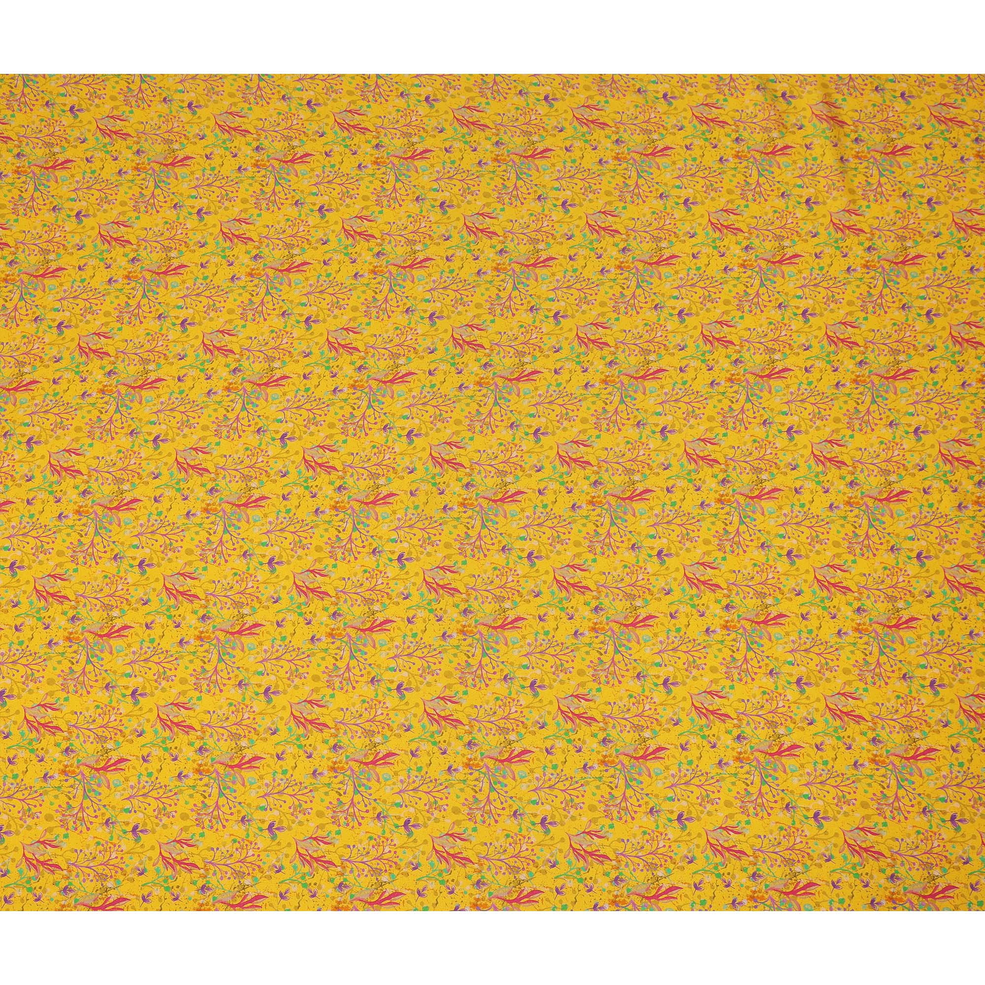 This yellow abstract leaf printed premium pure silk crepe fabric features a lively multicolor botanical vine design with shades of... Read more Read more
