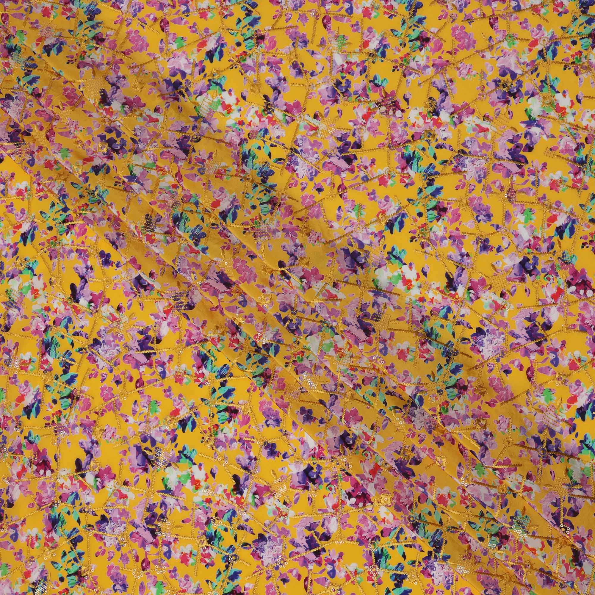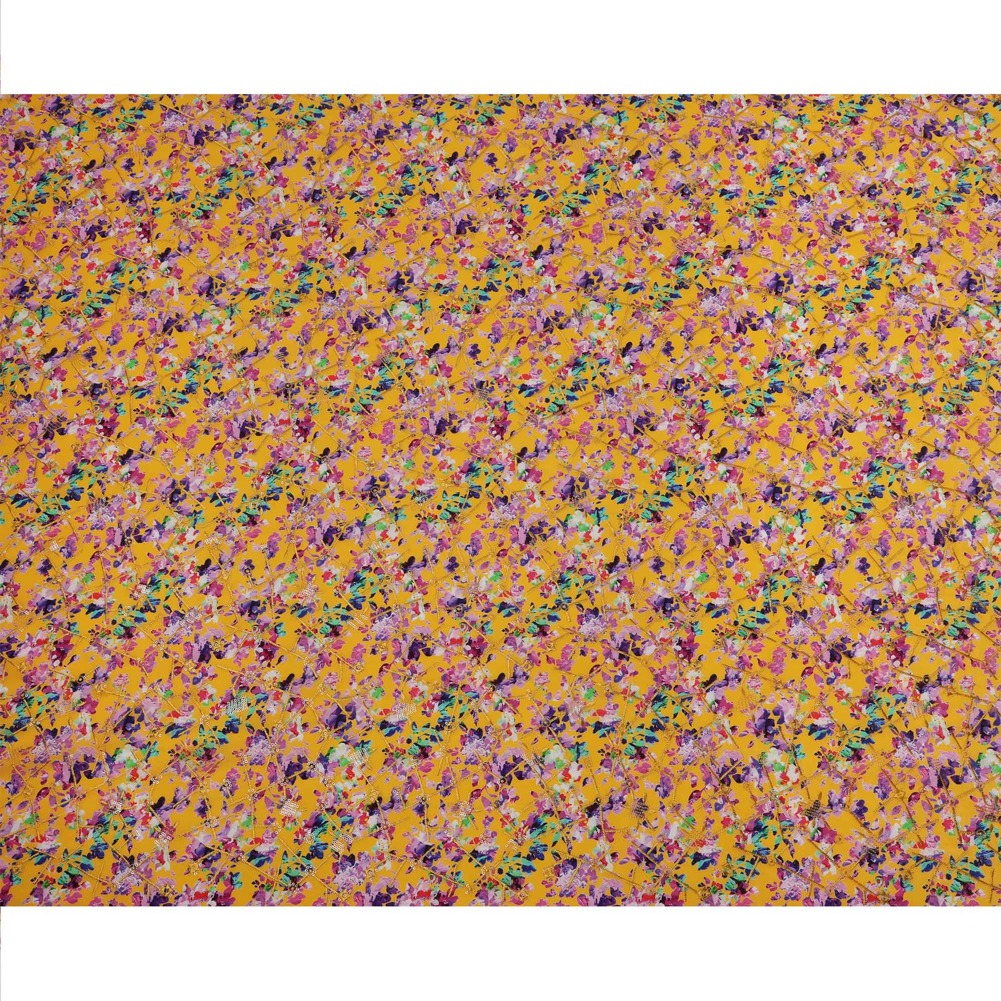 This radiant yellow base viscose crepe fabric showcases a vibrant digital print of abstract floral motifs in striking hues of... Read more Read more