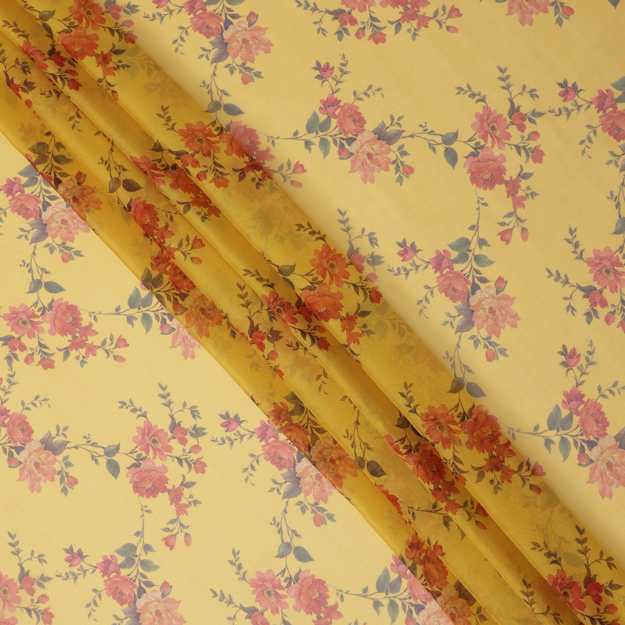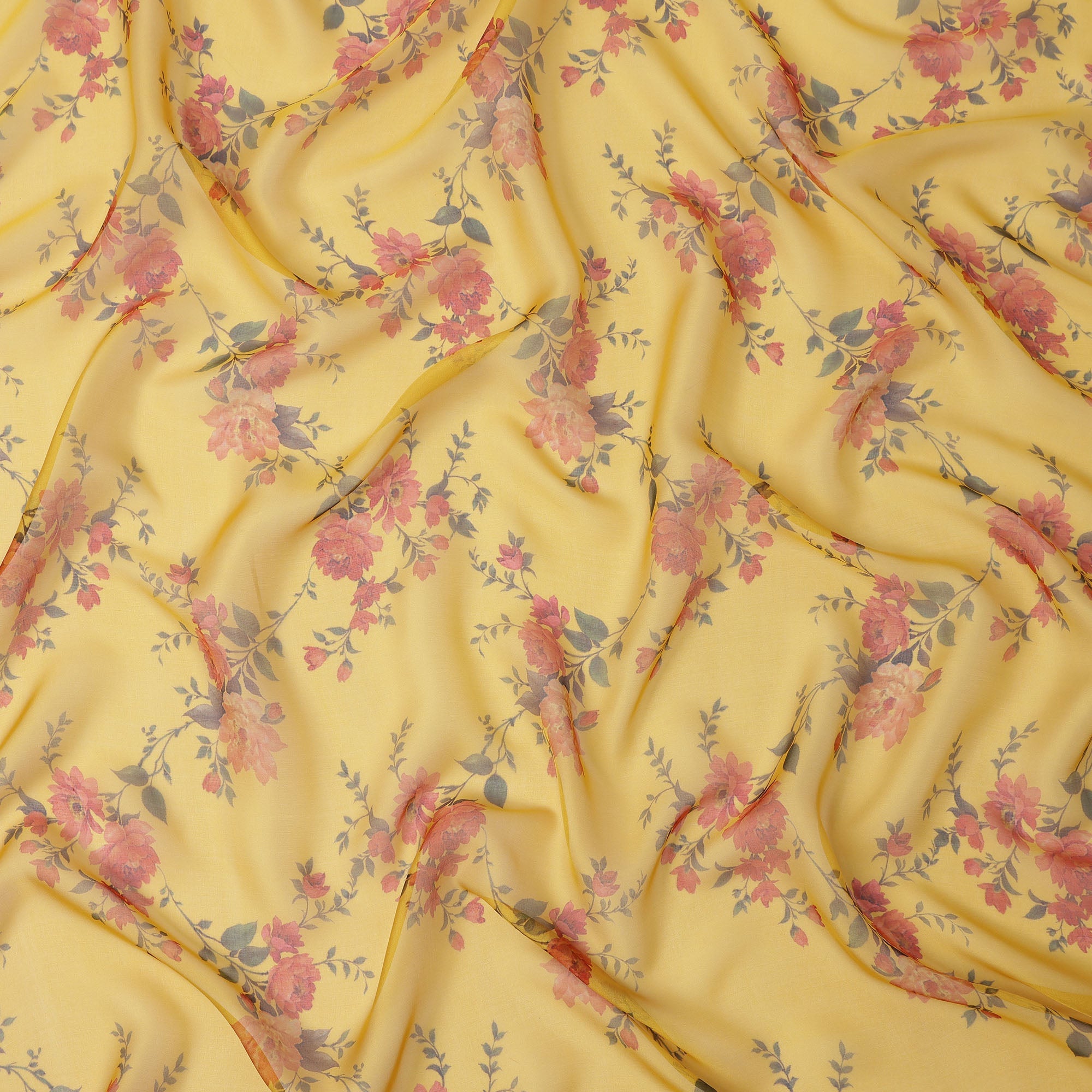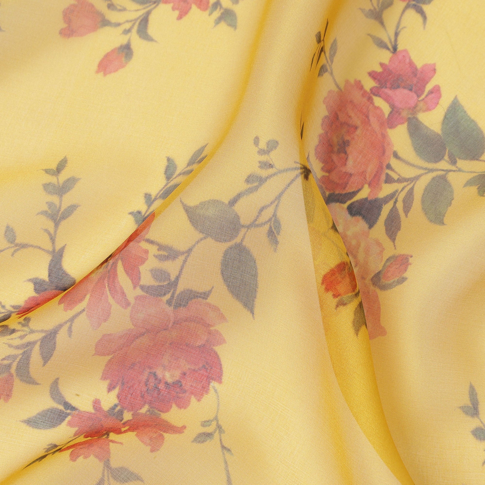 Yellow Base Vintage Rose Vine Printed Pure Silk Chiffon Fabric, 110 Cms Width, Made in South Korea-D24010