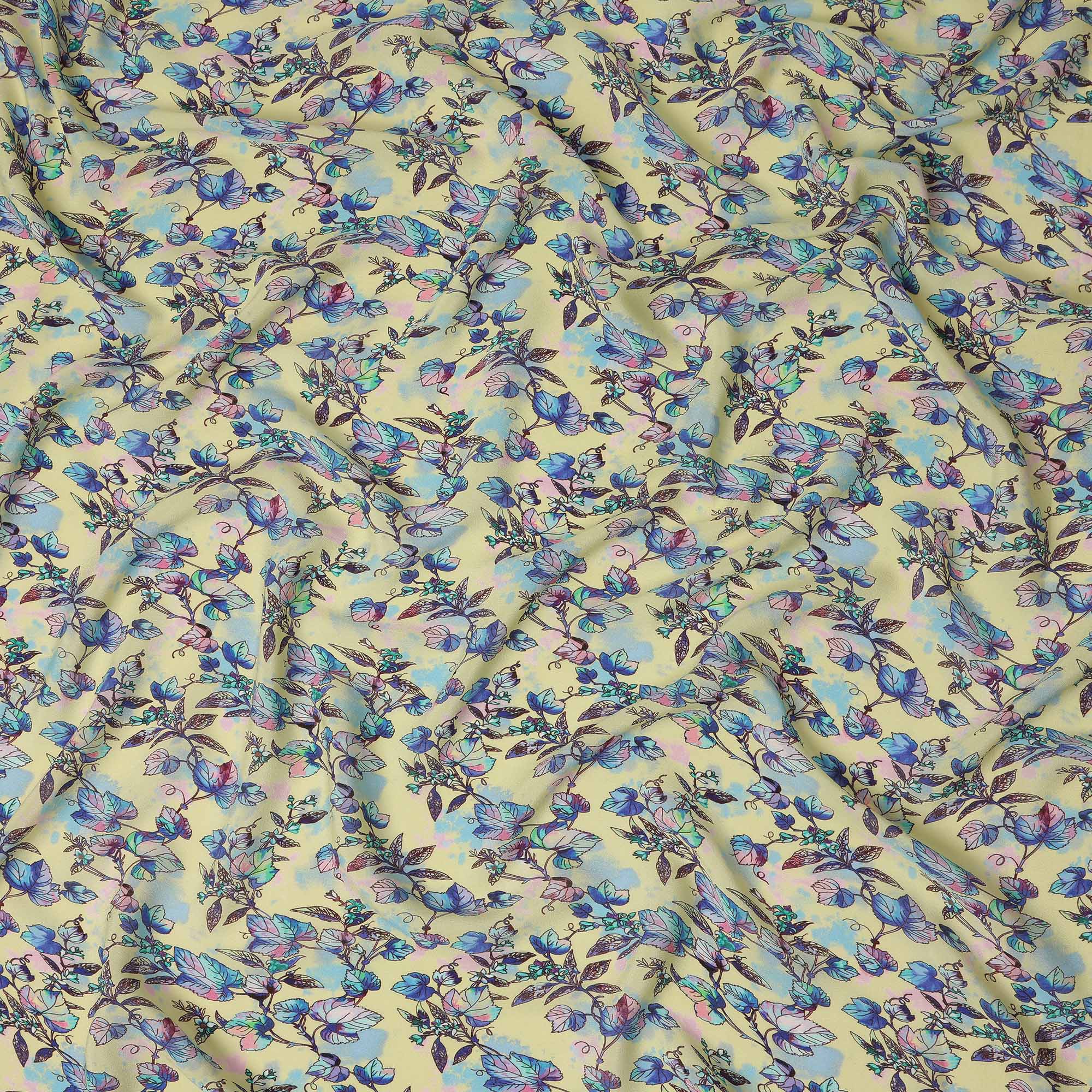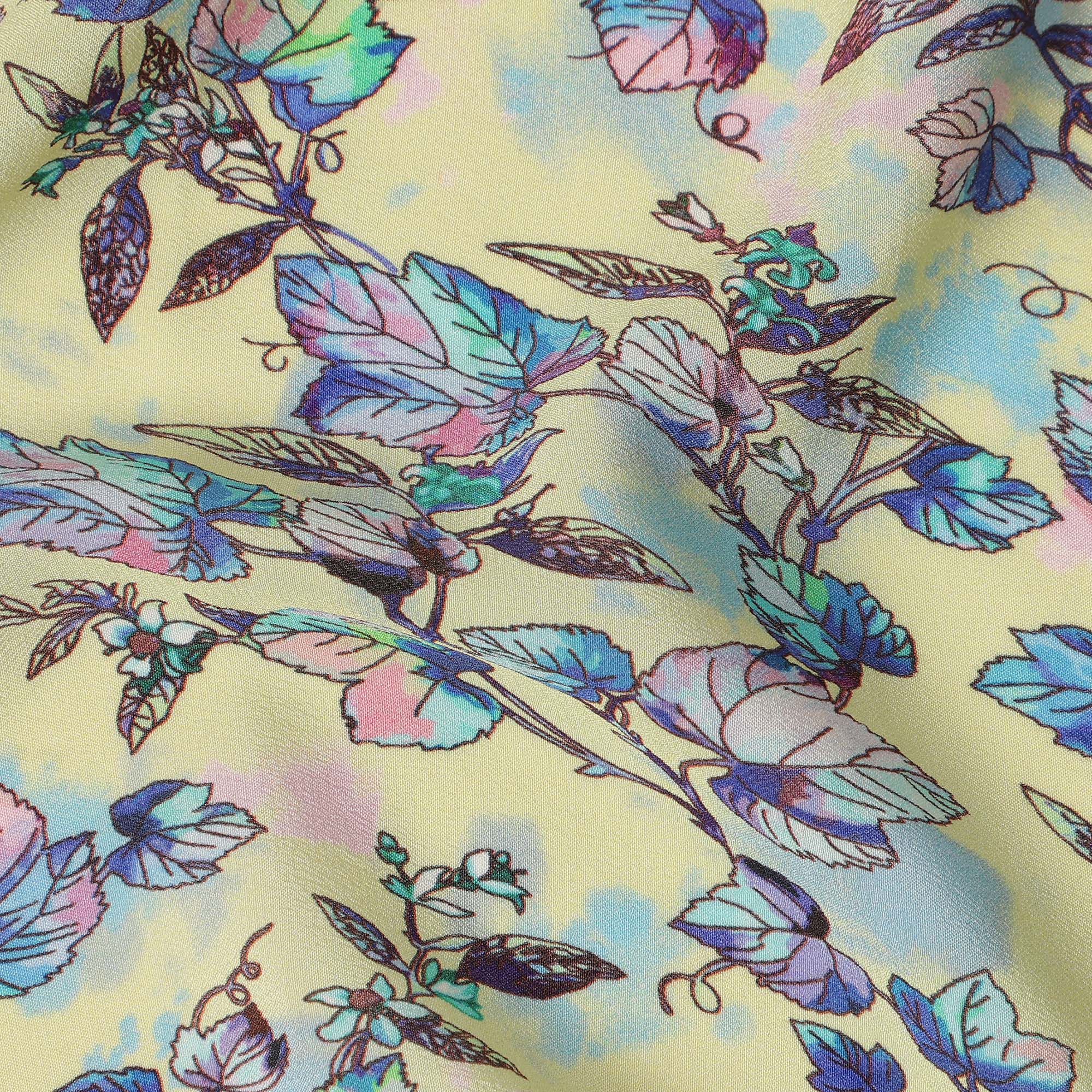 Yellow Floral Leaf Printed Premium Pure Silk Crepe Fabric Blue Botanical Vine Design Soft Lightweight Dress Material 110 Cms Width India-D28000
