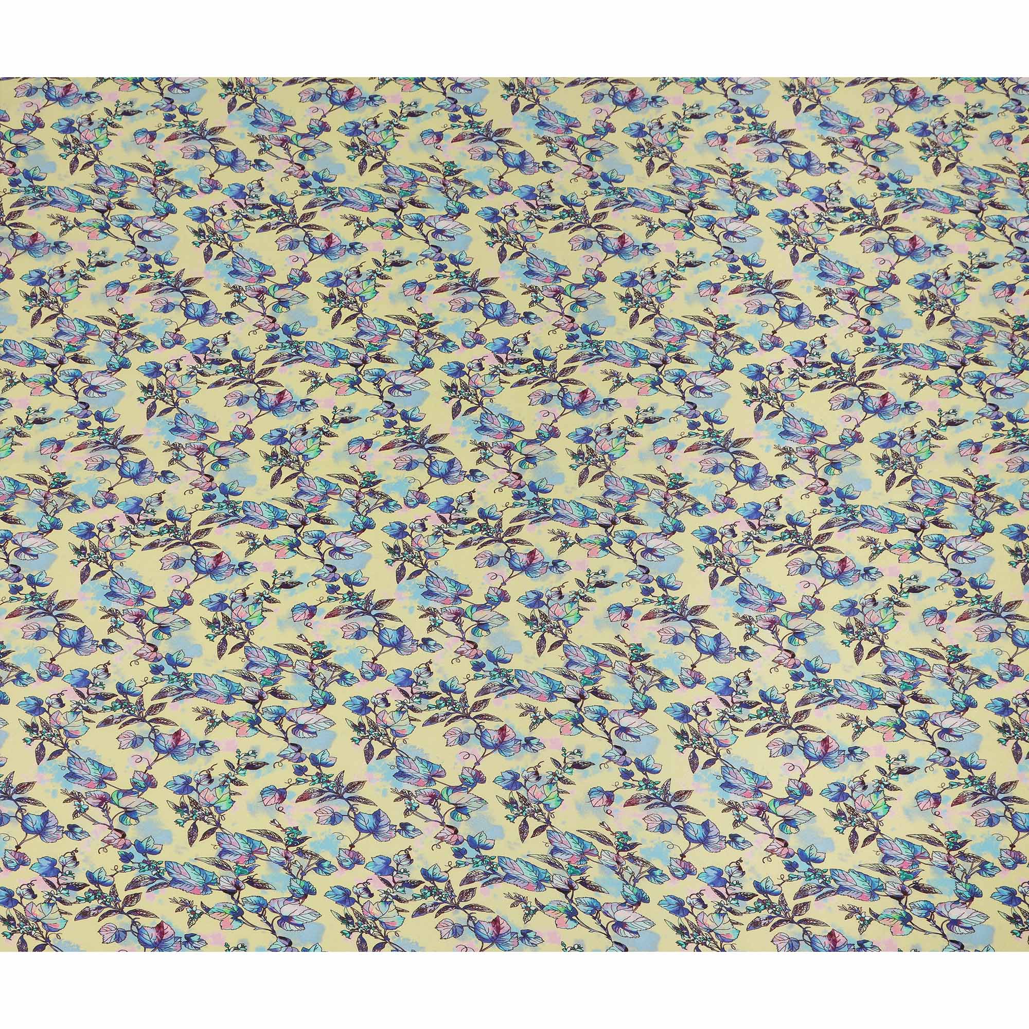 Pastel yellow base enhanced with blue floral leaf botanical print for fresh appeal