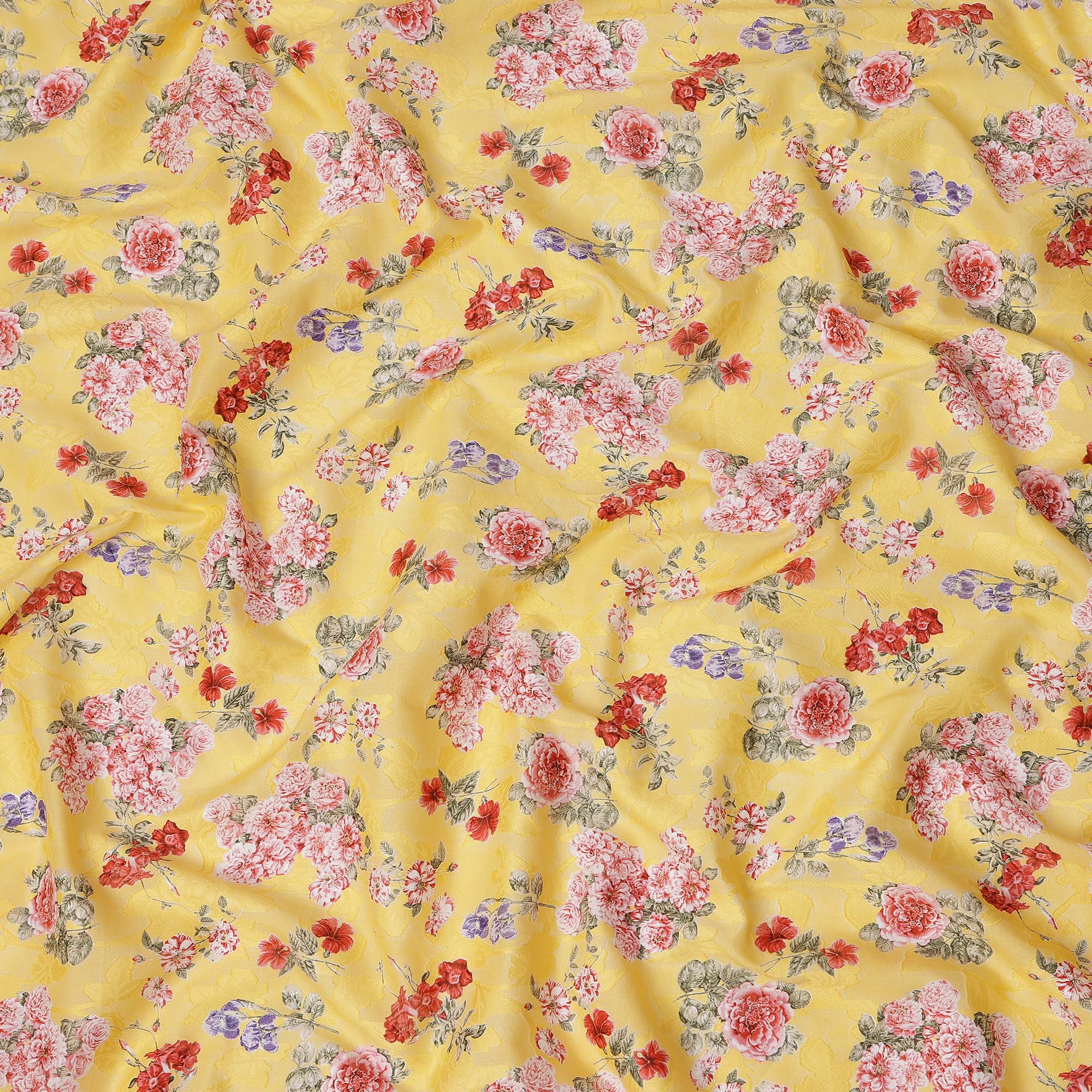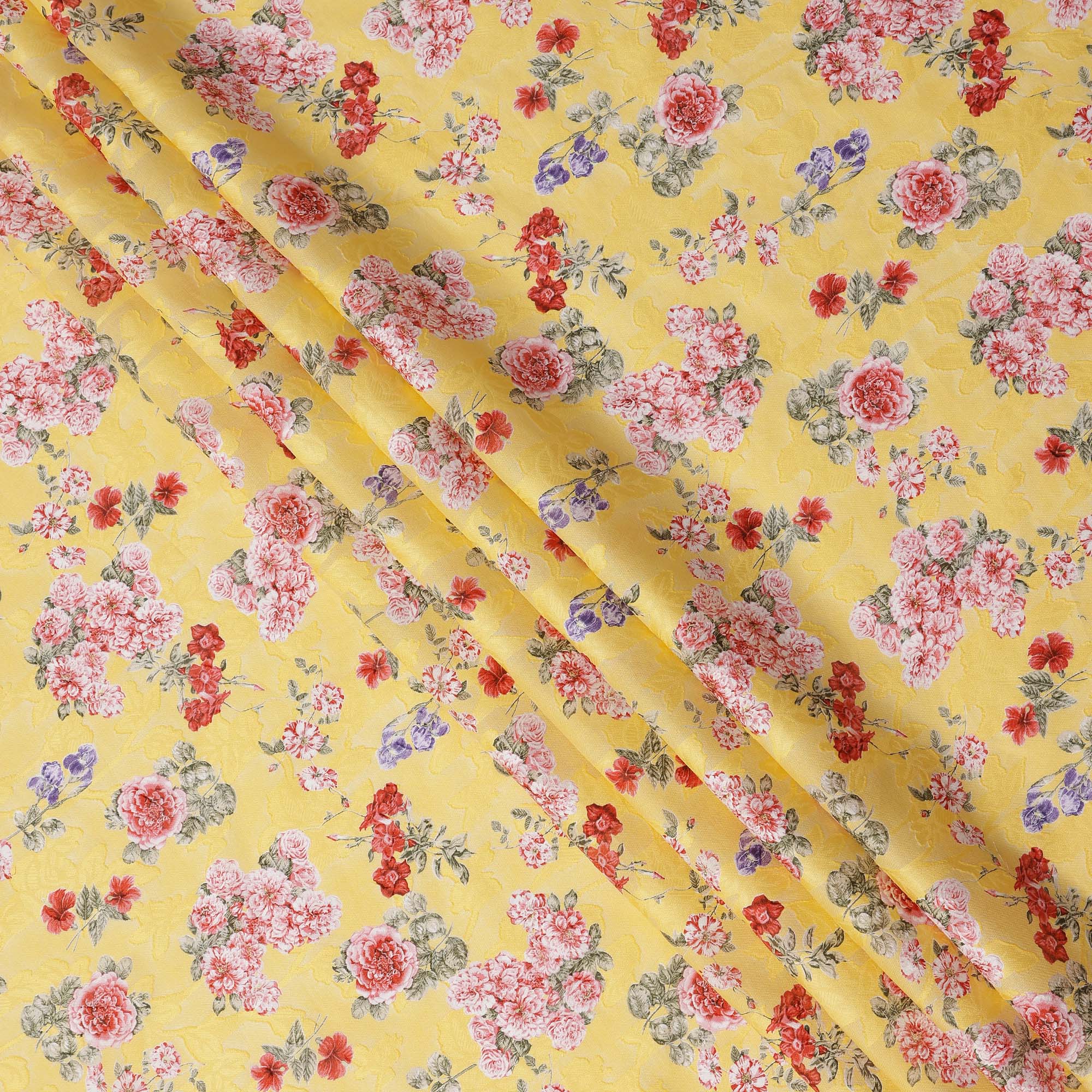 Bright, elegant, and refreshing, this Yellow Floral Printed Cotton Uragiri Voile Fabric from Japan is a delightful choice for creating stylish and comfortable attire. The cheerful yellow base is beautifully adorned with intricate floral designs featuring shades of red, pink, purple, and soft green, giving the fabric a lively and artistic charm. Made from premium cotton voile, it is lightweight, breathable, and soft, making it perfect for warm weather wear while ensuring lasting comfort. With a width of 110 cms, this fabric is versatile for designing sarees, kurtis, dresses, tops, and even unique home décor accents. The Uragiri weaving technique provides durability and enhances its smooth, elegant drape, making it suitable for both daily use and festive occasions. Its timeless floral pattern makes it an excellent choice for fashion enthusiasts who appreciate a mix of tradition and modern flair. Easy to maintain, this fabric retains its vibrancy and soft texture with gentle hand or mild machine wash. Shop online now to bring home the finesse of Japanese craftsmanship combined with the beauty of vibrant floral elegance.