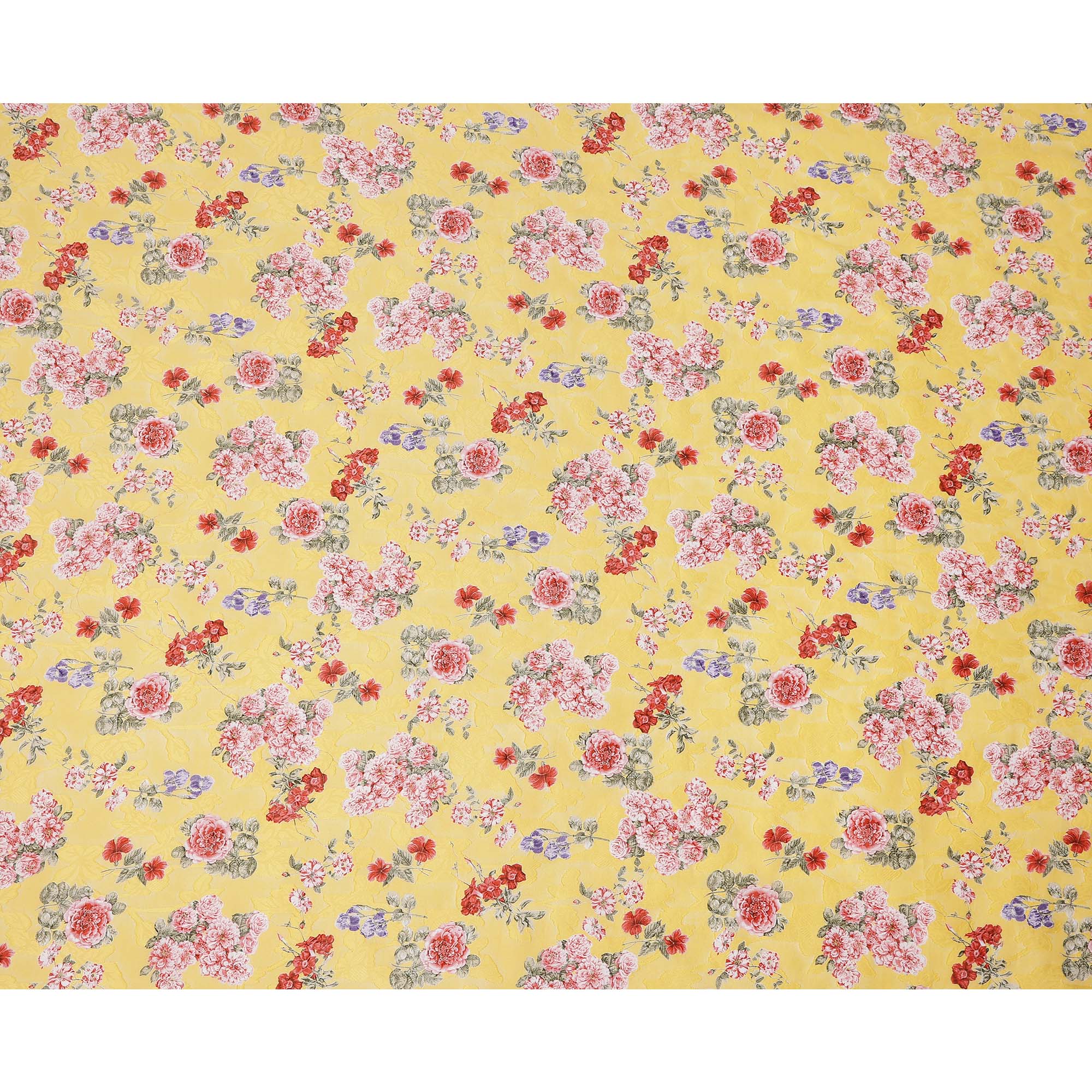 Cheerful yellow base with intricate floral prints in red, pink, and purple shades