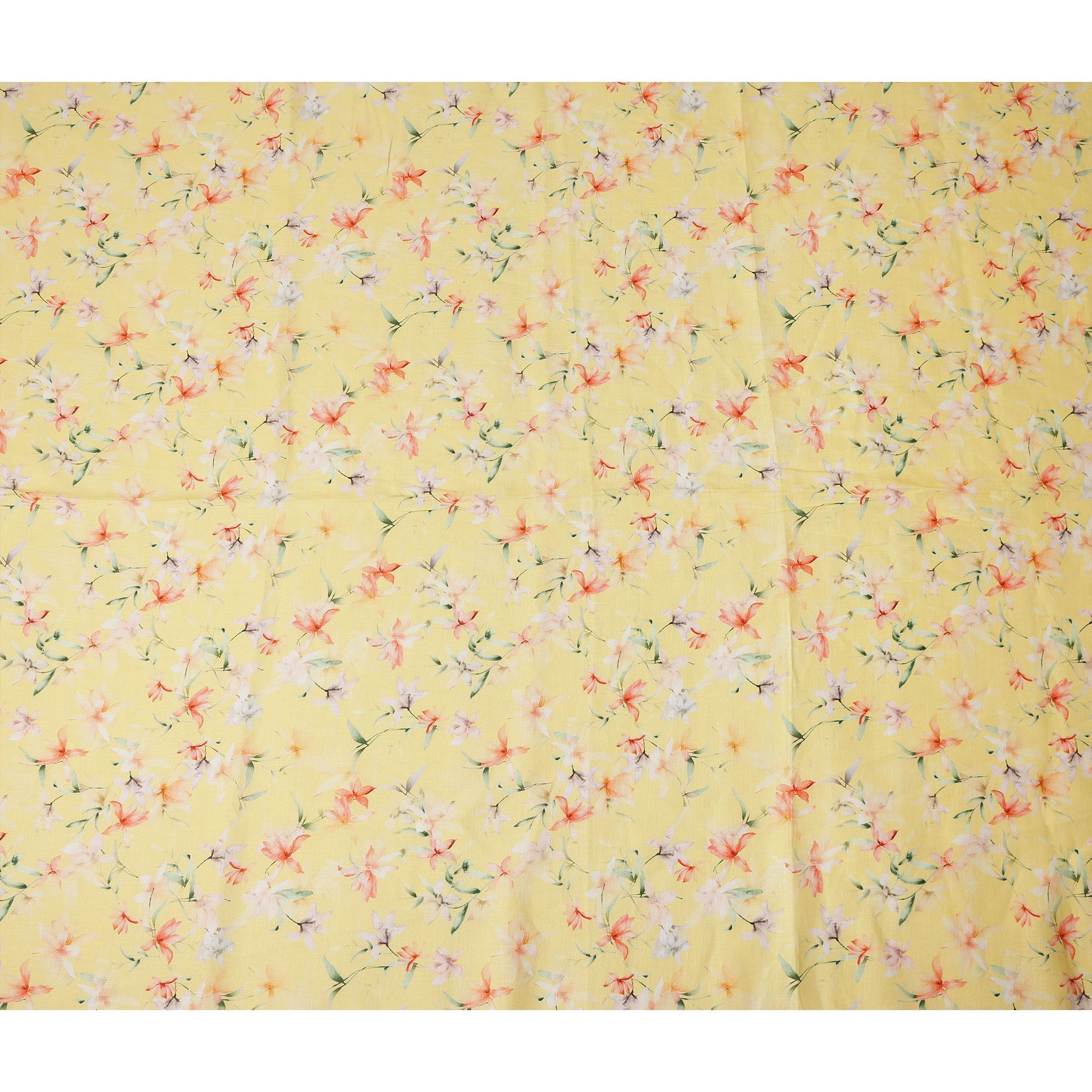 This yellow premium Pure Pure Linen printed fabric features a soft and refreshing multicolor floral design delicately scattered across a warm pastel yellow base. The graceful blend of peach, white, and subtle lavender blossoms with gentle green stems creates a light, airy aesthetic that feels both cheerful and elegant. Crafted in India, this premium Pure Pure Linen fabric offers natural breathability, durability, and a beautifully textured surface that enhances its refined appeal. Ideal for dresses, tunics, tops, skirts, and stylish home décor accents such as cushions and curtains, the fabric drapes gracefully while maintaining structure. With its smooth hand feel and versatile 140 cms width, it provides comfort and sophistication for timeless and contemporary creations alike.