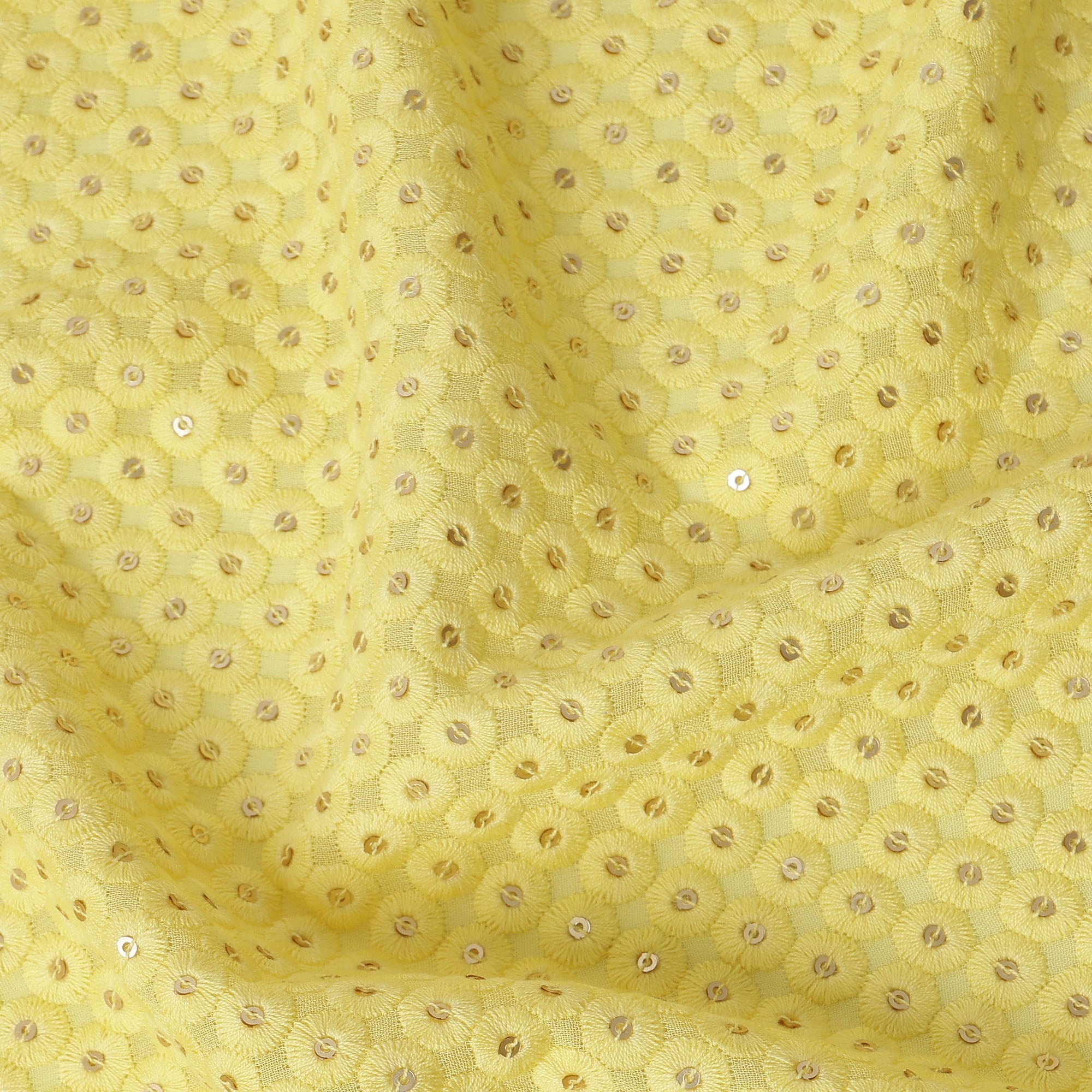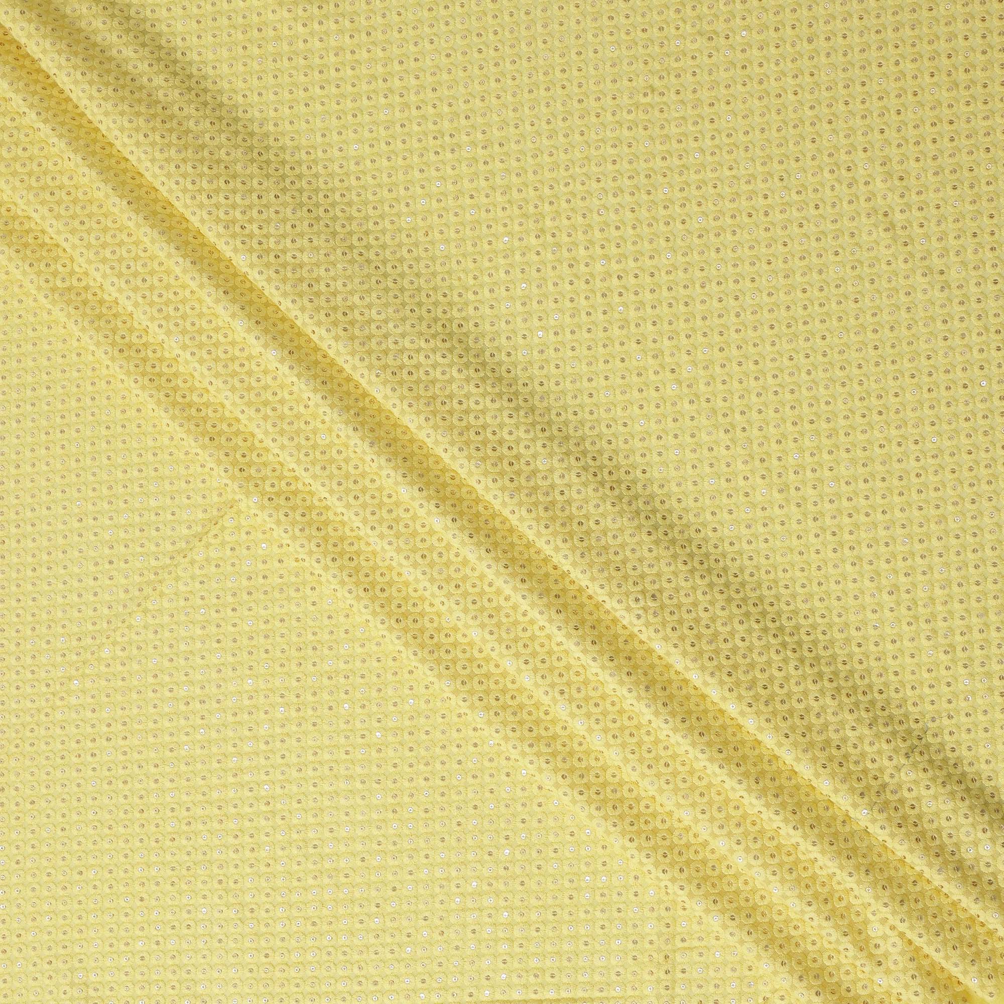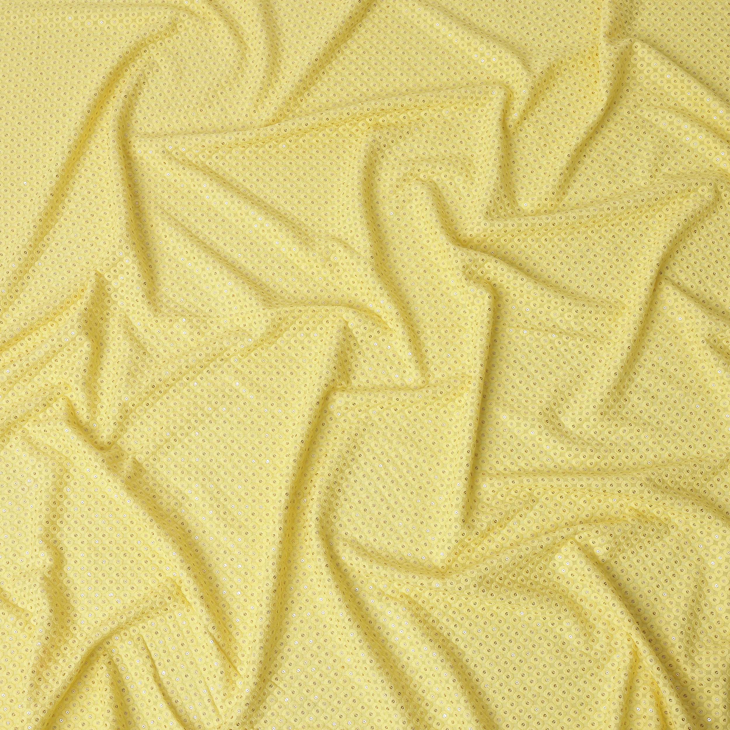 Yellow Sequin Embroidered Polka Dot Pattern Synthetic Viscose Fabric, 110 Cms Width, Made in India-D26378
