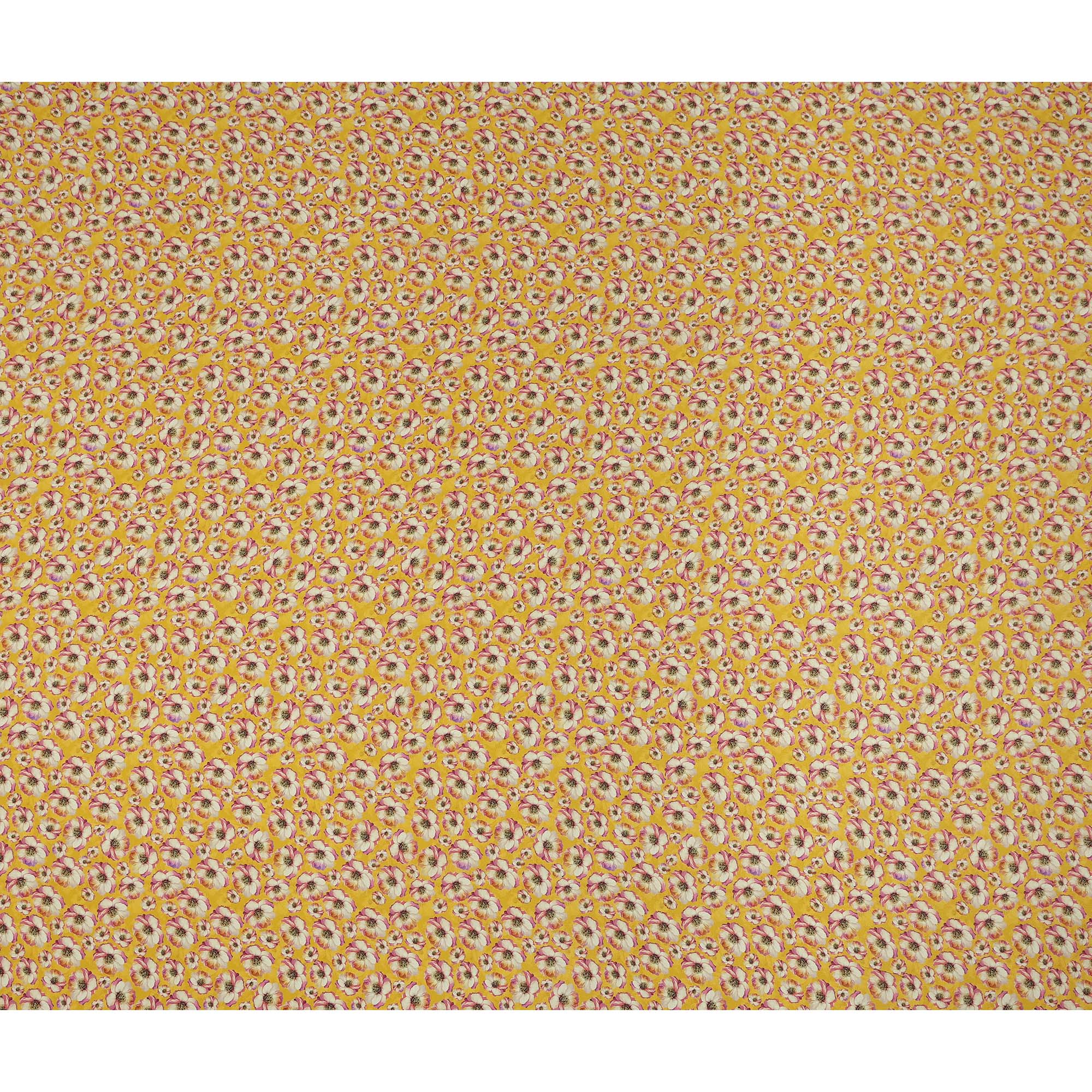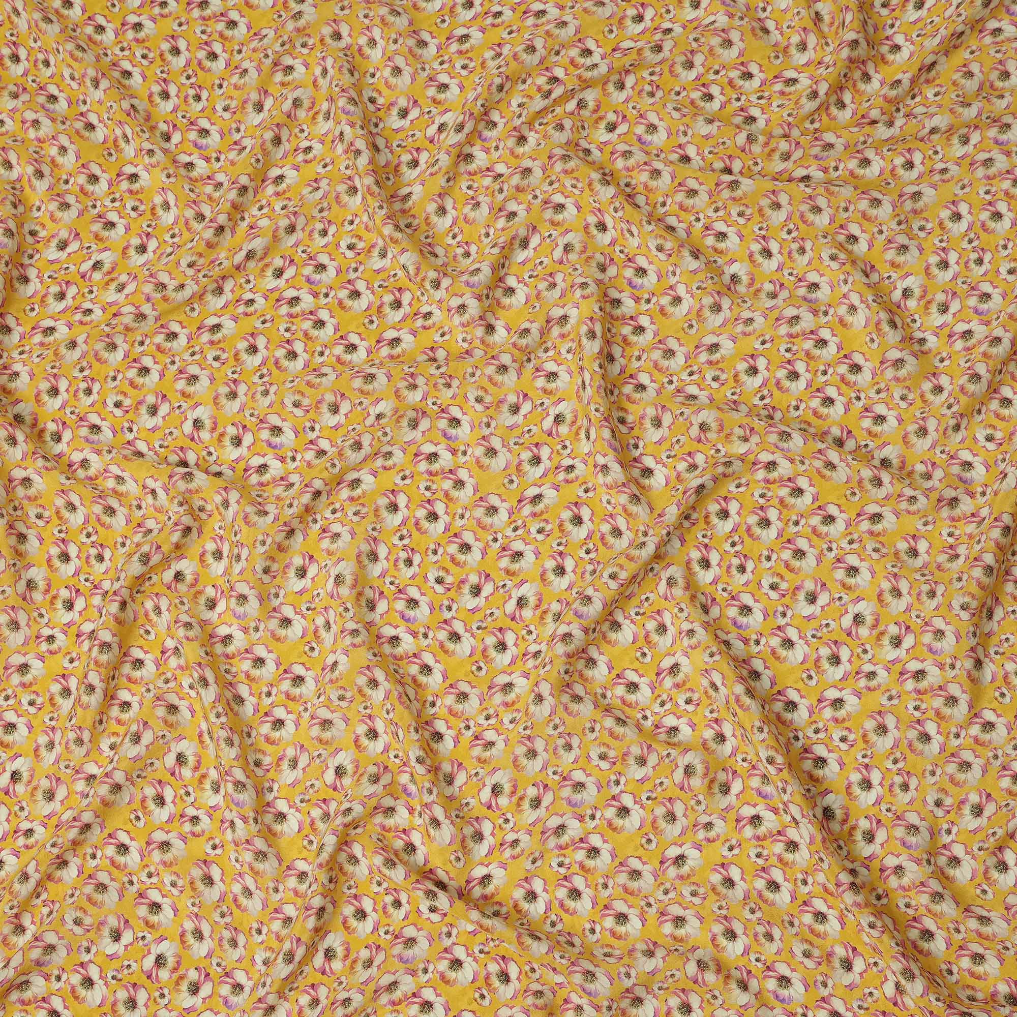 This yellow small floral printed premium pure silk crepe fabric showcases a charming delicate blossom design scattered gracefully across a vibrant yellow base. Crafted from high quality pure silk crepe, it offers a luxuriously smooth texture with a soft hand feel and an elegant fluid drape that enhances both tailored and flowy silhouettes. The lightweight and breathable nature of the fabric ensures all day comfort, making it ideal for dresses, blouses, skirts, scarves, and refined ethnic wear. With a width of 110 cms, it provides ample scope for creative tailoring and designer projects. Perfect for boutiques, designers, and sewing enthusiasts, this fabric blends cheerful color with intricate floral detailing to create timeless garments suited for casual chic styles and festive occasions.